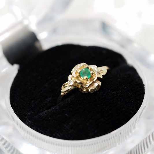 Vintage 1970s Emerald and 10k Yellow Gold Solitaire Flower Ring Size 6