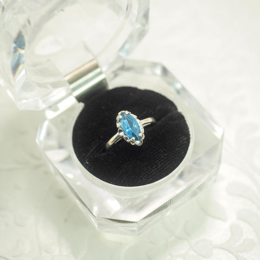 Vintage 1970s Marquise Blue Lab Created Spinel and 10k White Gold Solitaire Ring Size 6.25