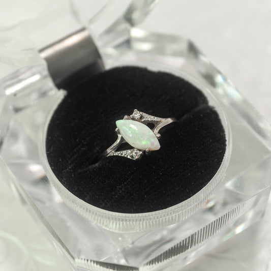 Vintage 1970s Marquise-Cut Opal Cabochon, Diamond, and 10k White Gold Ring Size 6.25