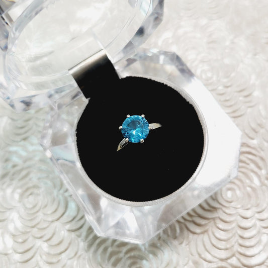Vintage 1970s SABRINA Greenish Blue Lab Created Spinel and 10k White Gold Solitaire Ring Size 5