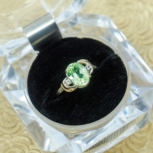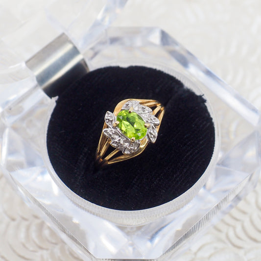 Vintage 1980s Oval Cut Green Peridot, Diamond, and 10k Gold Ring Size 7.25