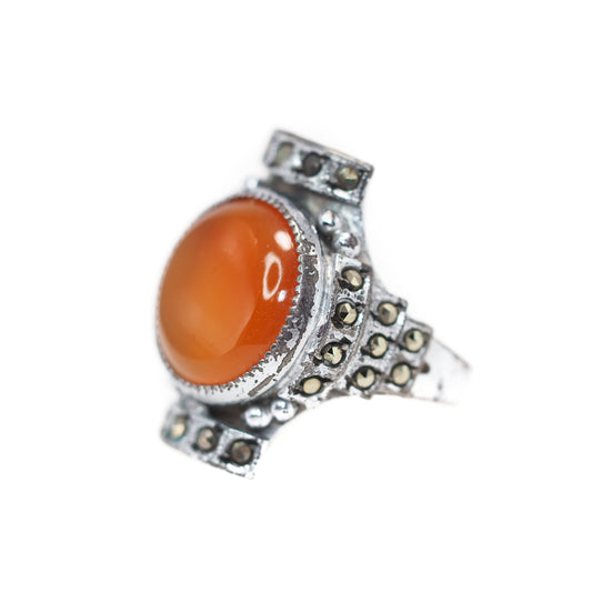 Vintage 1930s Art Deco Orange Carnelian Cabochon, Marcasite, and Sterling Plate Ring Size 5