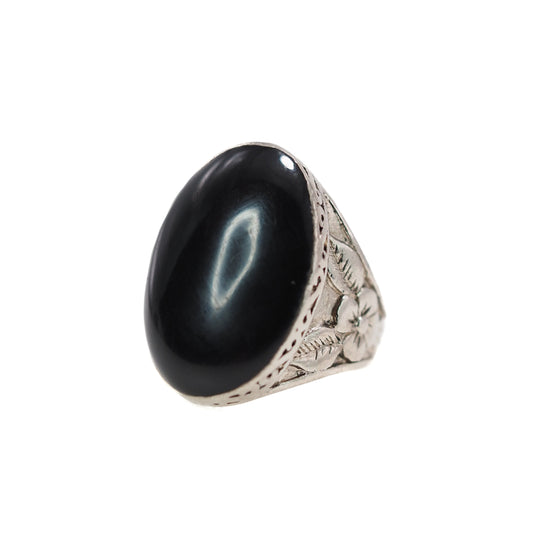 Vintage 1970s Imitation Black Onyx, Silver Plate Flower Cabochon Unisex Ring Size 5.5