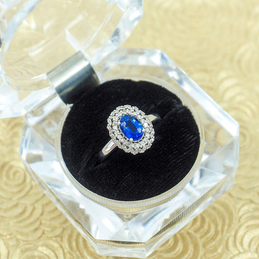 Vintage 1990s Oval Cut 1.08-Carat Natural Blue Kyanite, Diamond Double Halo, and 14k Ring Size 7.25