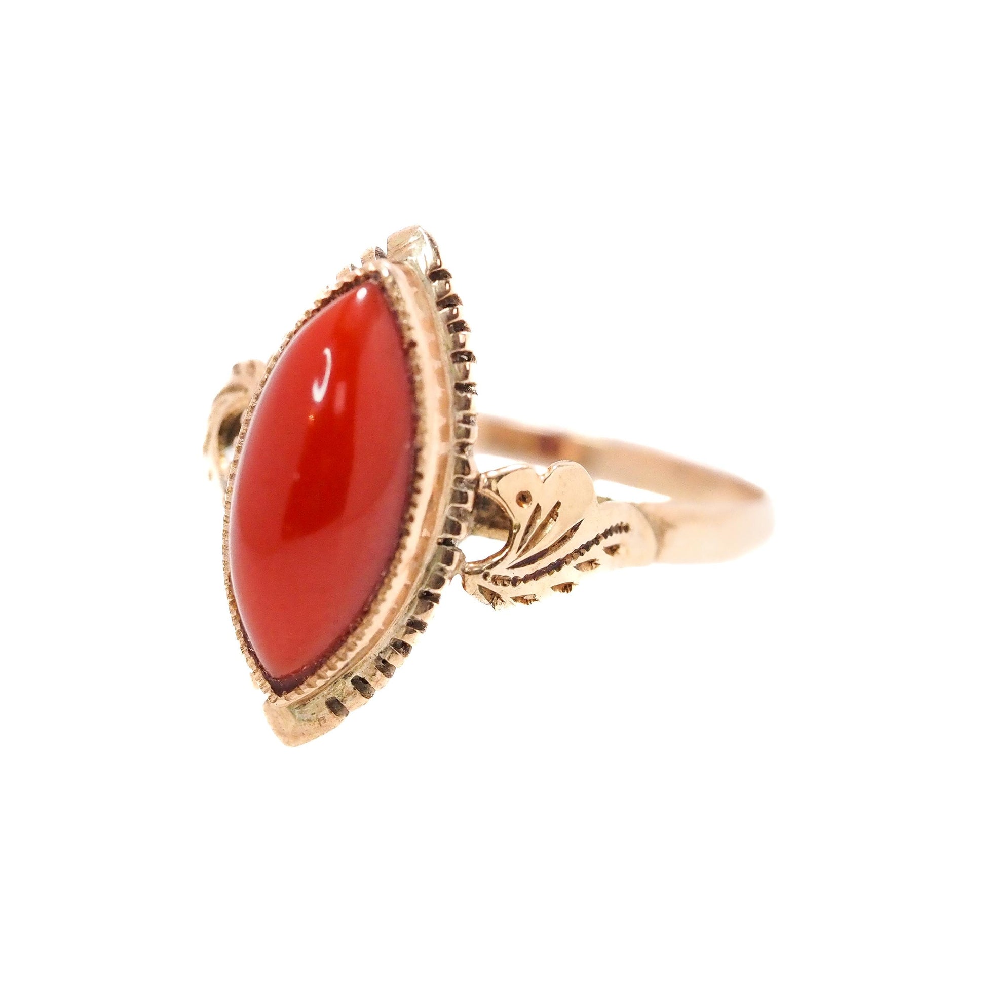 Antique 1860s Mid-Victorian Red Marquise Sardinian Coral and 18k Yellow Gold Ring Size 6.25