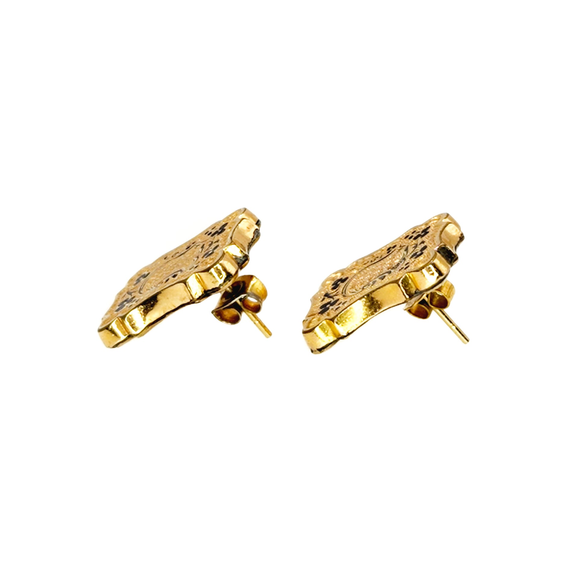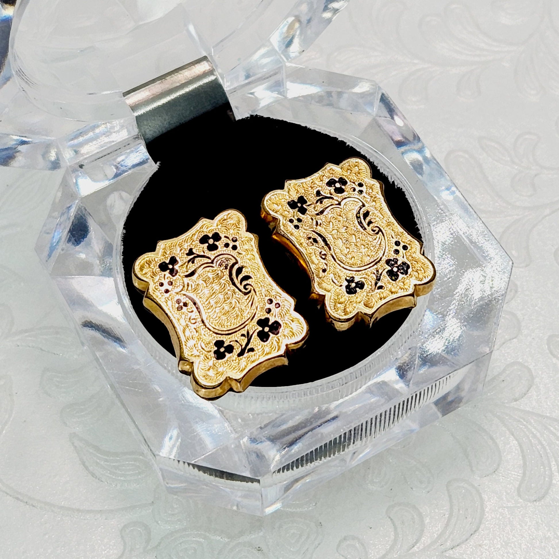 Crafted in the 1870s, these ornate mourning earrings are made from yellow rolled gold and black enamel. The enameling technique is called Taille d‘Épargne (from French: taille = "engraving"; épargner = "to save"). The scrolling enamel looks like vines and flowers. These earrings were turned from cufflinks and are lovely large stud earrings to add to your collection!