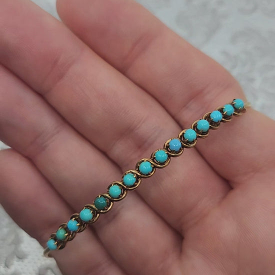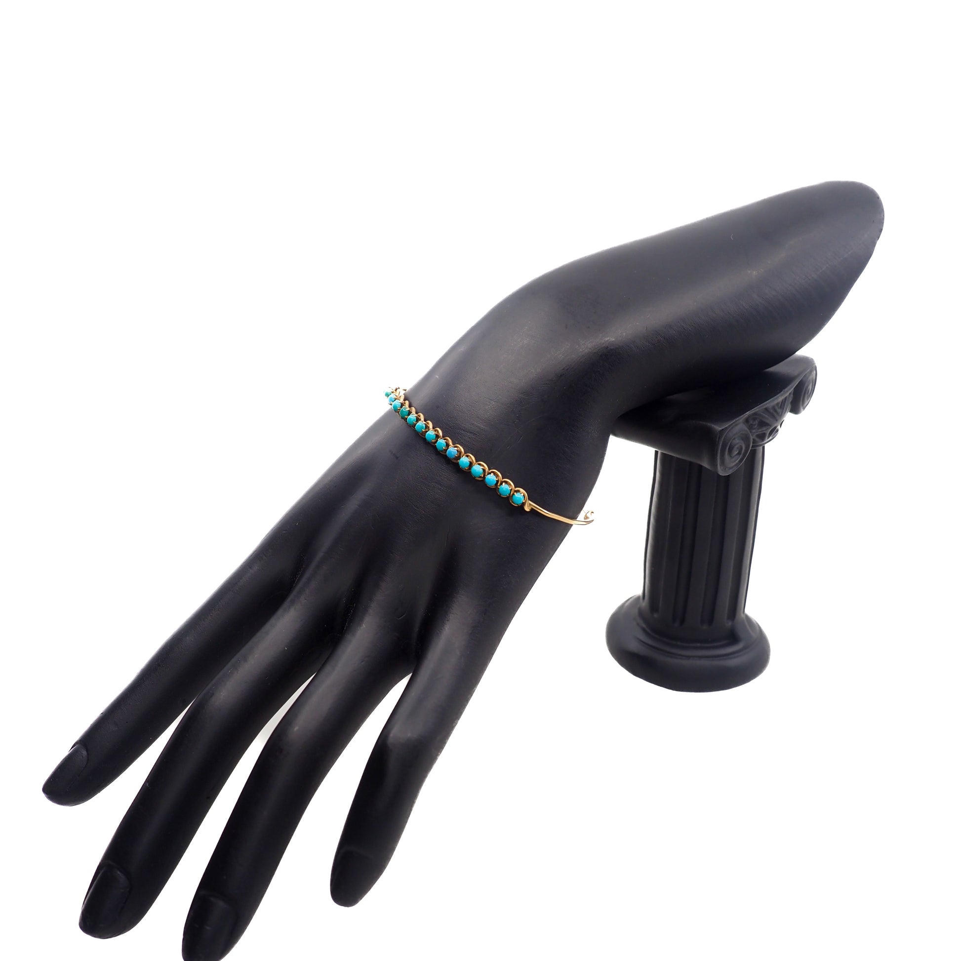 The bangle is in very good to excellent antique condition with minor signs of wear. The surface of the gold and stones has fine lines under magnification, but nothing is visible or noticeable. The stones are all securely set and do not wiggle. The prongs are a little worn, and there are a few tiny chips in the turquoise. There are no marks or stamps, and the metal tested at 18K.