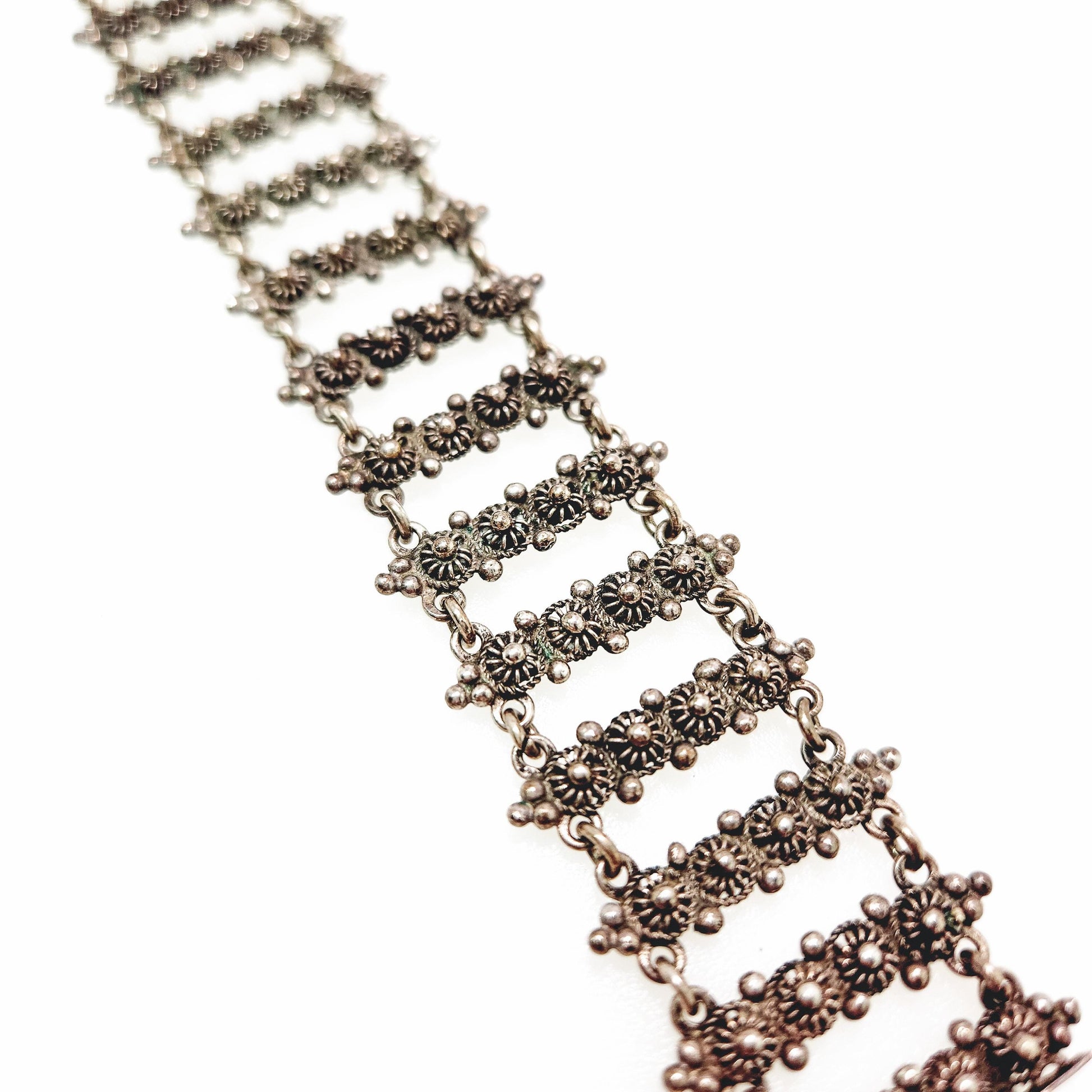 This stunning silver bracelet, made during the mid-Victorian era, features decorative links. This Grand-era piece features an elegant Etruscan revival cannetille design, and the links keep the bracelet comfortably on your wrist. It's a wonderful antique bracelet to add to your collection.