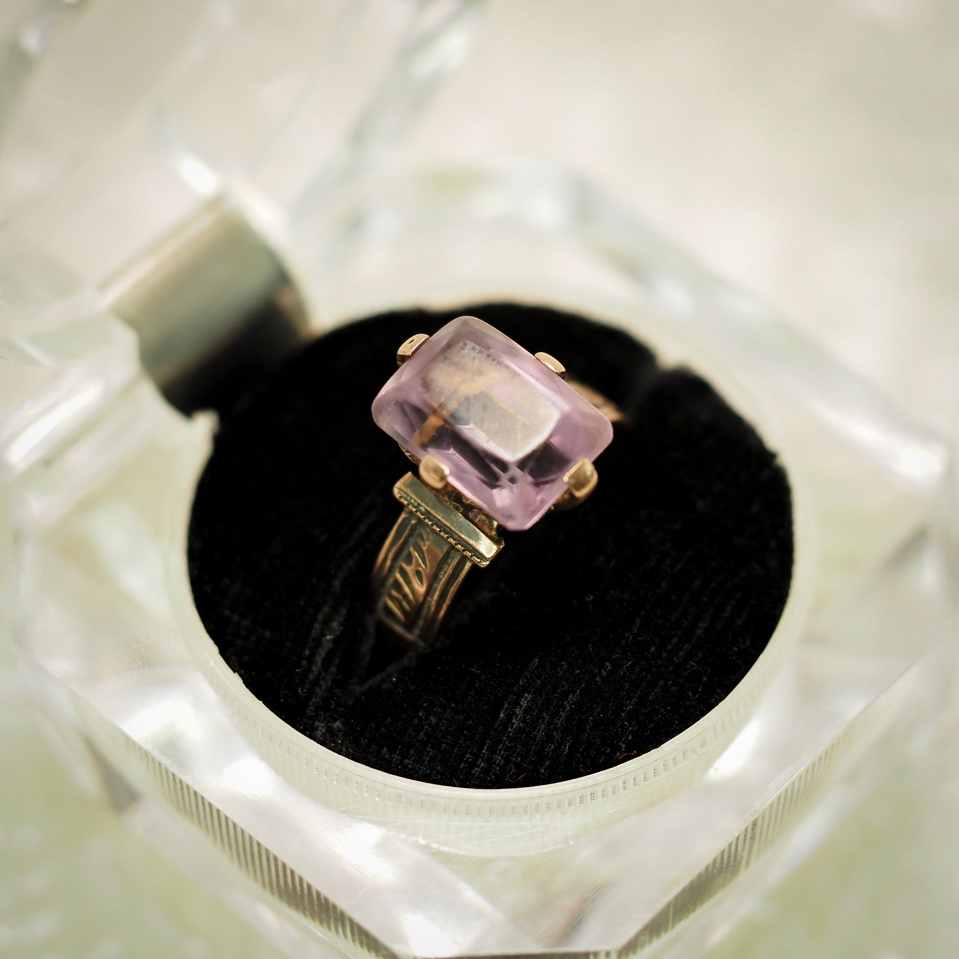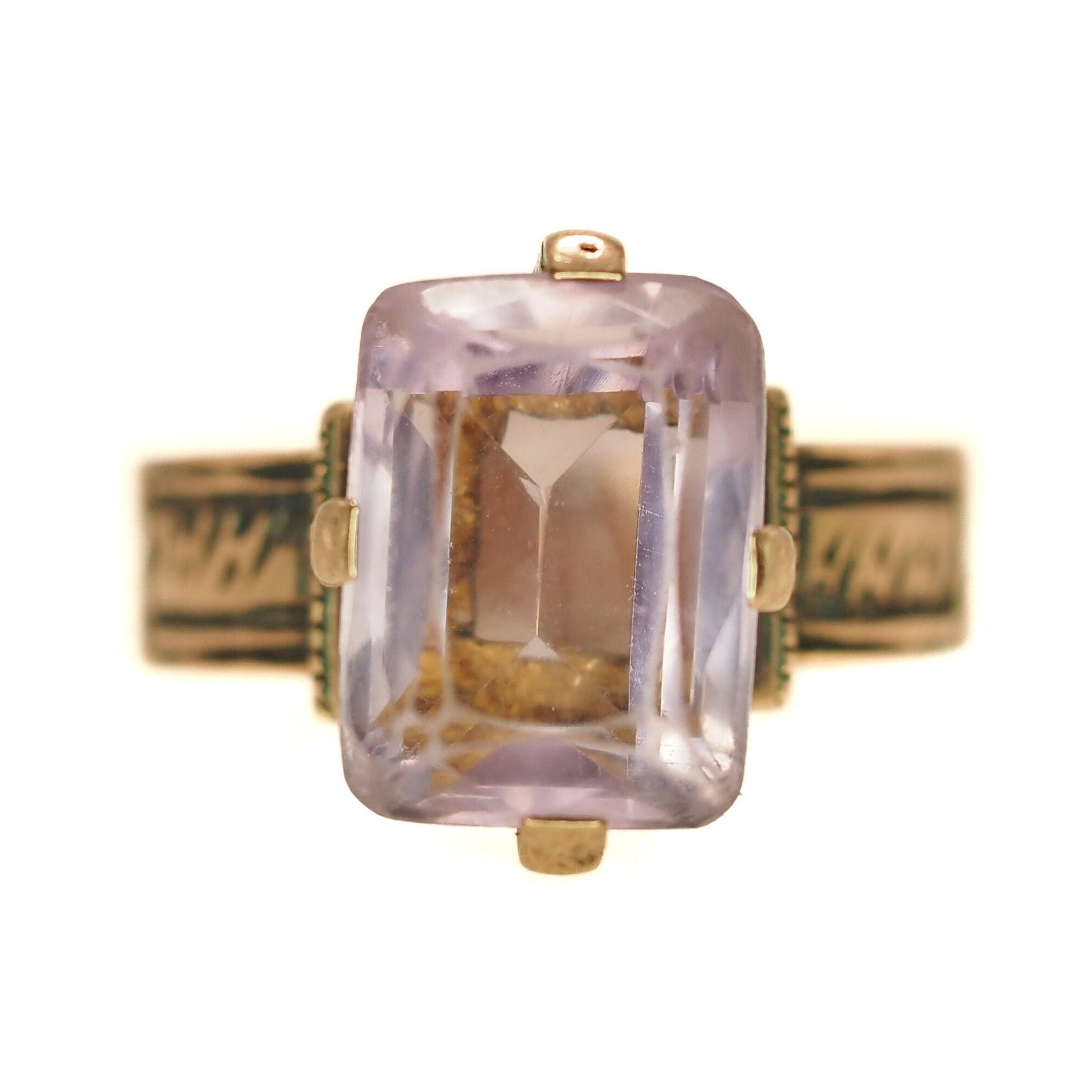 Step back in time with this exquisite late Victorian 5.50-carat radiant-cut light purple amethyst ring, a true treasure from the 1880s. Crafted from etched 10K rose gold, this remarkable piece showcases the elegance and charm of the Victorian era. A beautiful antique ring for a February birthday!