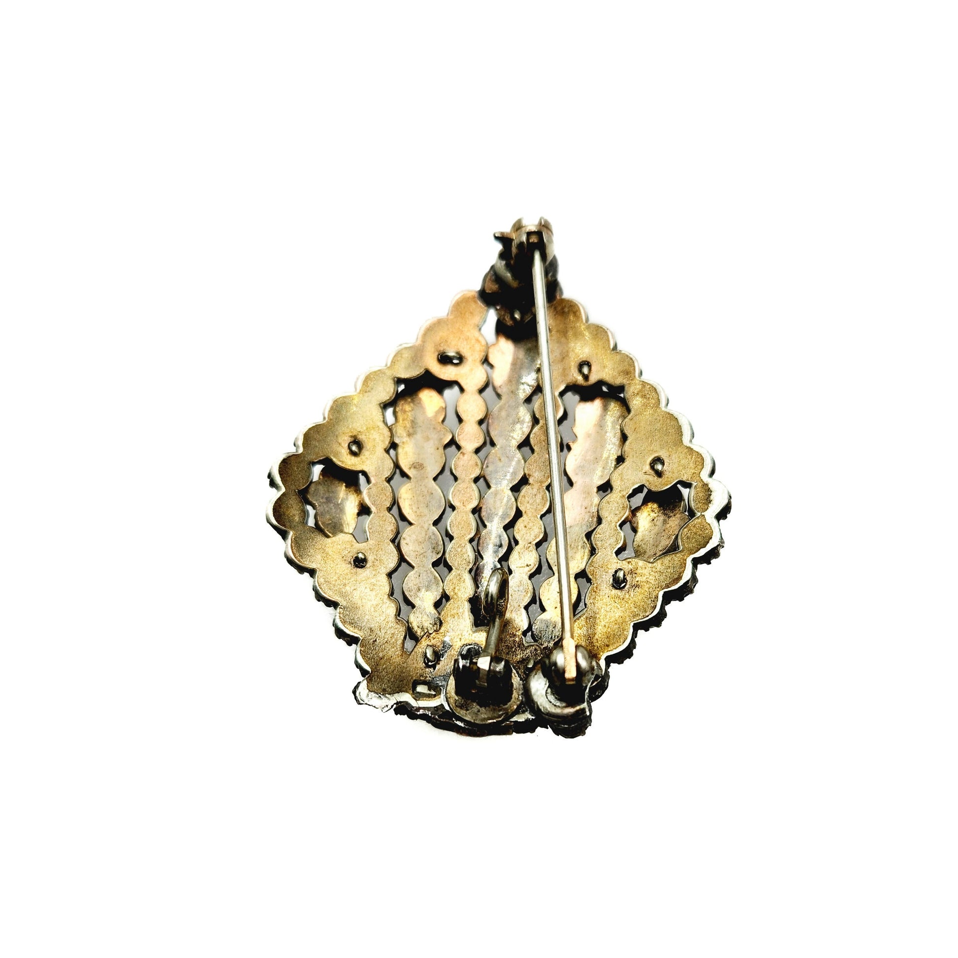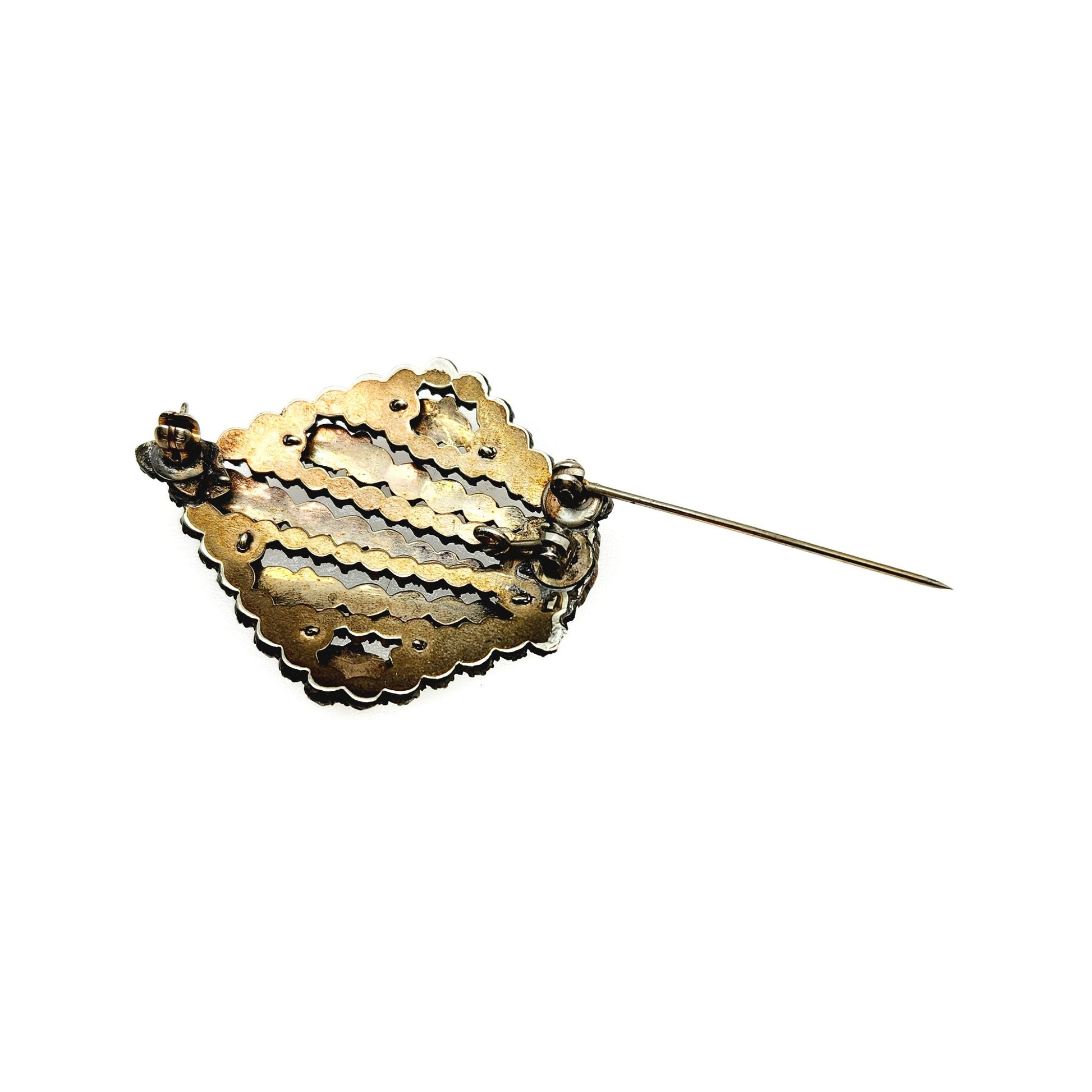 The piece is in very good antique condition. There are a few small chips and nicks visible under magnification. One small garnet is lightly saturated in color, while another is cut very shallowly and has a very light hue. At first glance, it appears that nothing is missing, but there are no missing stones. There are no stamps or marks. The clasp and pinstem are replacements, and the bail flips up.
