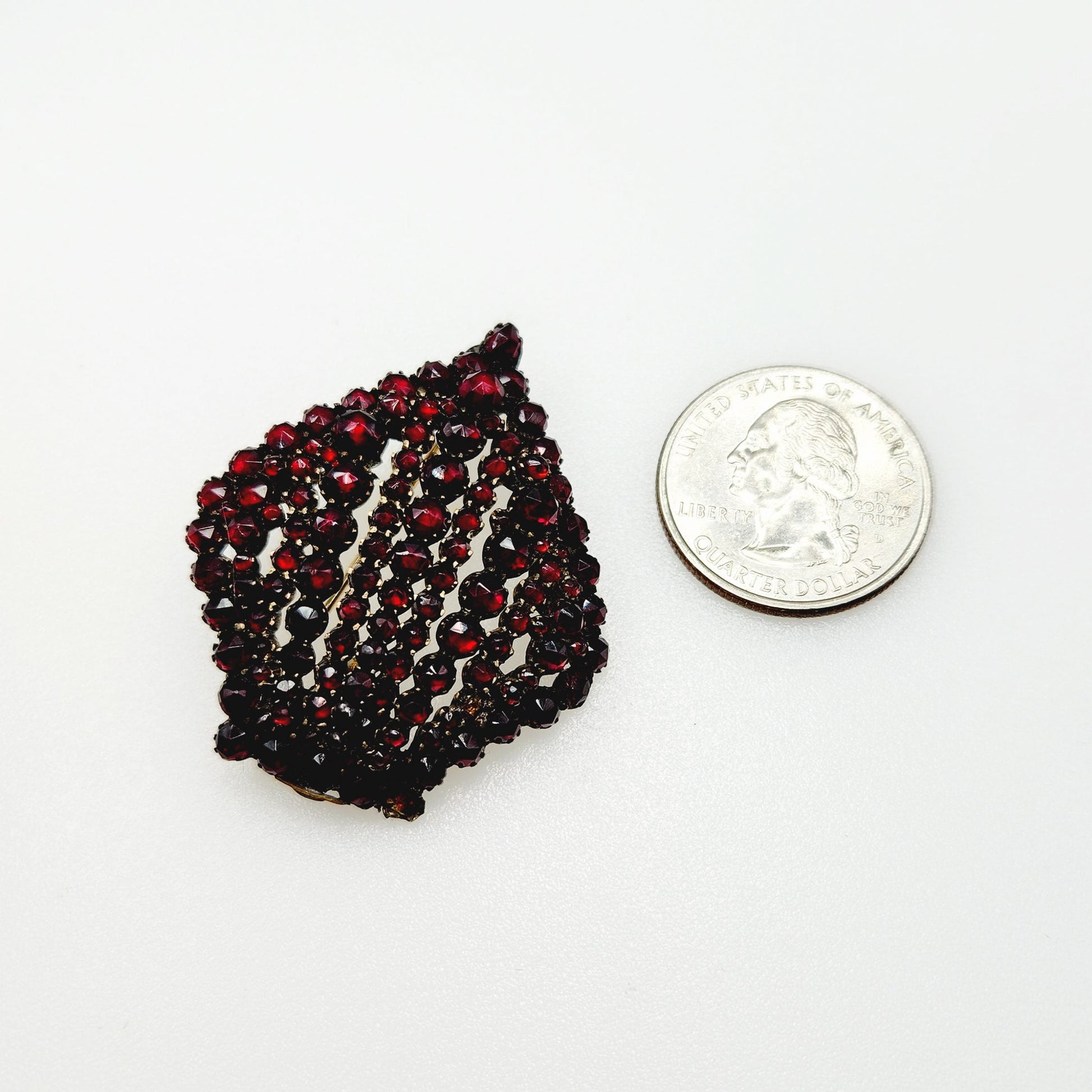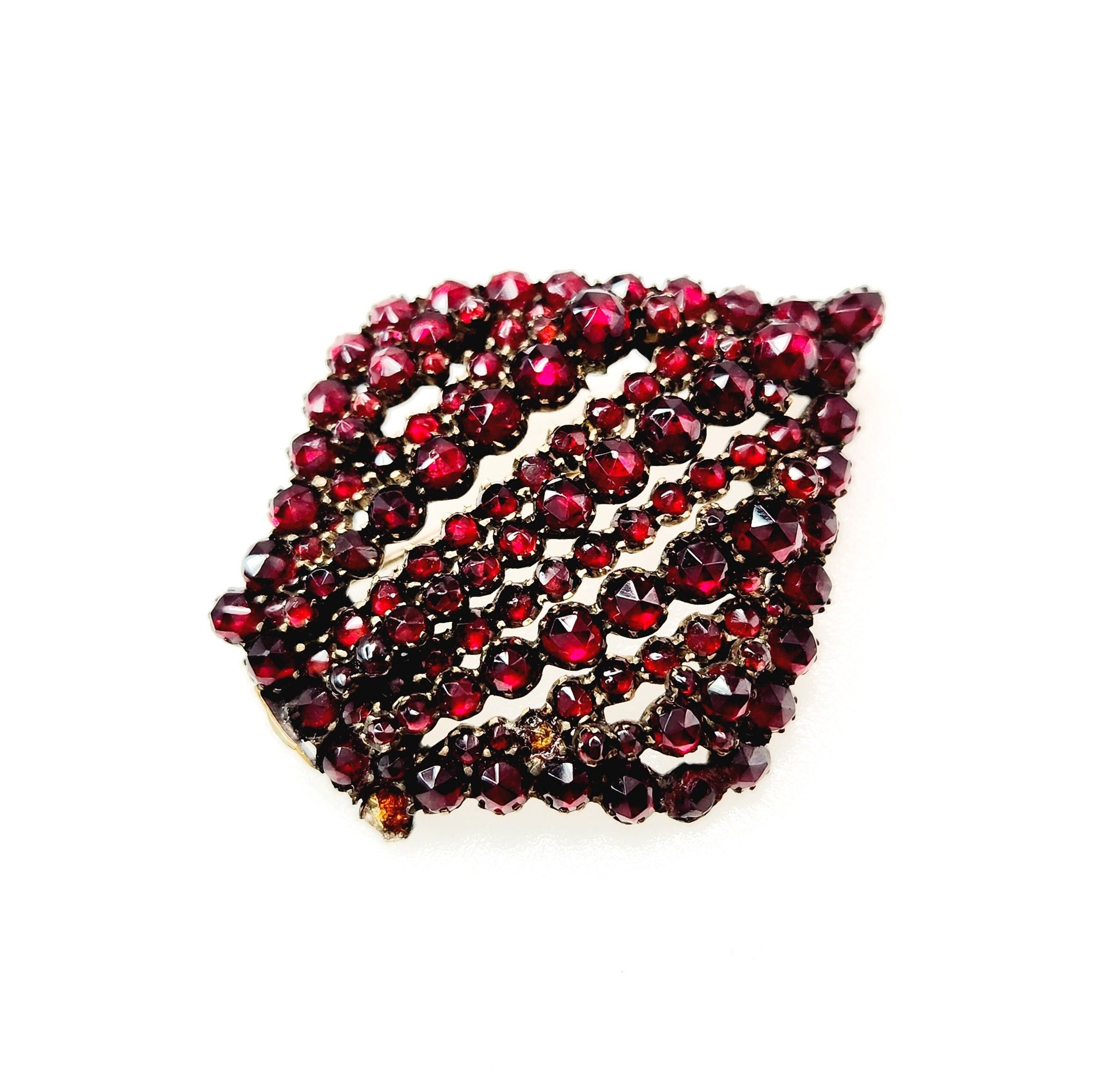 Enhance your style with this remarkable Bohemian garnet crown brooch and pendant from the 1890s. Featuring a dazzling array of 123 rose-cut pyrope garnets, each carefully prong-set in gilt, this piece radiates timeless elegance. The pave-set garnets shimmer and gleam beautifully when touched by sunlight, creating an enchanting allure. When paired with black fabric, this antique brooch becomes even more striking, making it a truly eye-catching accessory.