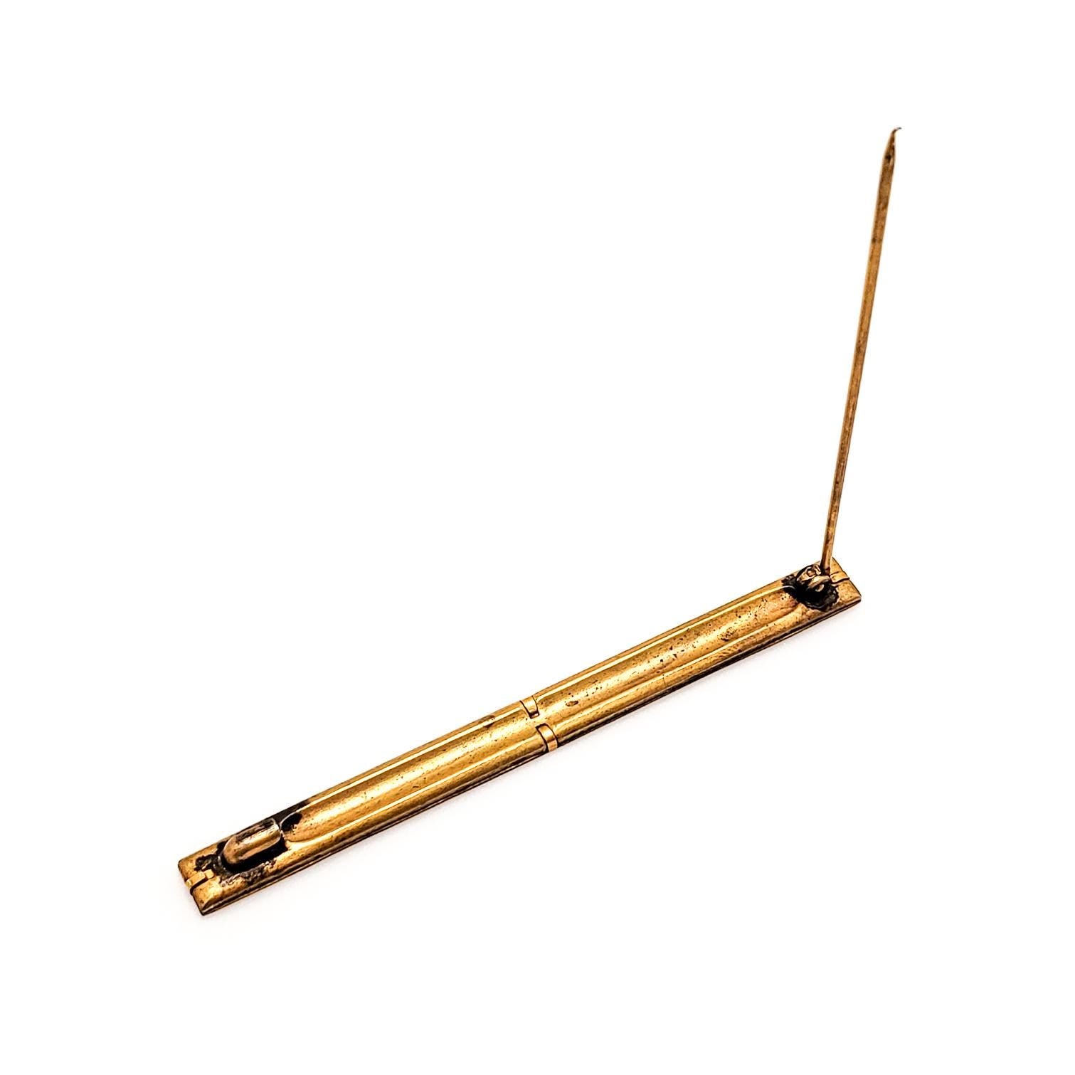 This beautiful bar pin from the Art Nouveau era is etched with a peacock motif in yellow gold-filled metal. A beautiful antique pin to add to your collection!