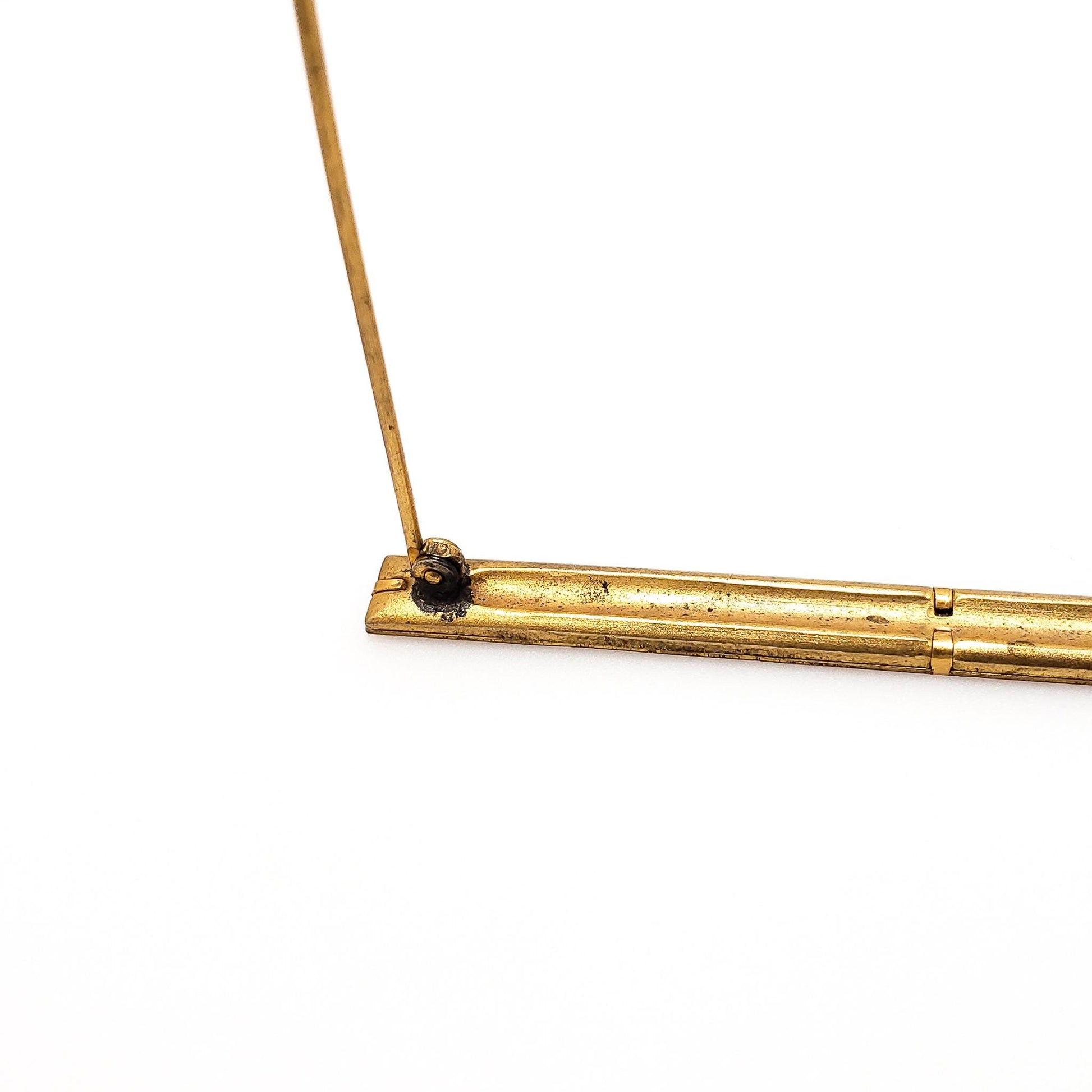 The brooch is in very good antique condition with minor signs of wear. The pin and hinge are fully functional but a little stiff from age. The back has a few tiny dark spots on the gold-filled metal near the clasp and hinge, but nothing noticeable while wearing. There are no marks or stamps.