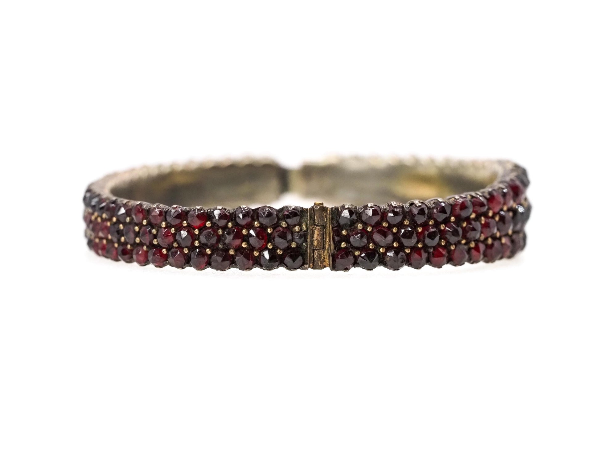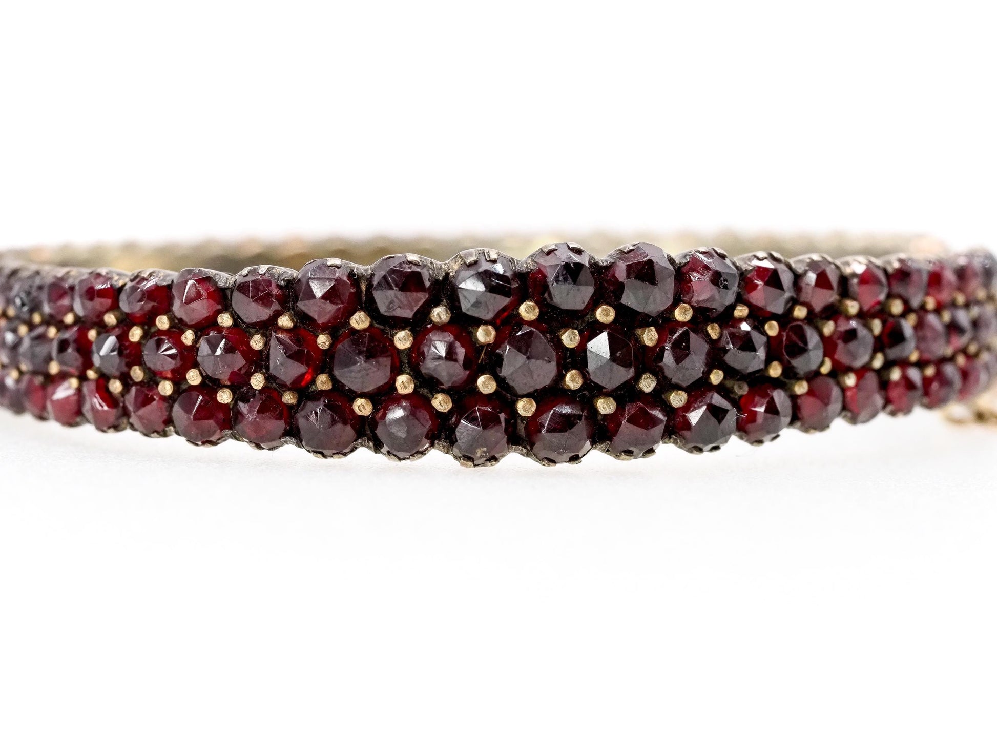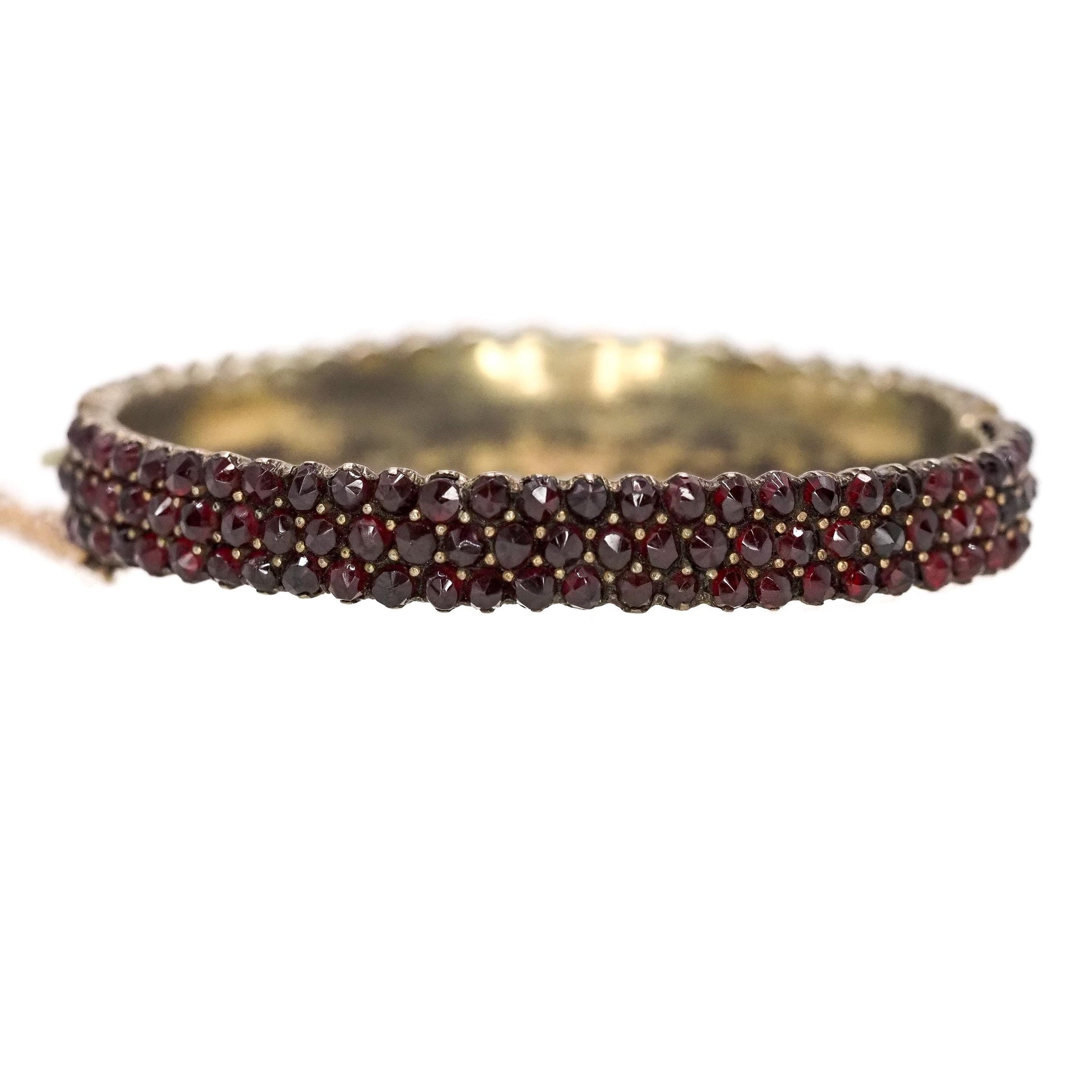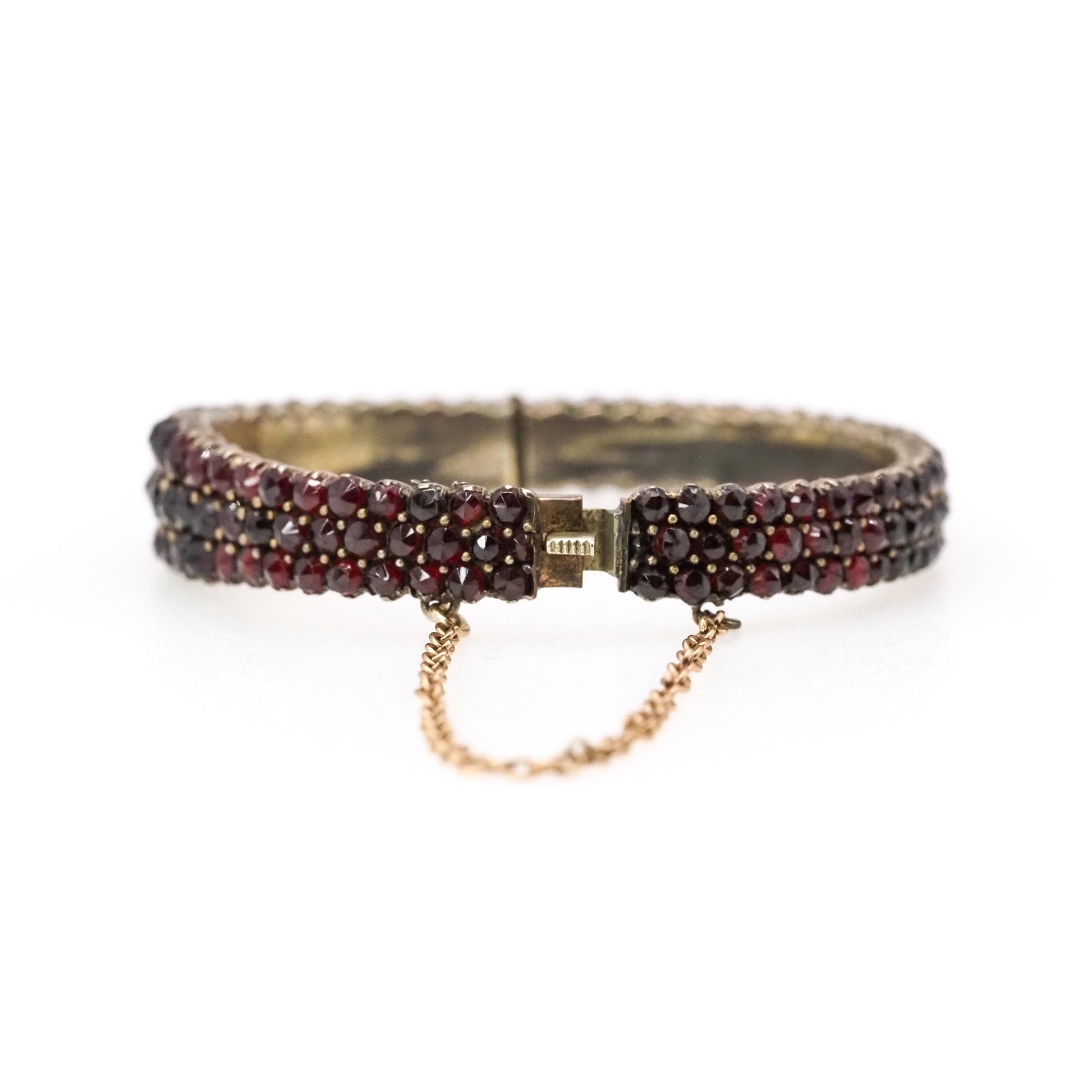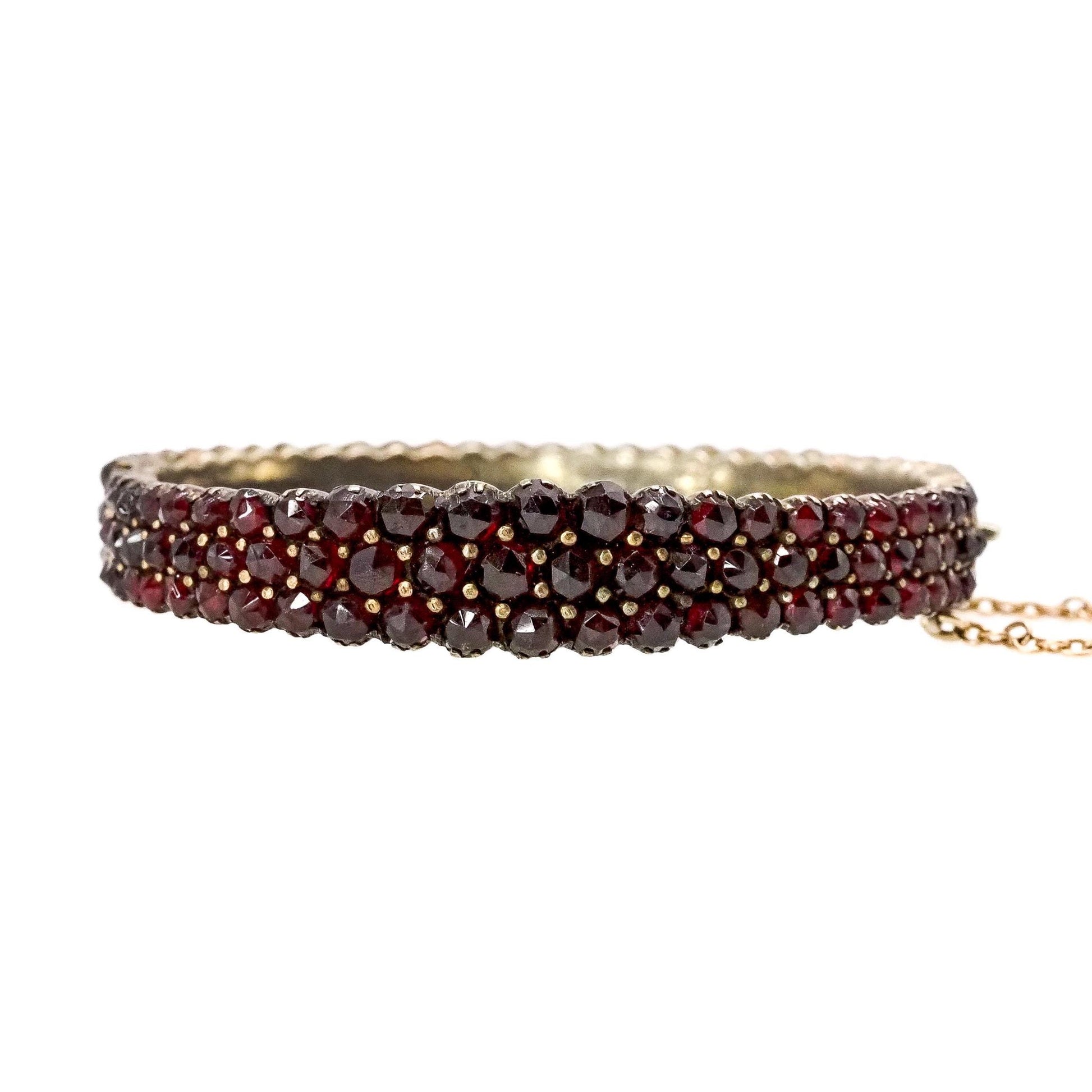 Crafted in the early 1900s, this stunning Bohemian garnet bangle features 171 rose-cut pyrope garnets set in gilt. The hinged bangle has three glistening rows of garnets that gently graduate, and the pavé setting makes the bracelet glow and sparkle in the sunlight. A safety chain is attached for added security. This is a superb antique piece to add to your collection!