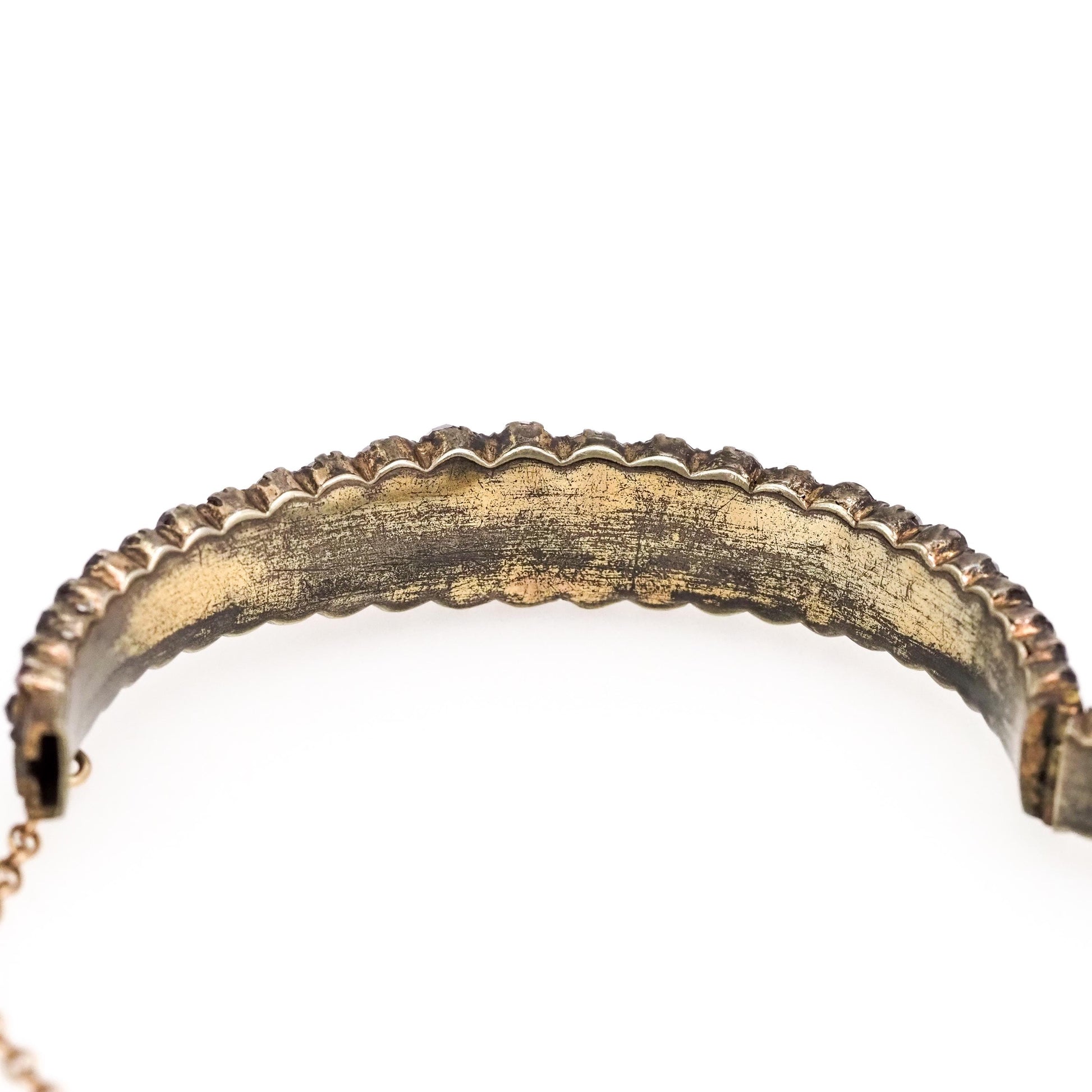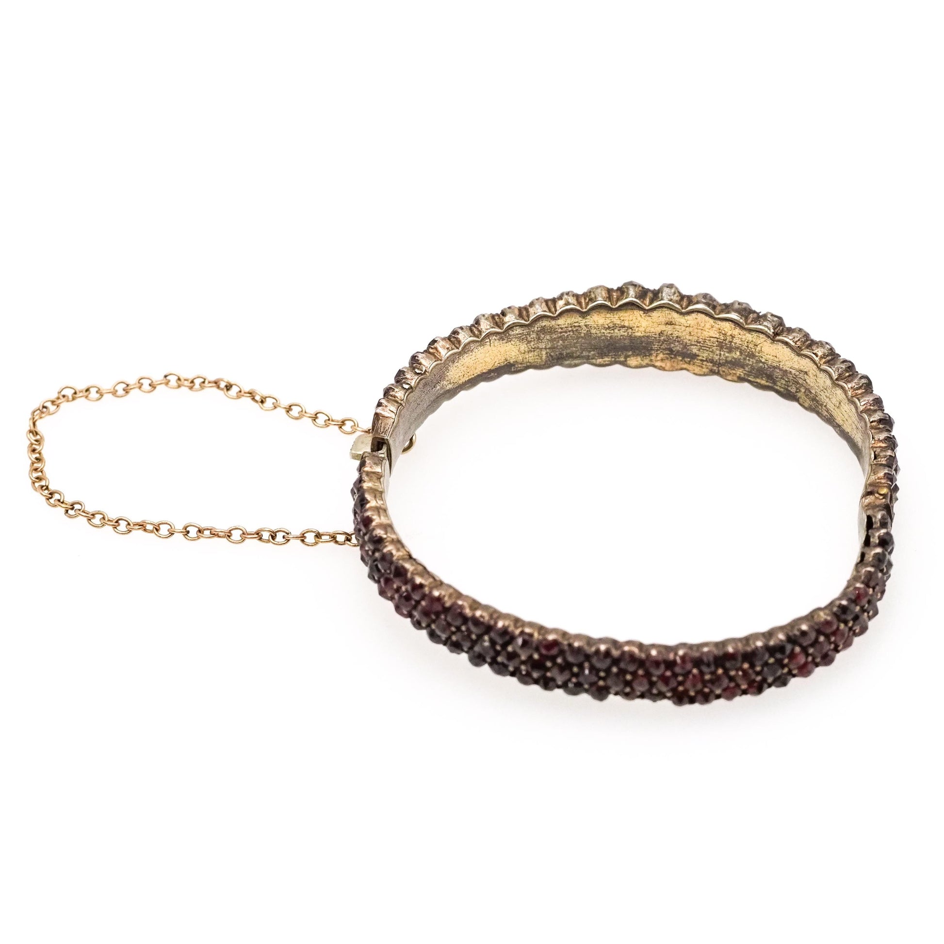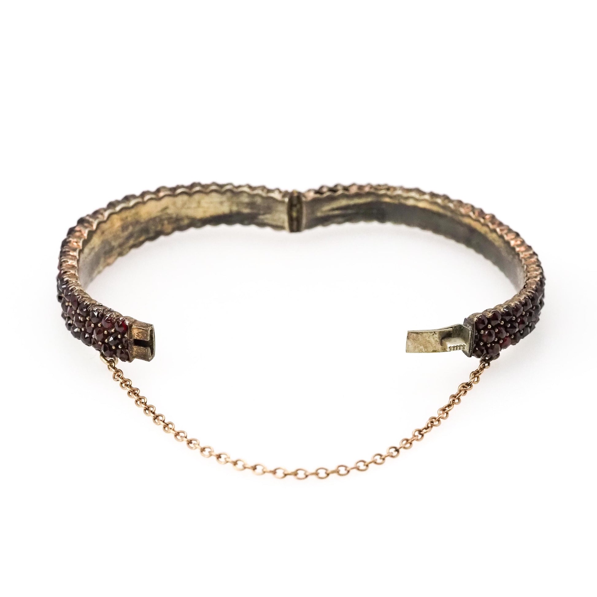 The bangle is in very good antique condition with a few minor signs of wear. The garnets are securely set; there are no missing stones. There are two garnets on the underside that are slightly chipped. There are signs of wear on the inside of the bangle, with some areas of silver visible through the surface. Gilt is a fine layer of gold over the silver. The box clasp and safety chain are fully functional.