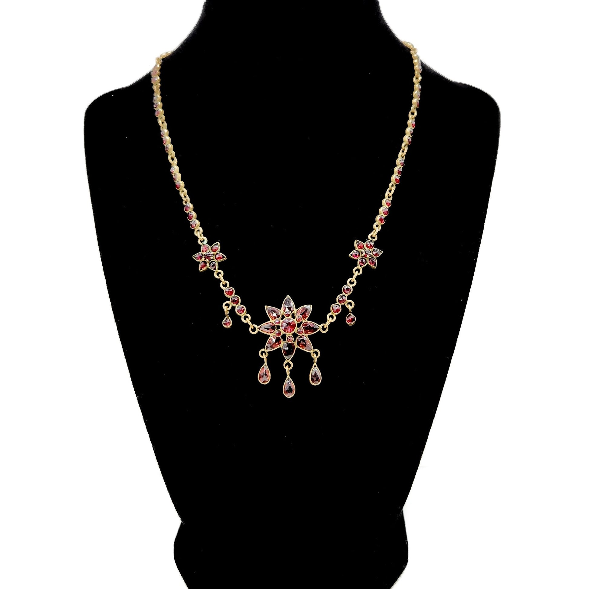 Antique 1900s Bohemian Garnet and Gilt Star Czech Garnet Flower Choker Statement 17" Necklace