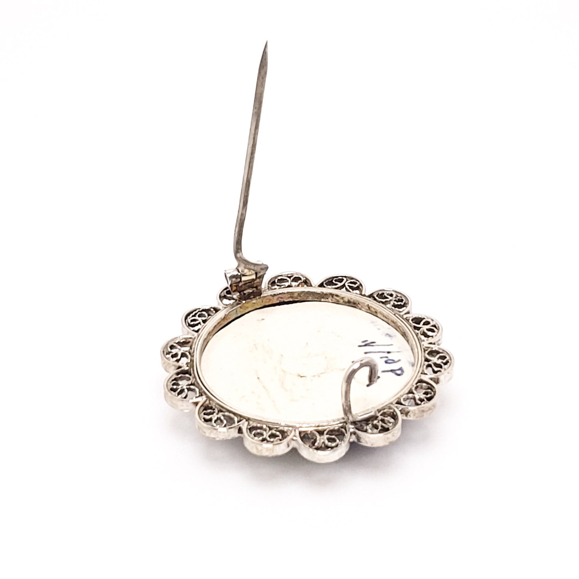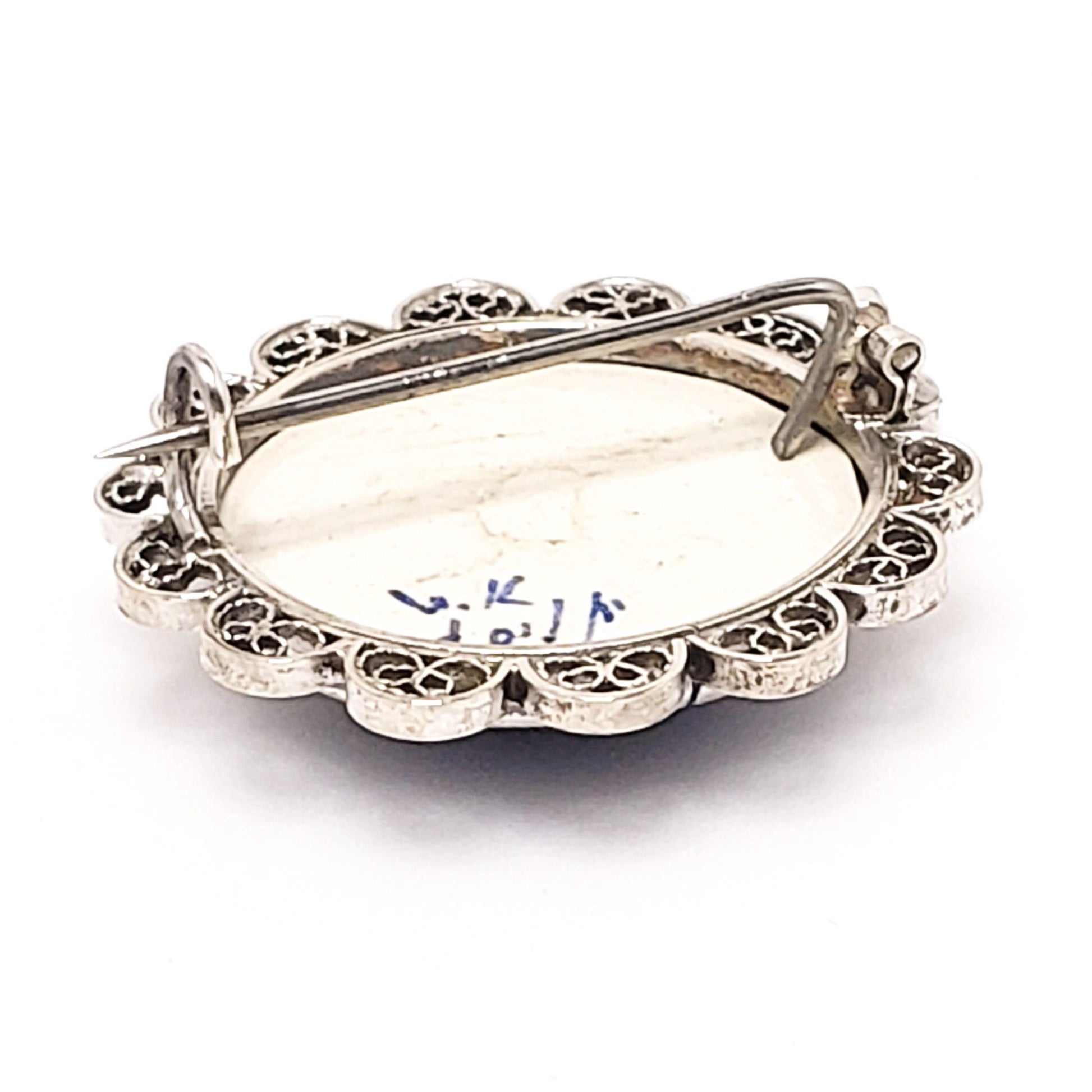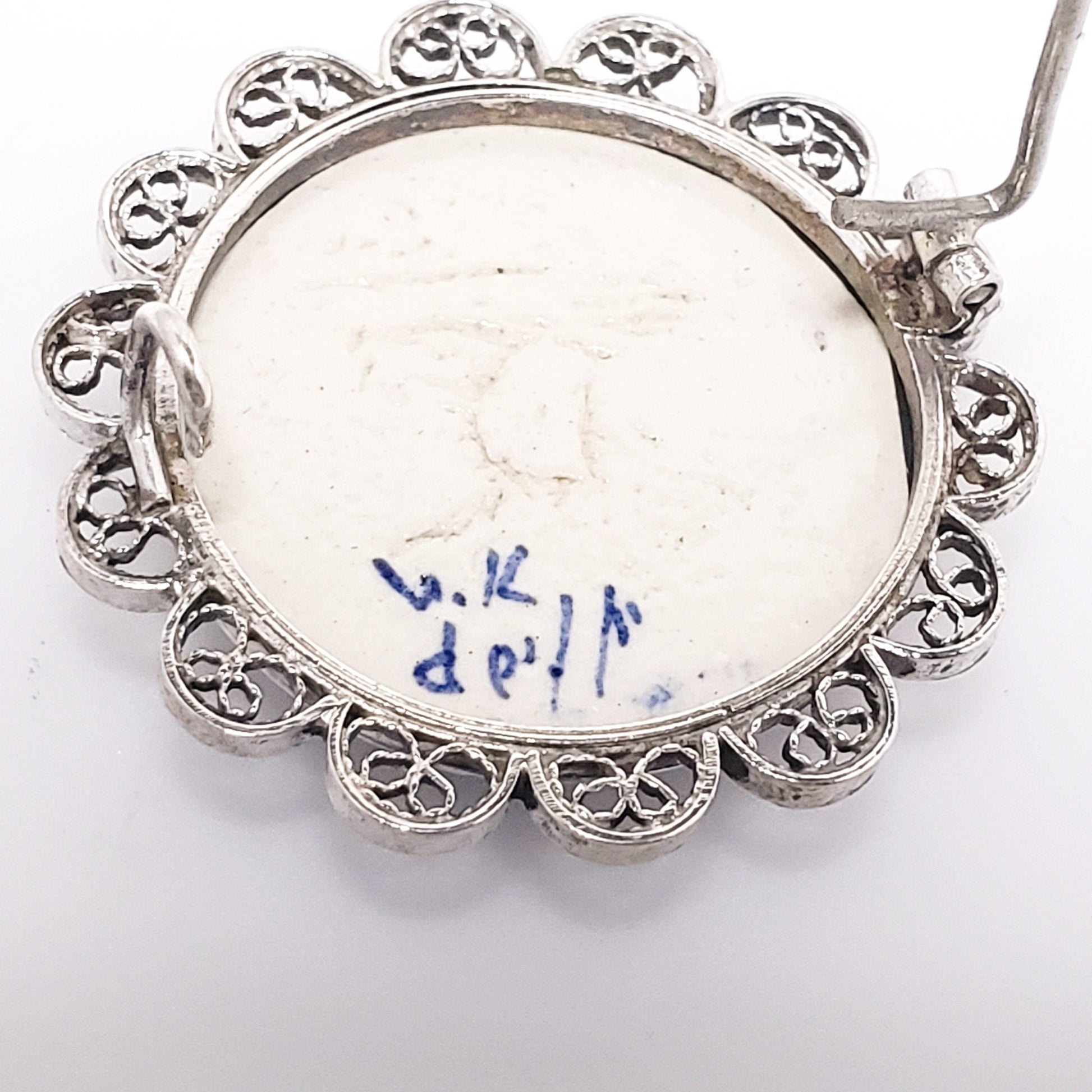 The brooch is in very good antique condition with minimal signs of wear. The pottery is not chipped or cracked, and the painting is intact. The silver has a light layer of patina that can be polished upon request. The c-clasp and hinge are fully functional, and the artist signed the back.