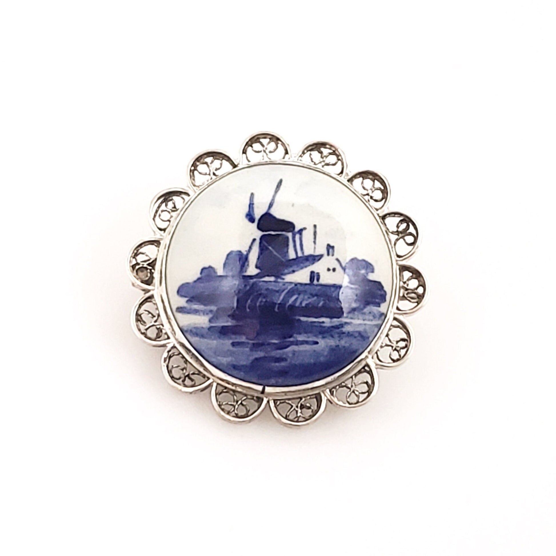Antique 1900s Edwardian Delft Blue Pottery and Silver Windmill Brooch