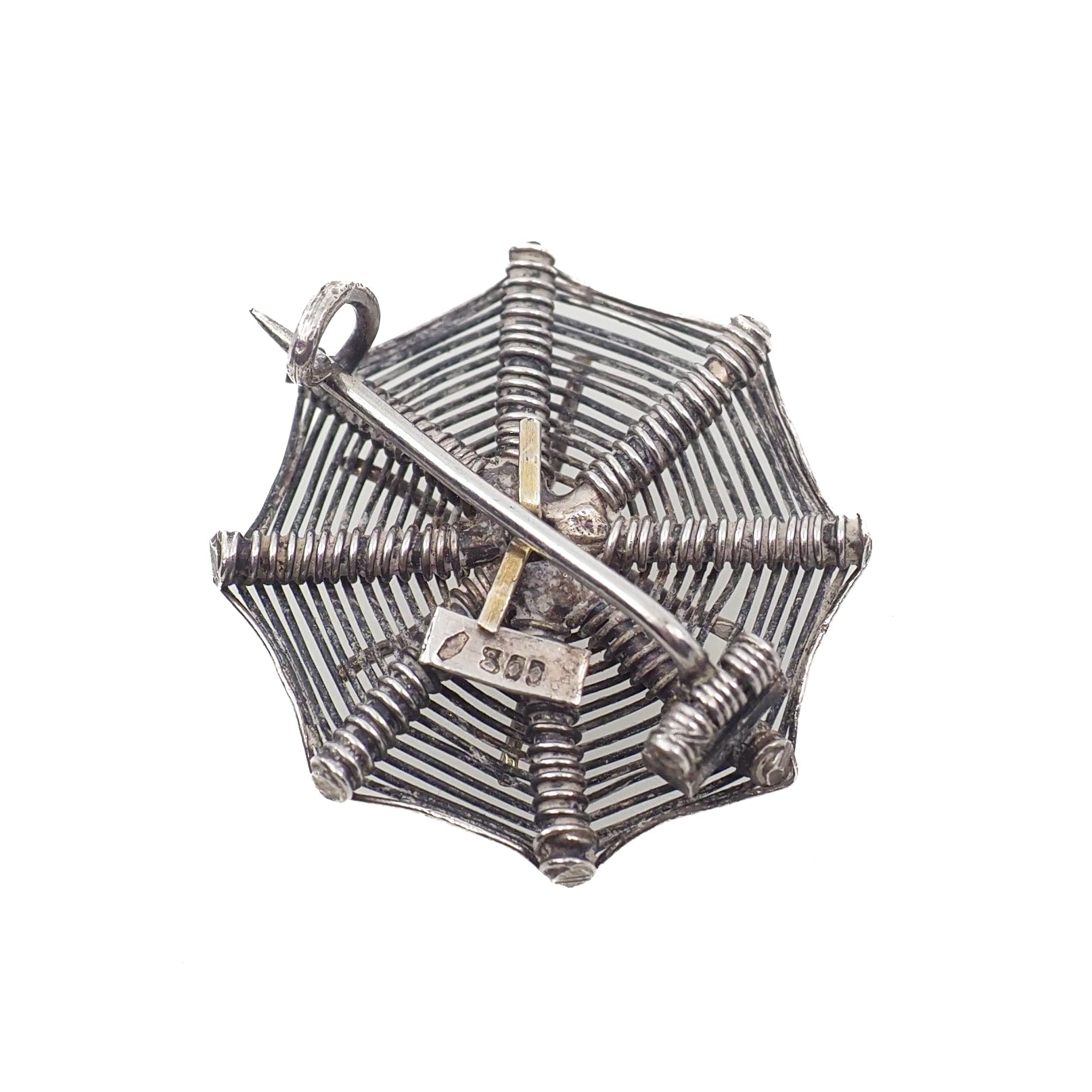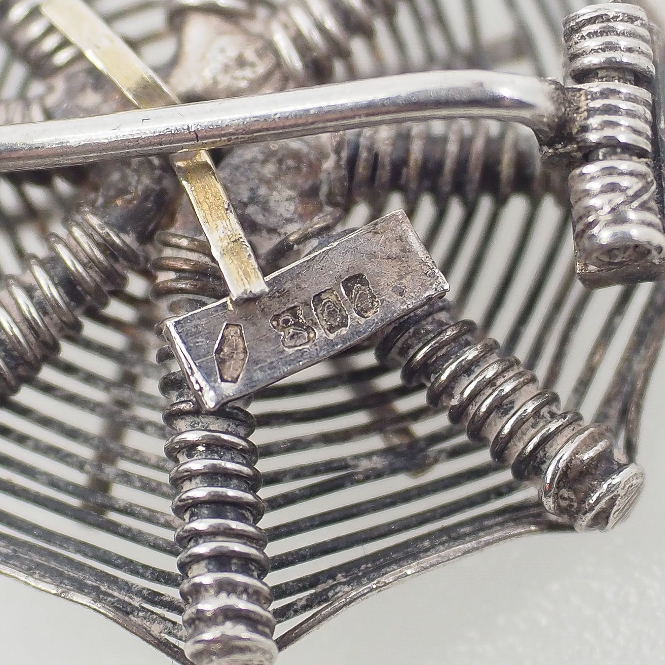The brooch is in excellent antique condition, showing minimal signs of wear. The silver has a fine patina that can be polished upon request. The back is stamped 800 and features a worn maker's mark. The spider is slightly loose but remains secure.