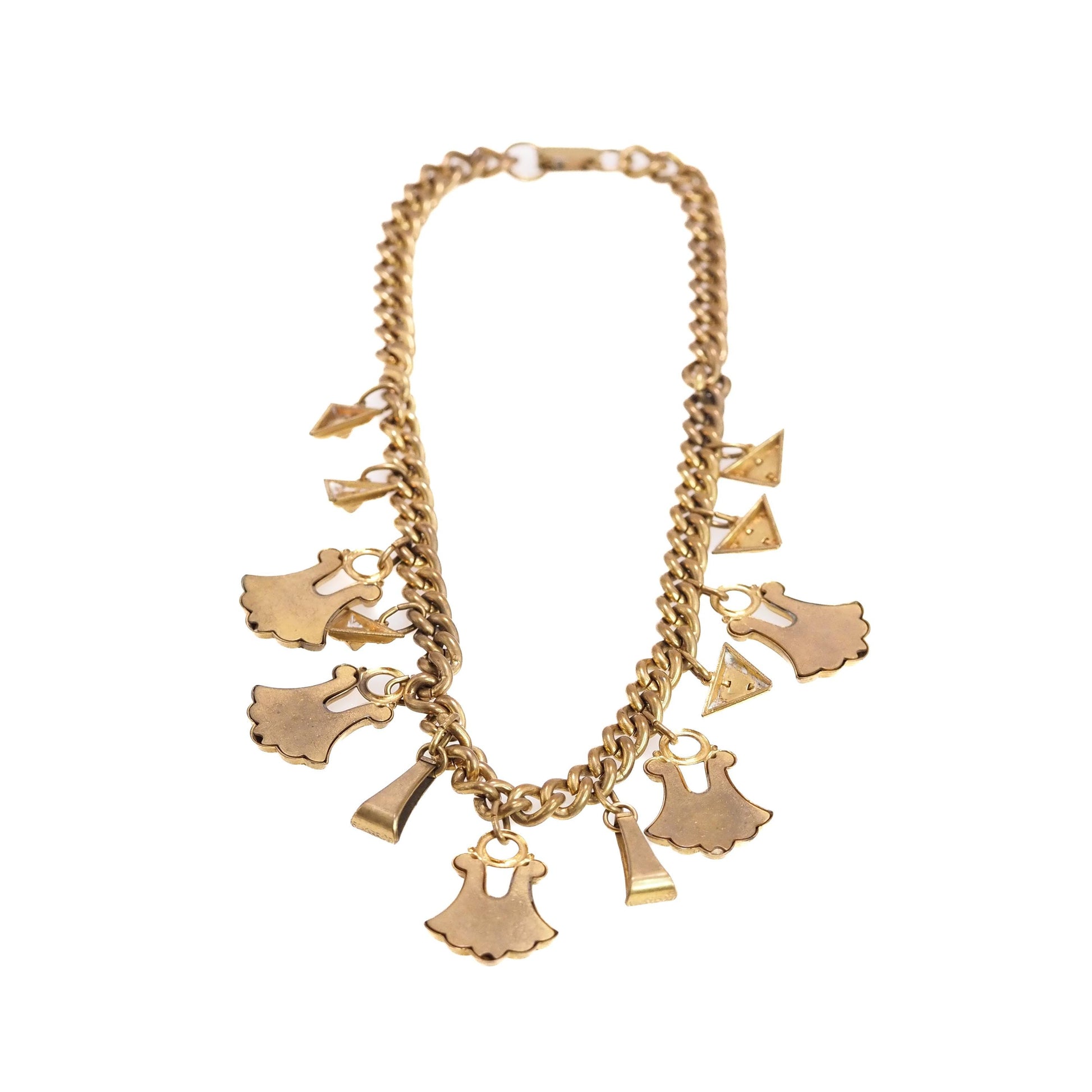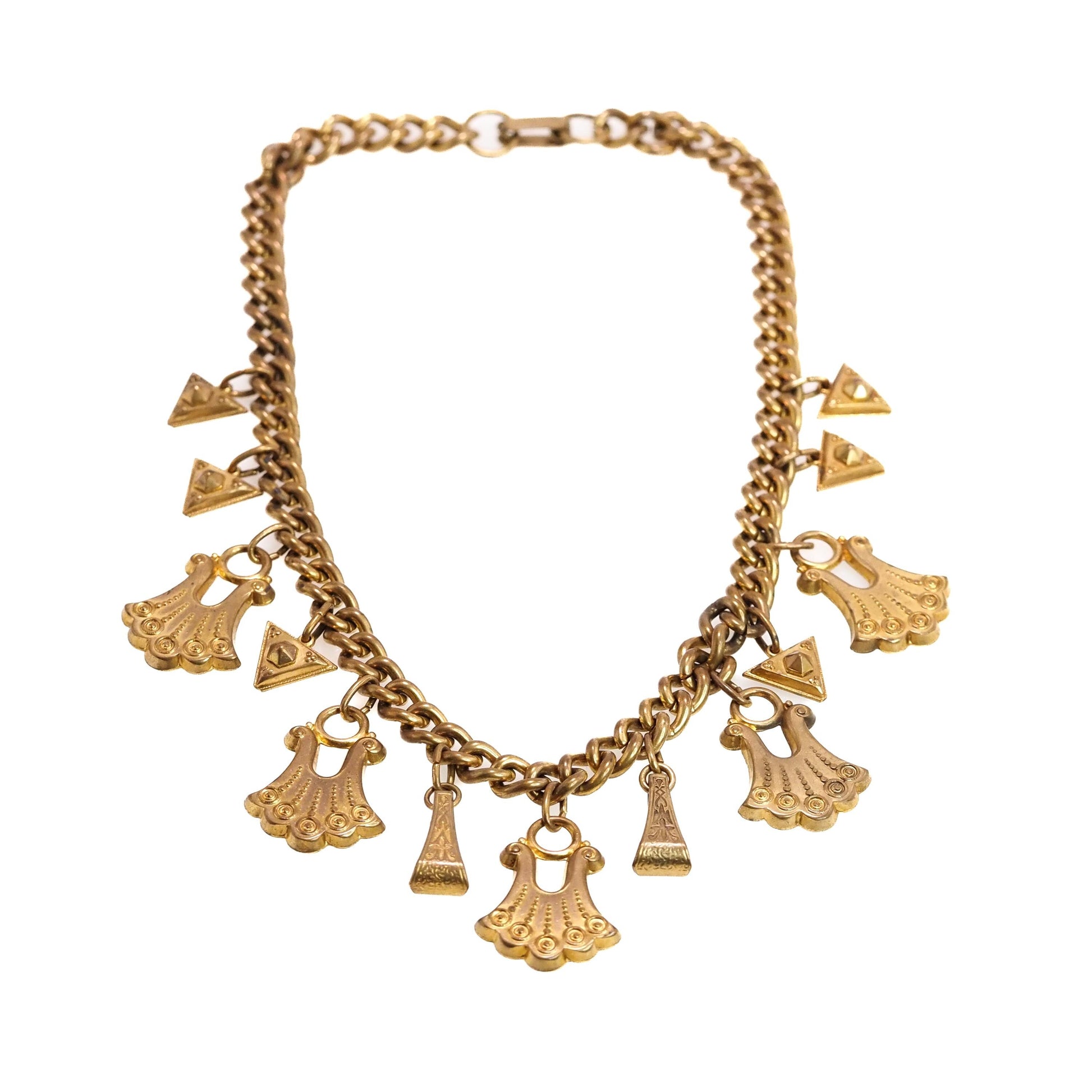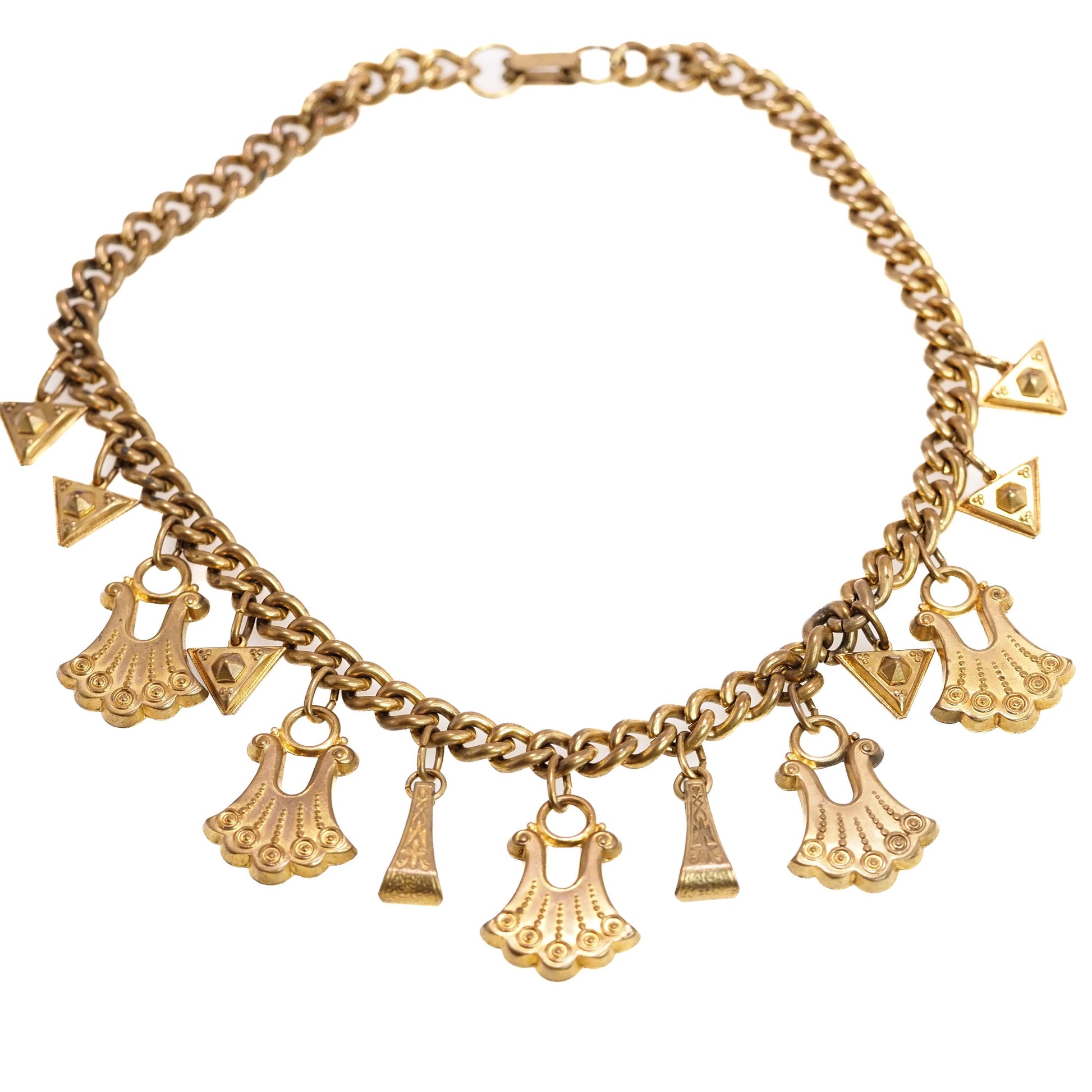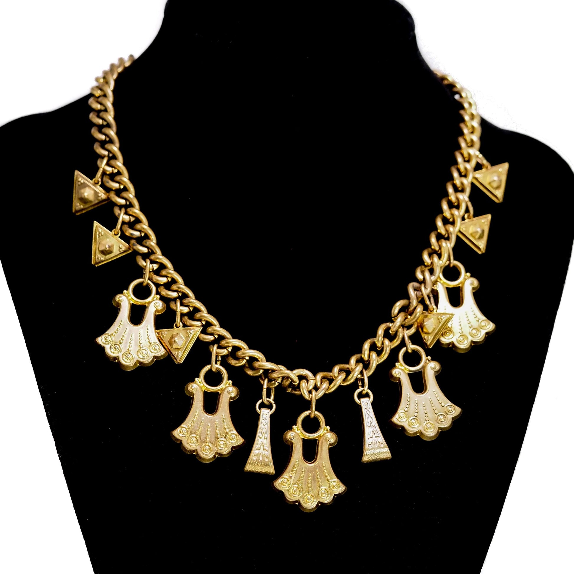 This lovely late-Victorian 1900s brass necklace is a real statement piece. The highly decorated brass dangles accent the chain well. A beautiful antique chain to add to your collection!