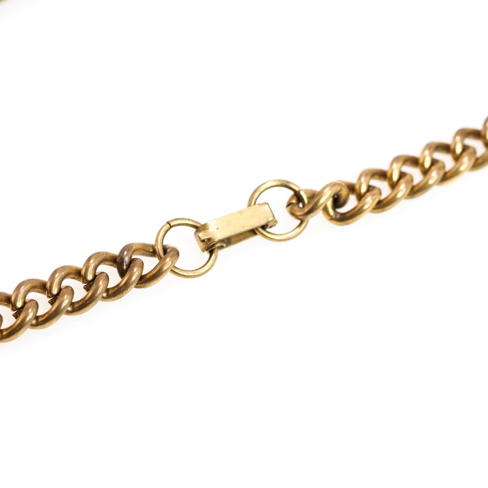The chain is in good antique condition, with a few signs of wear. There are fine lines and marks on the chain from years of wear, but no dark tarnished areas or chips on the brass. The fold-over clasp is fully functional and secures the piece. Brass has an odor that may bother some.