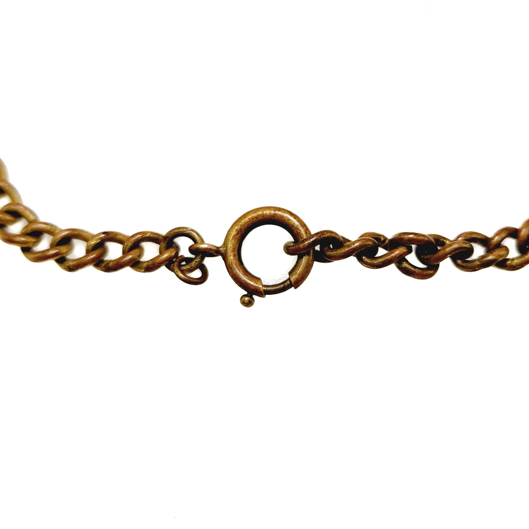 The bracelet is in very good to good antique condition with some signs of wear. The gold-filled surface shows fine lines and marks, typical of antique jewelry, as well as areas of wear on the chain. There are a few tiny dark flecks on the metal, but nothing noticeable. There are no marks or stamps. The base metal is brass, so it has a slight metallic odor.