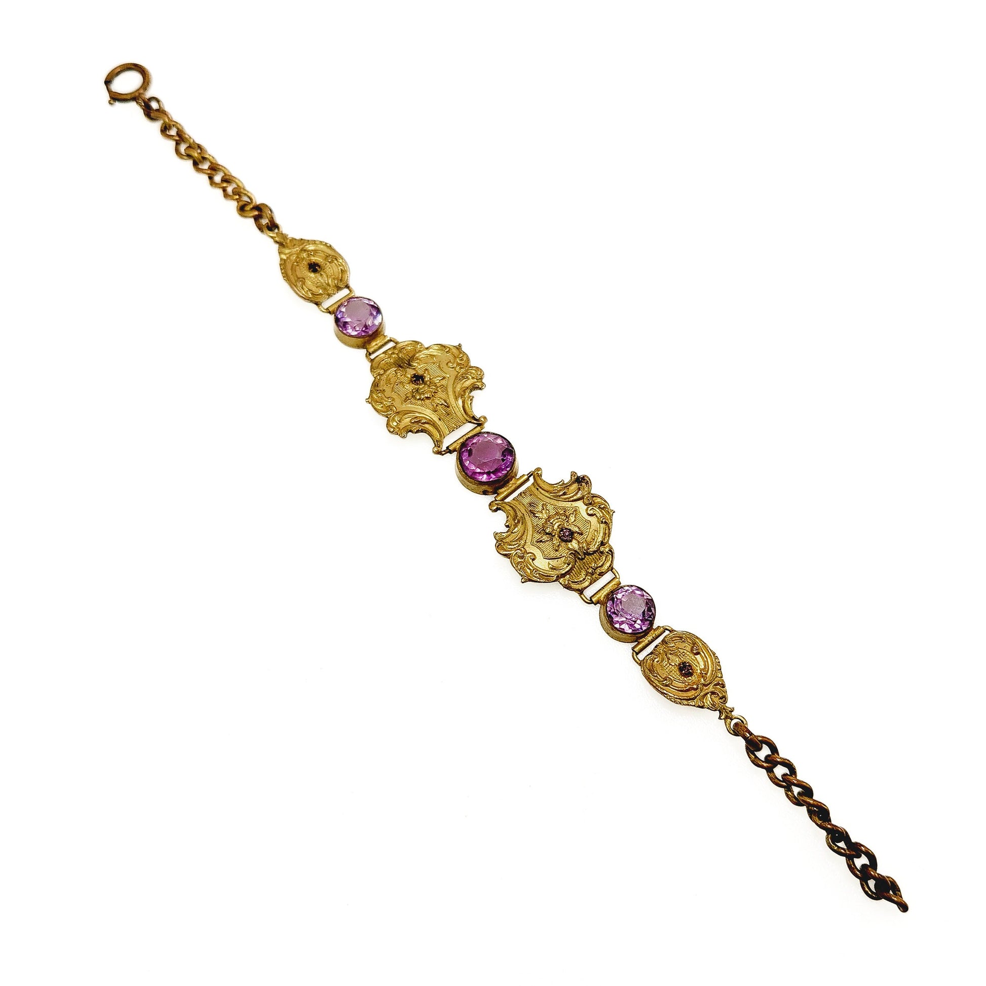 Step back in time with our late Victorian-era gold-filled bracelet, circa 1900. This antique piece is set with vibrant round-cut purple glass. A blend of elegance and history, this bracelet is a timeless testament to enduring style.
