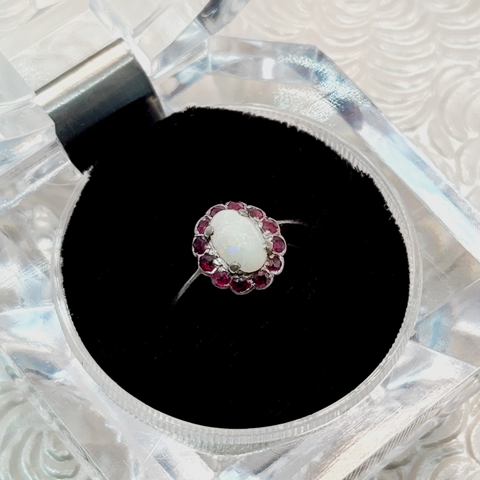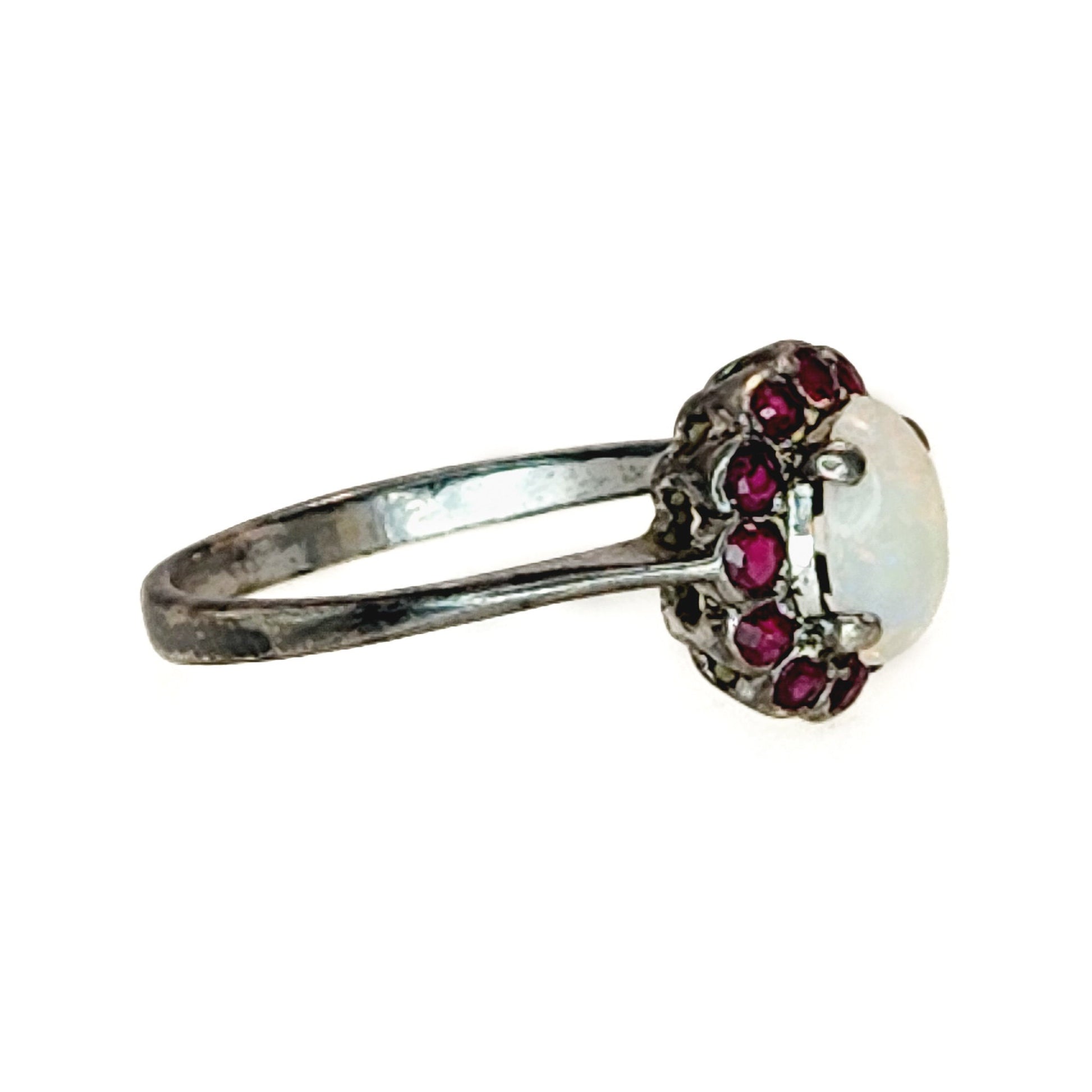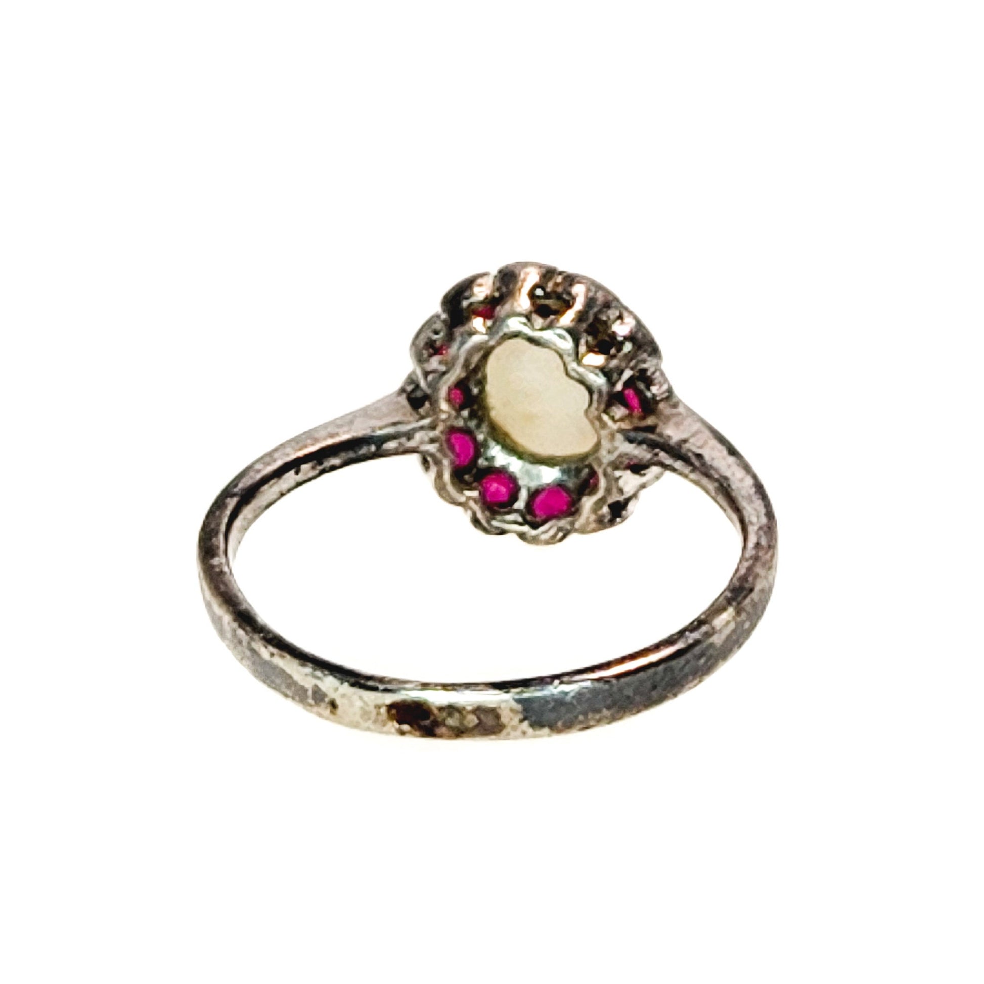 Antique 1910s White Opal and Red Spinel Halo Silver Ring Size 5