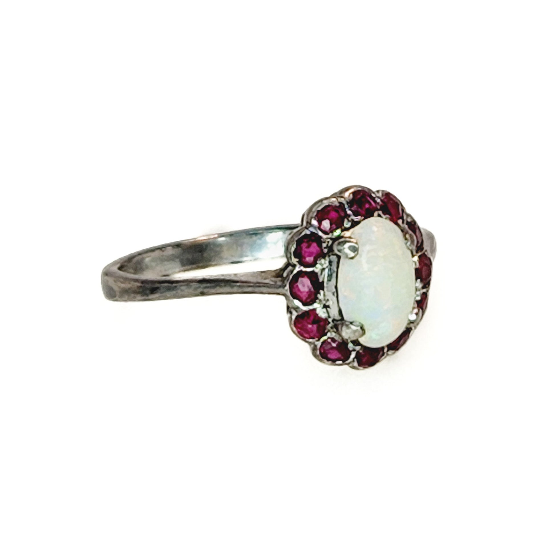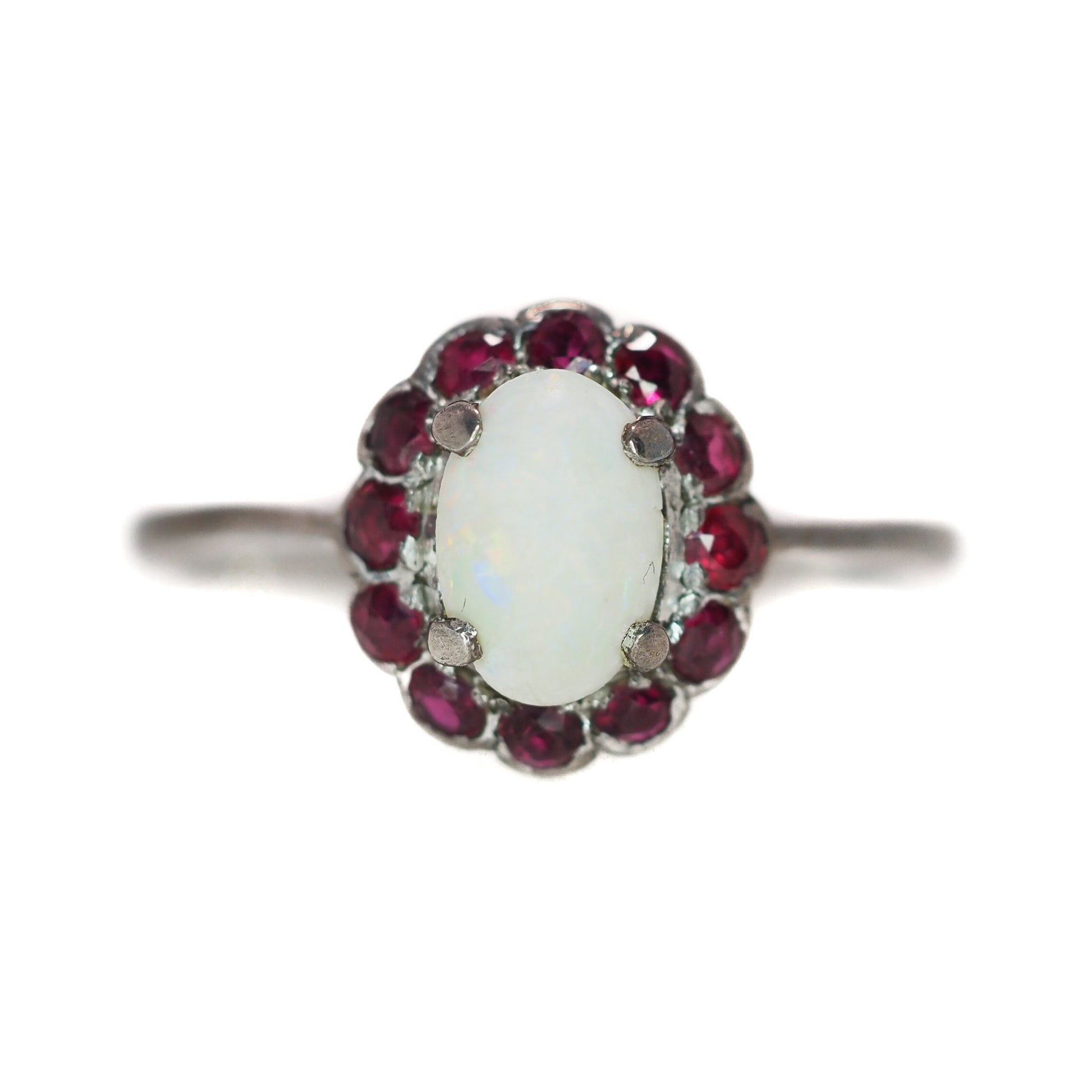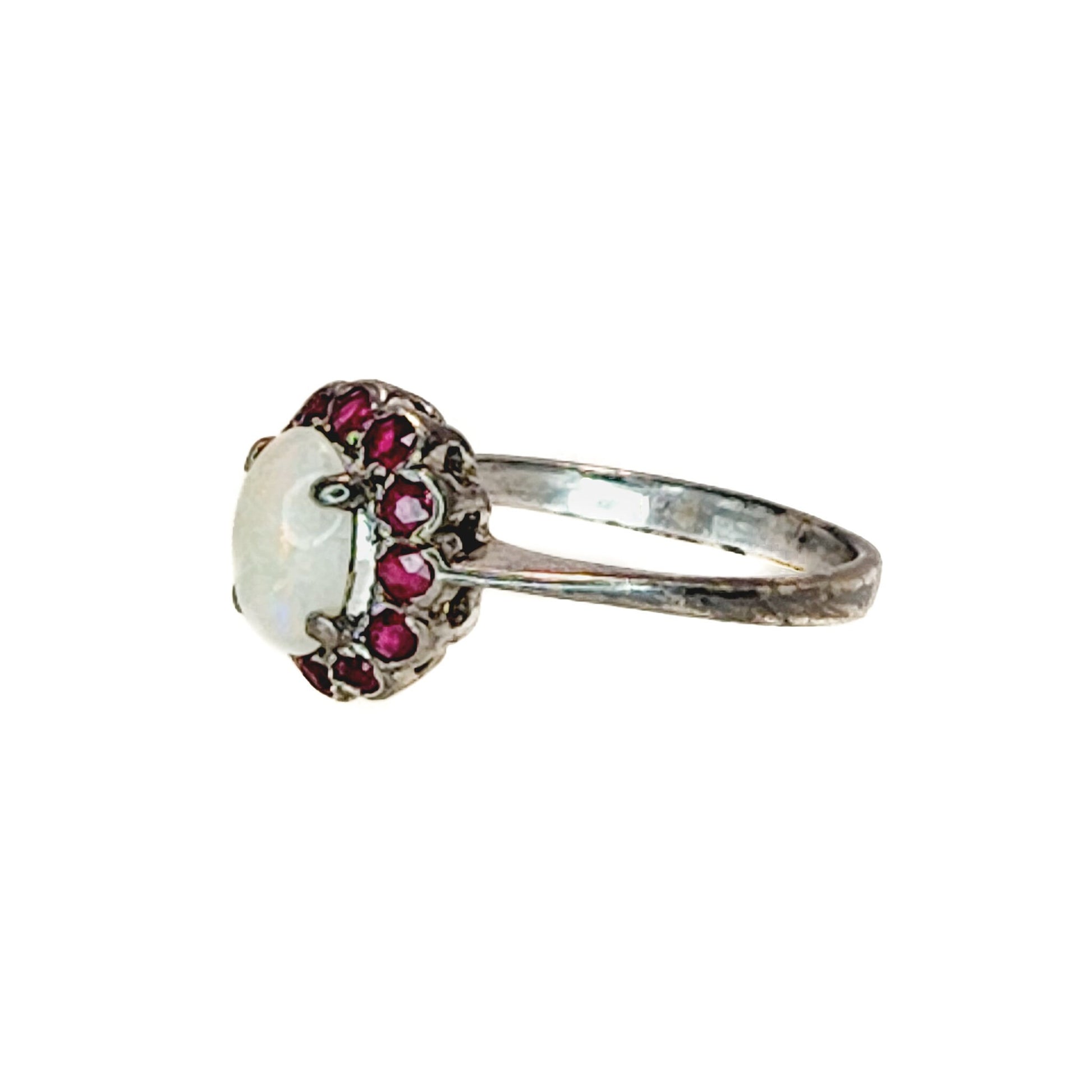 Antique 1910s White Opal and Red Spinel Halo Silver Ring Size 5