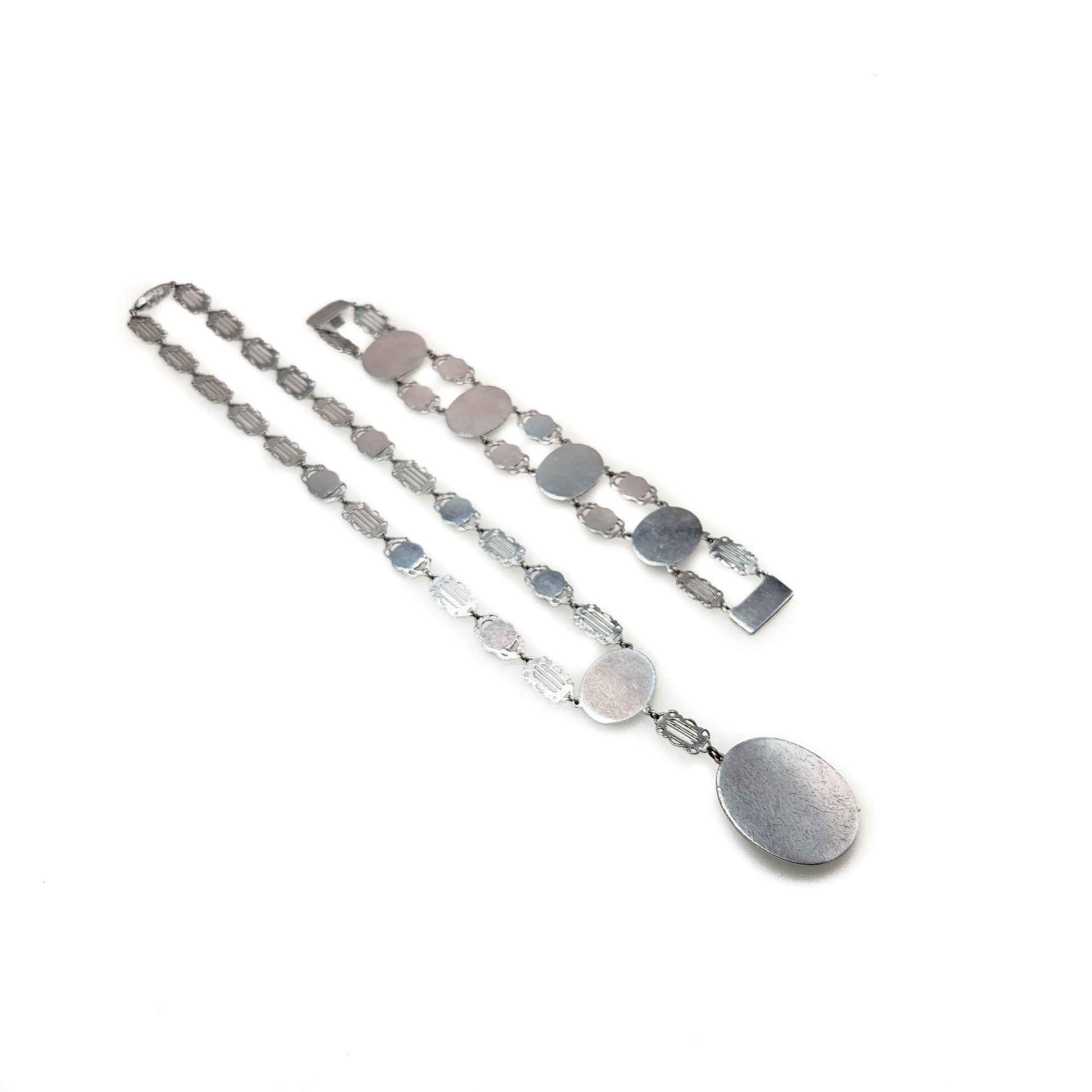 The jewelry set is in very good vintage condition with minimal signs of wear. The metal and glass surfaces have minor signs of light, which is typical of antique jewelry. The filigree is not bent or broken, and the glass and marcasites are intact. There are a few tiny areas of wear on the plate on the back. The chain is not bent or kinked, and the clasp is fully functional. The piece is not stamped or marked, and the glass and metals were tested.