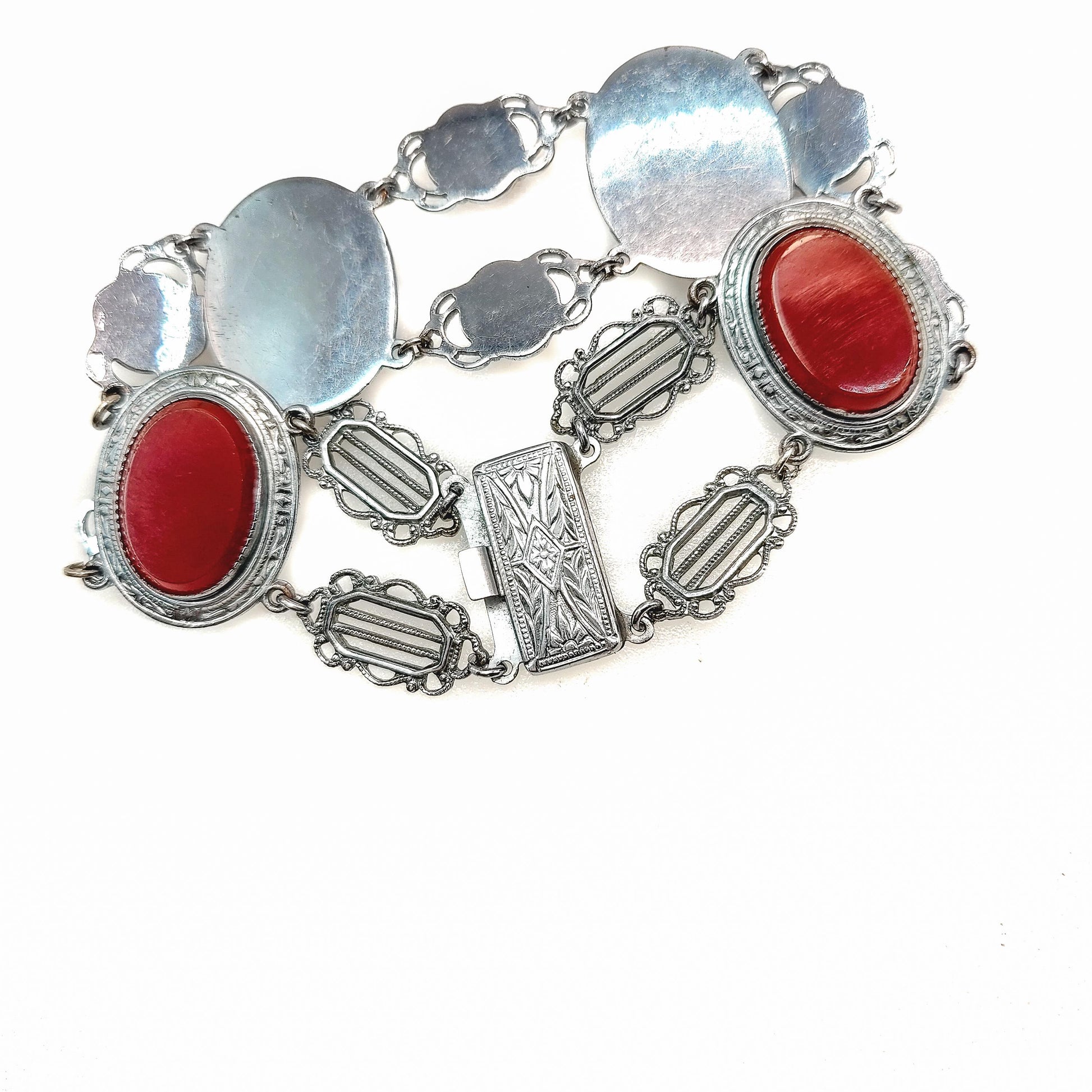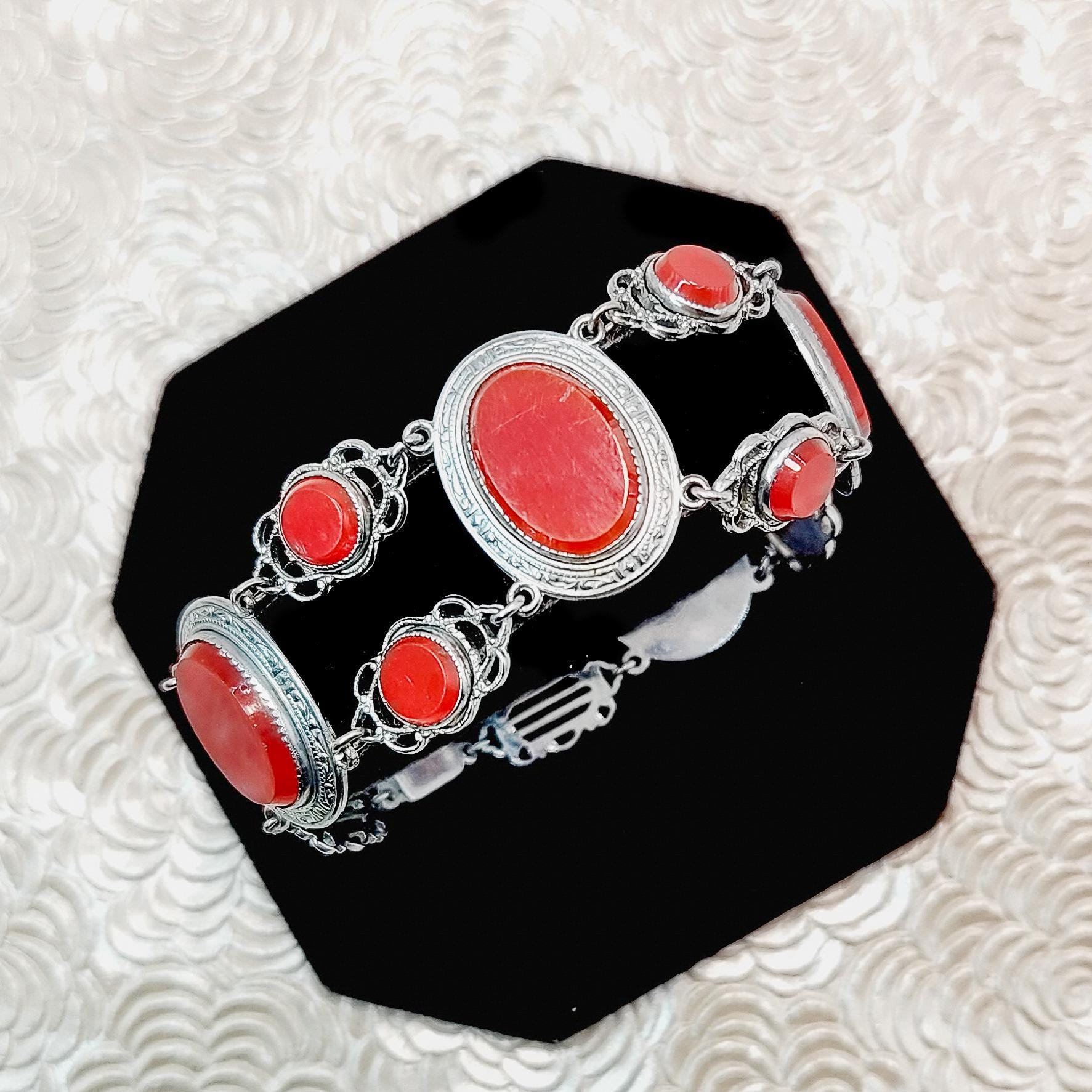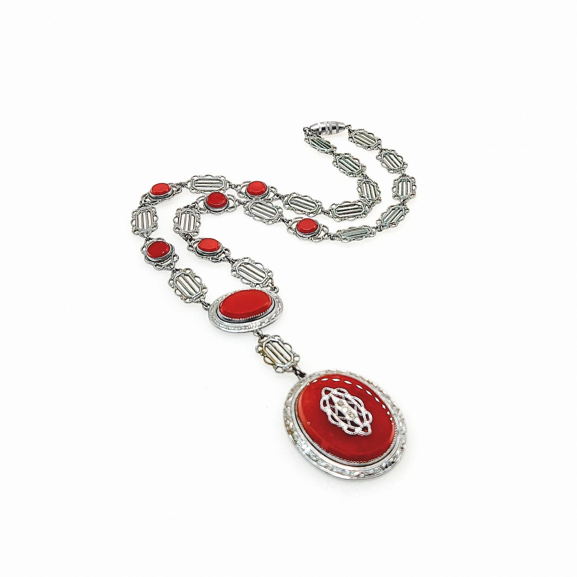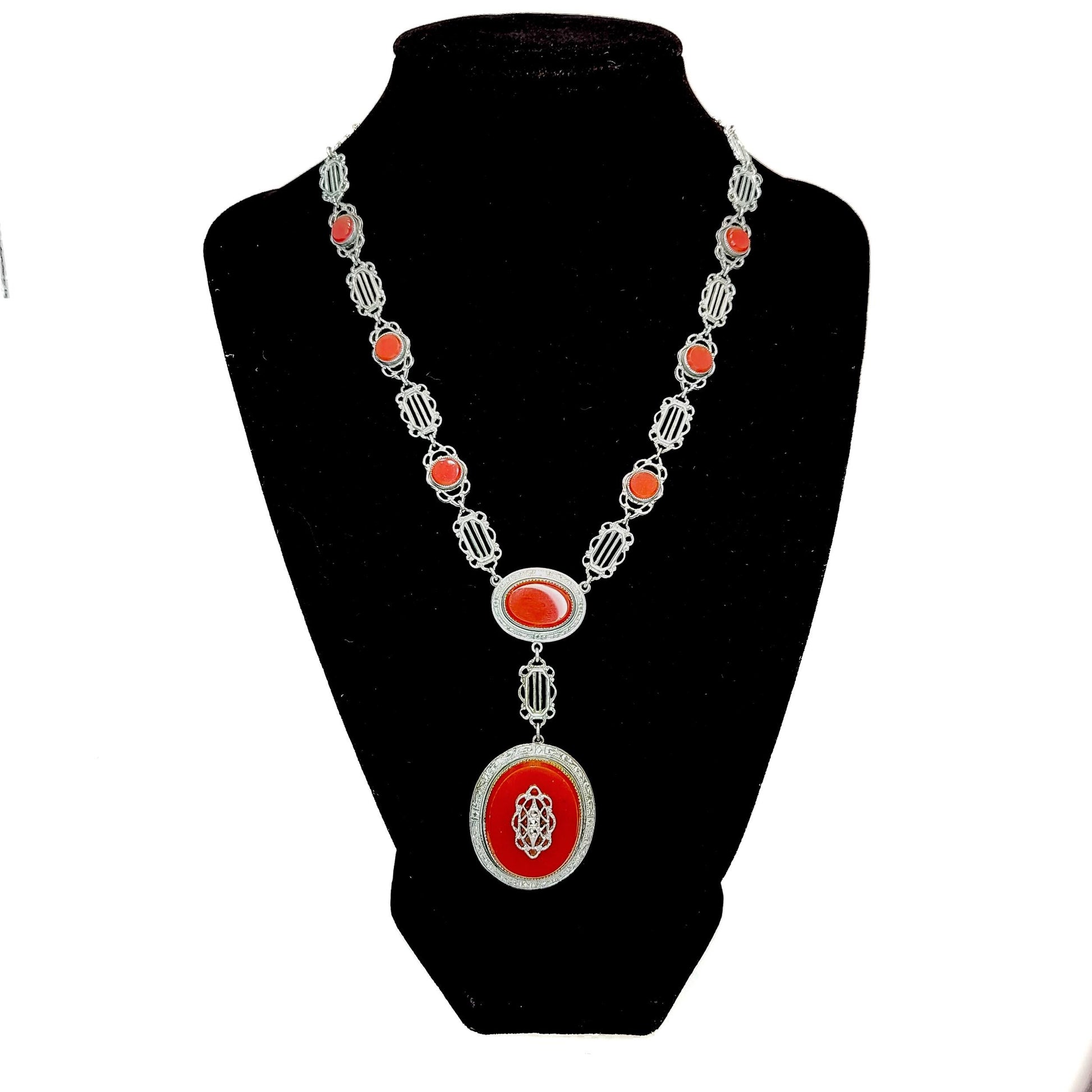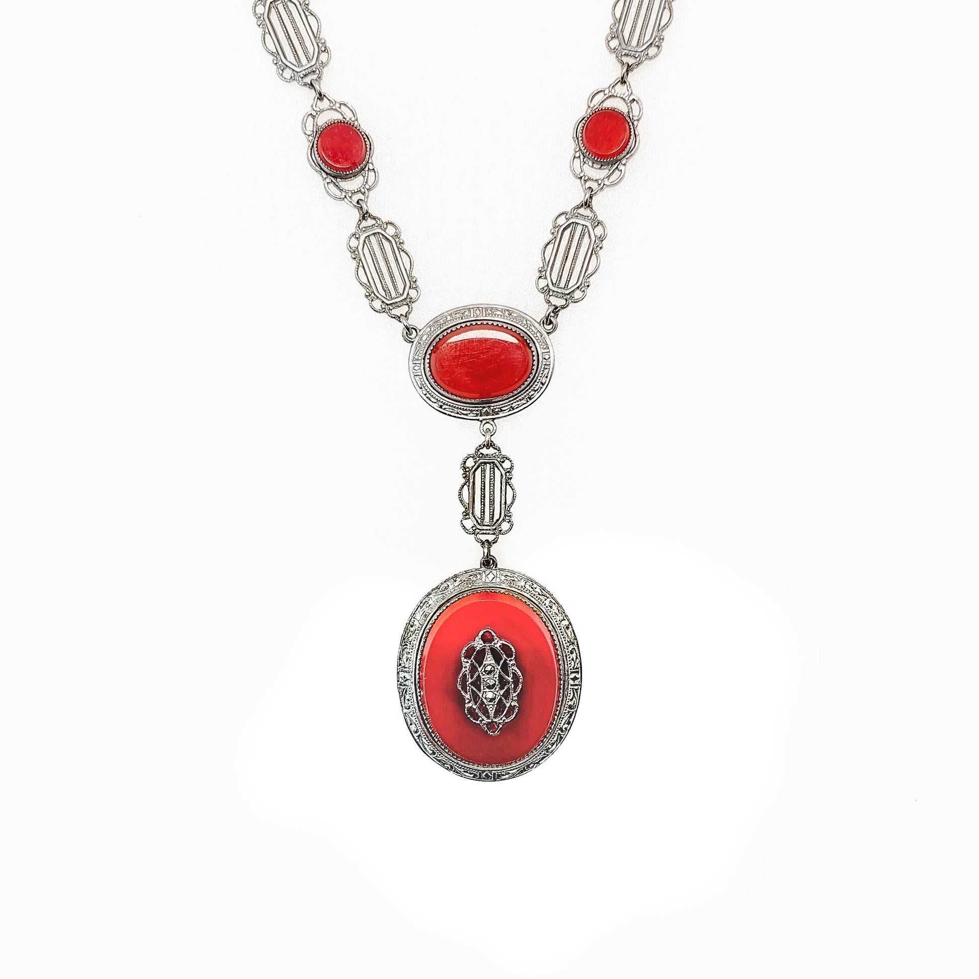 This eye-catching necklace and bracelet set was created in the Roaring ‘20s. It features a dramatic drop pendant set with vibrant brownish-red glass and marcasites on silver plate. The delicate Art Deco filigree resembles elegant lace, while the marcasites add sparkle. This is a beautiful accessory for all occasions and ages!