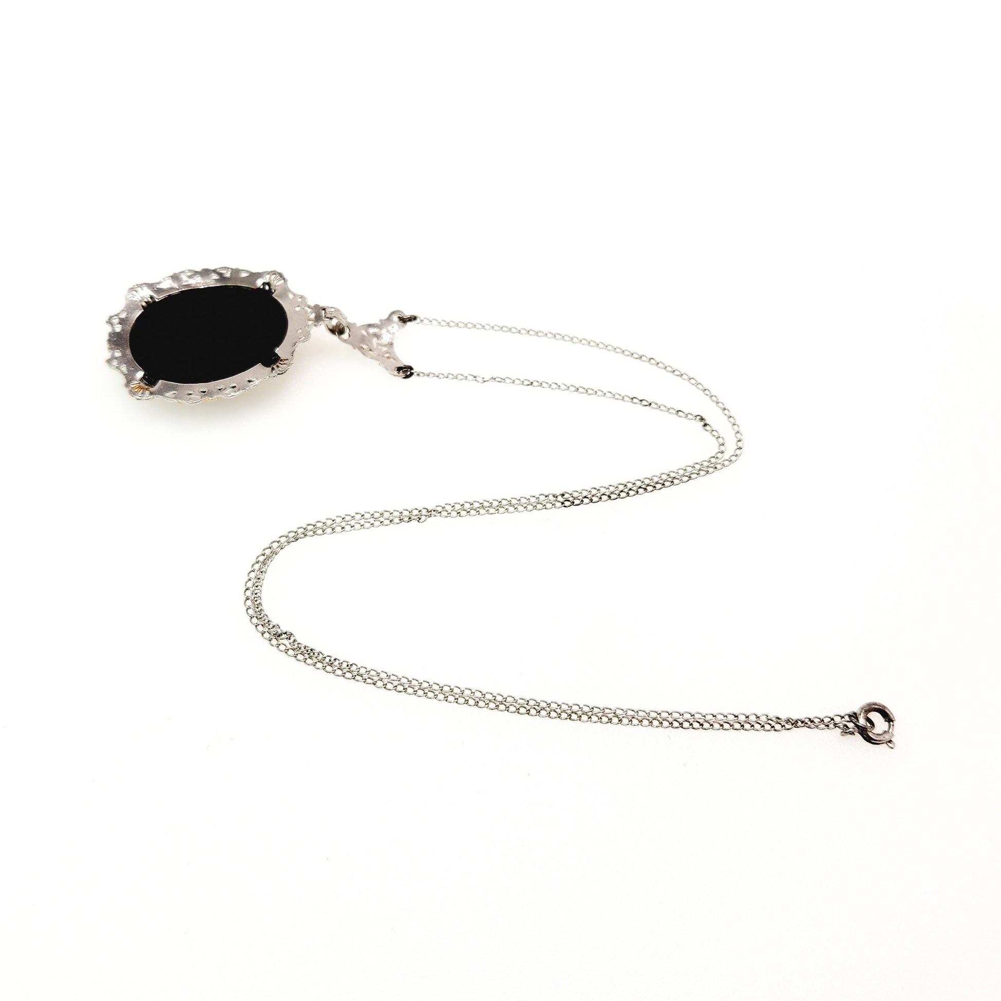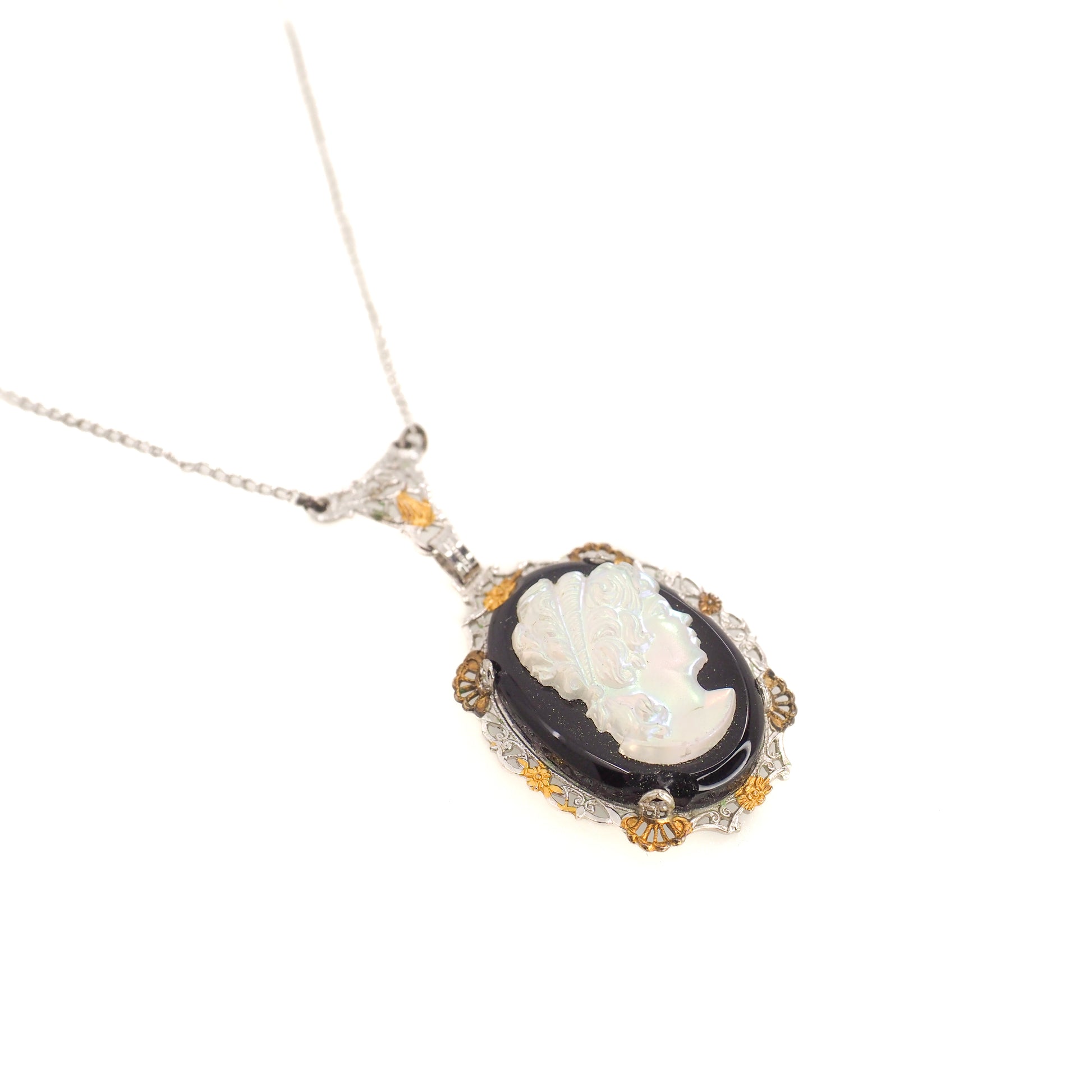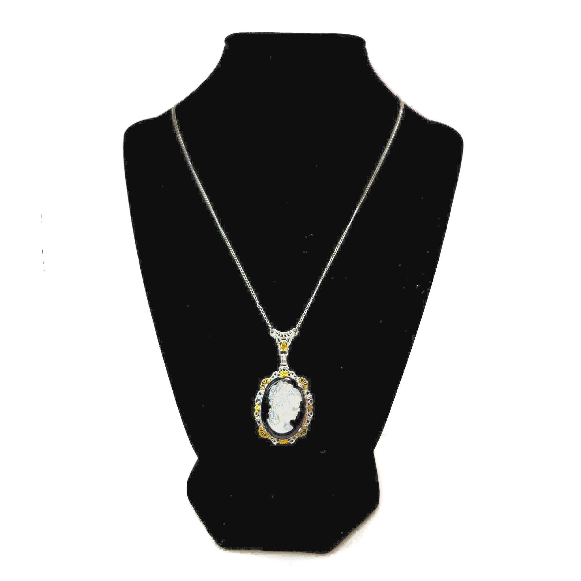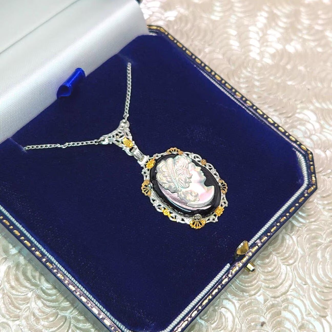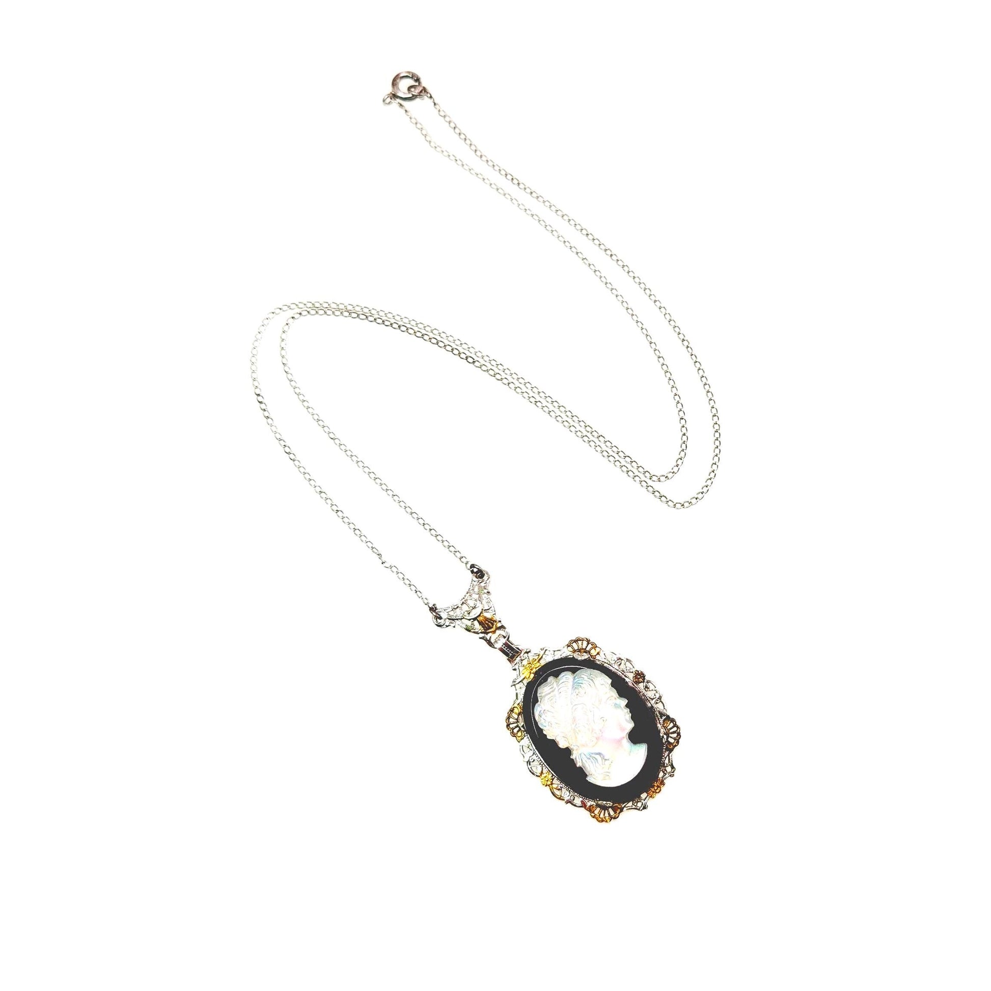 Elevate your style with this exquisite antique necklace, a true embodiment of the roaring 1920s era. Adorned with a mesmerizing iridescent woman on black onyx, this imitation cameo necklace offers a captivating blend of vintage charm and Art Deco opulence. Its intricate sterling silver filigree and gold-plated accents evoke the glamour and sophistication of a bygone era, making it a timeless statement piece for any discerning collector.