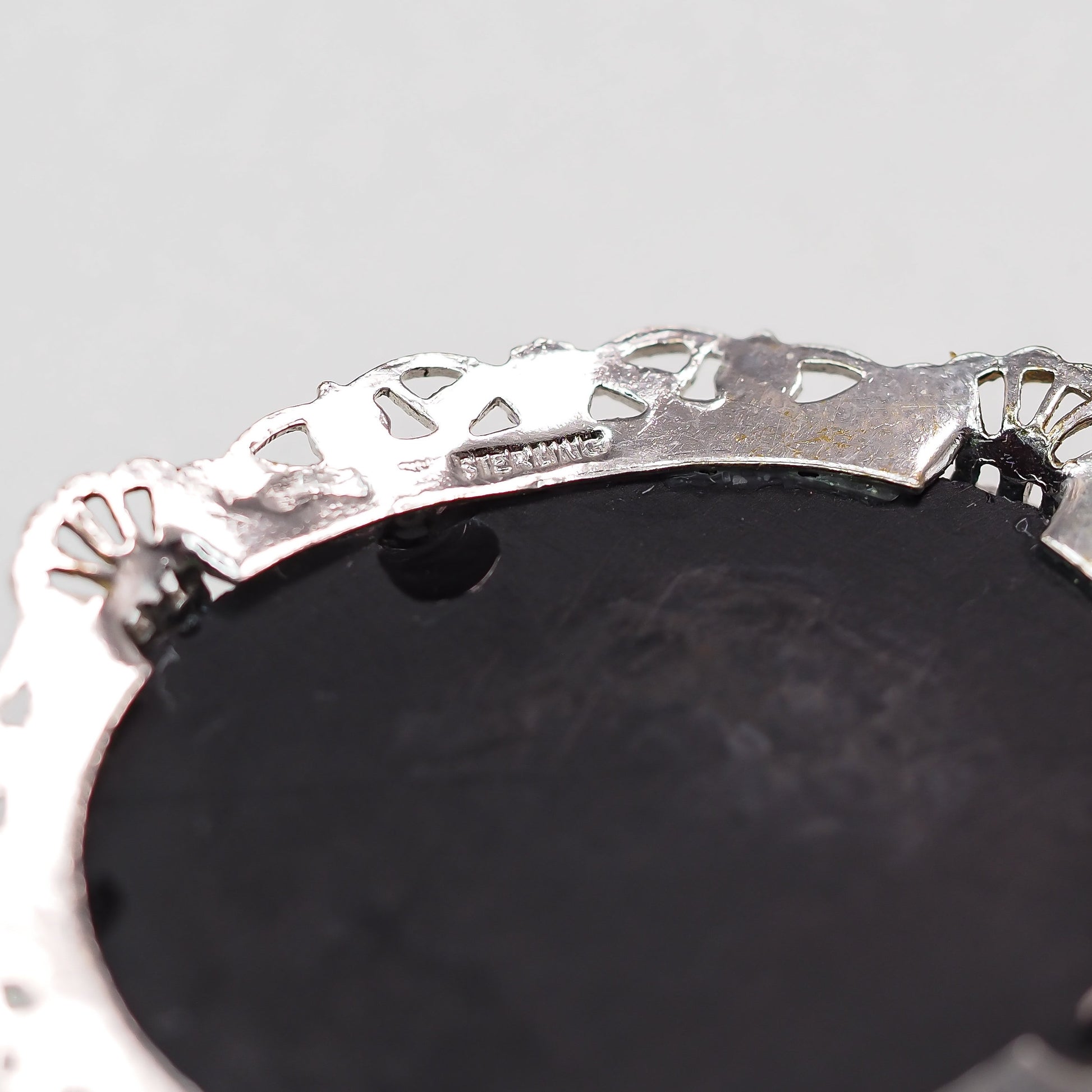 The necklace is in excellent antique condition, displaying only minor signs of wear on the metal and plastic. The imitation cameo has no chips or cracks and has been thoroughly cleaned. The chain is not kinked, and the clasp is fully functional. The back of the pendant is stamped "STERLING." The imitation onyx has a few fine lines and marks, but nothing noticeable or obvious.