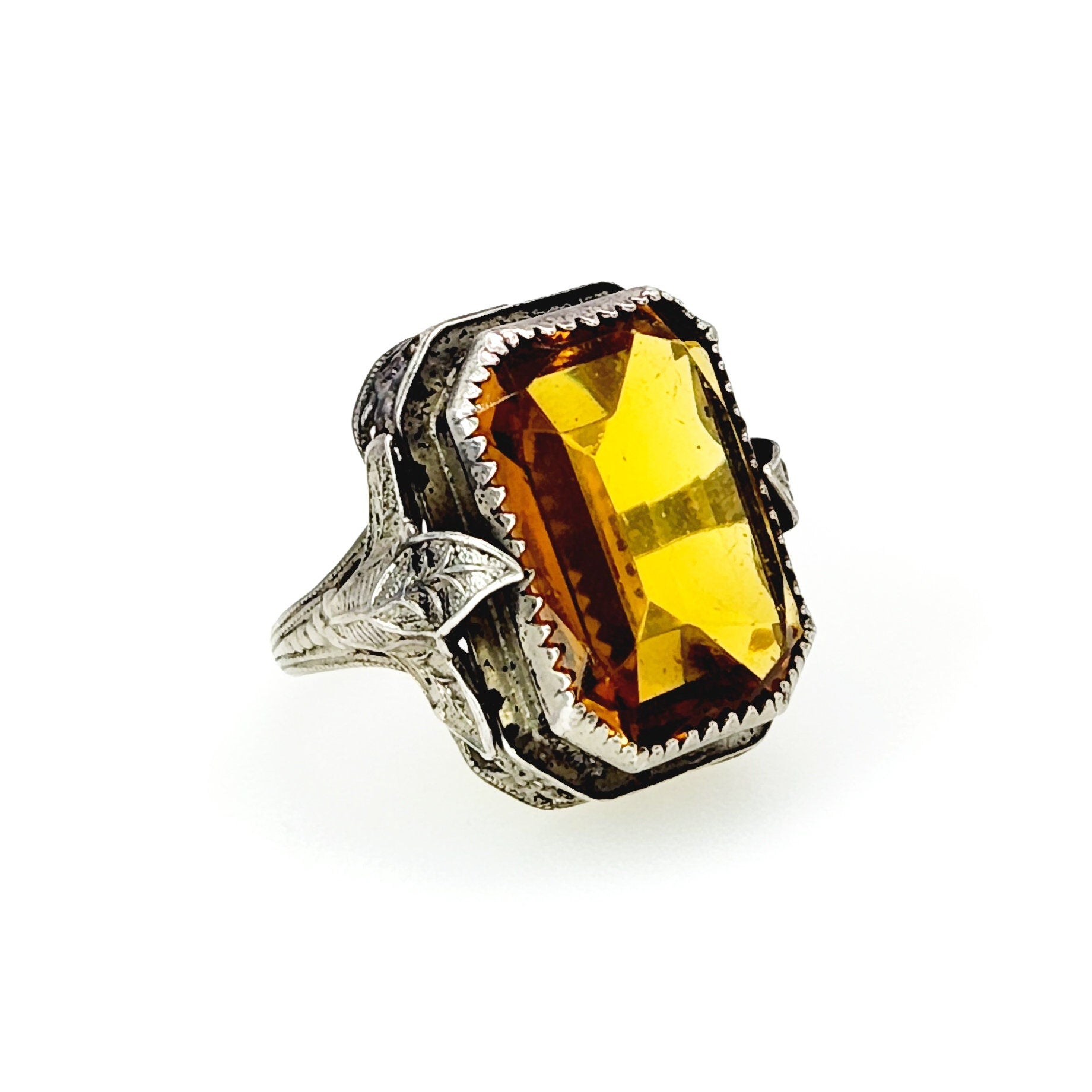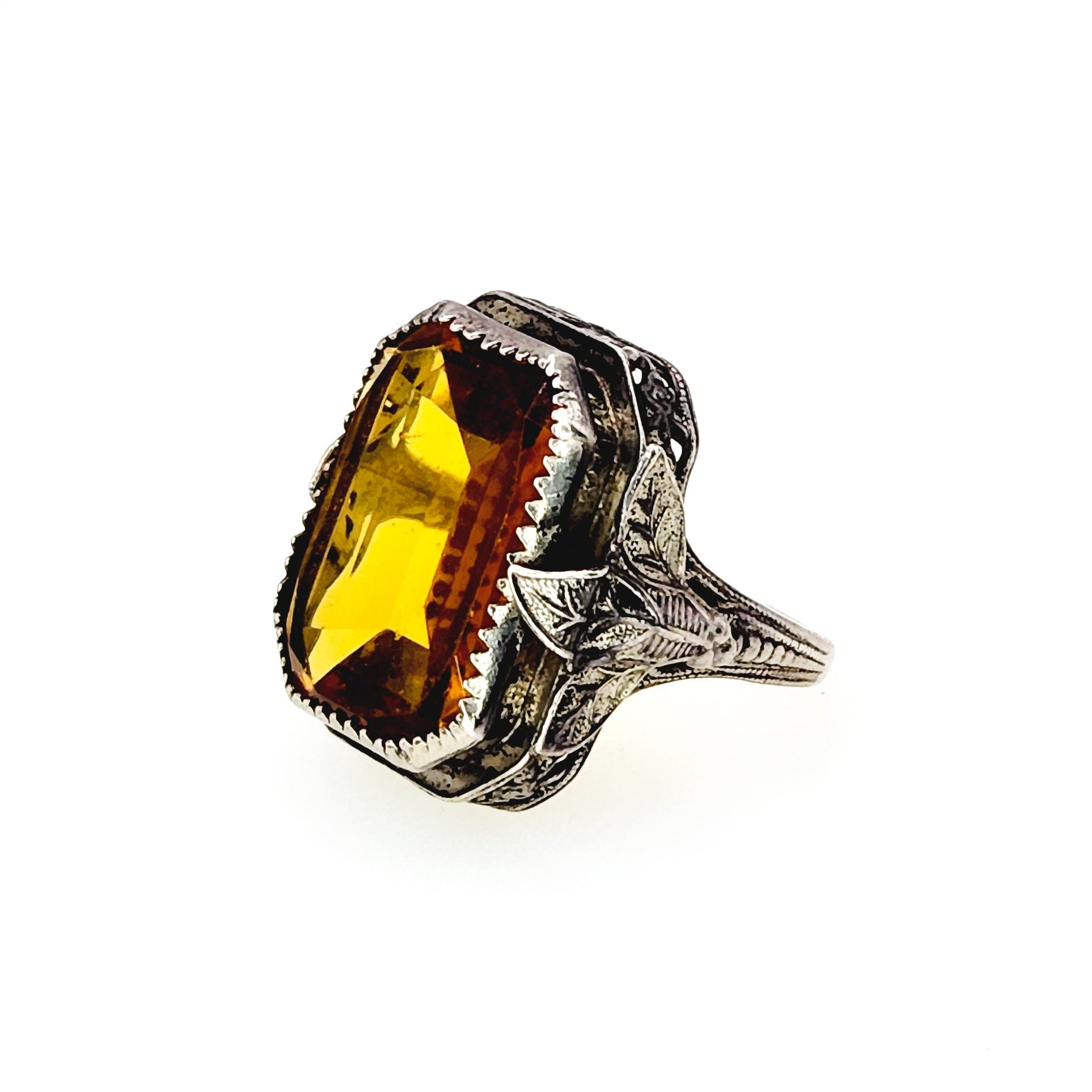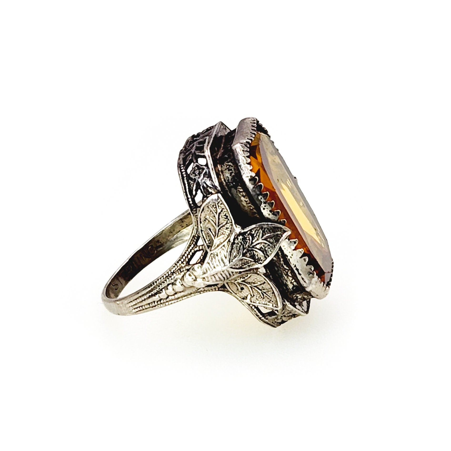 This classic Art deco ring features one large piece of orange glass bezel set into sterling silver. The glass resembles fine citrine, and the delicate silver filigree with foliate motifs complements the stone. A great early 1920s ring to add to your collection!