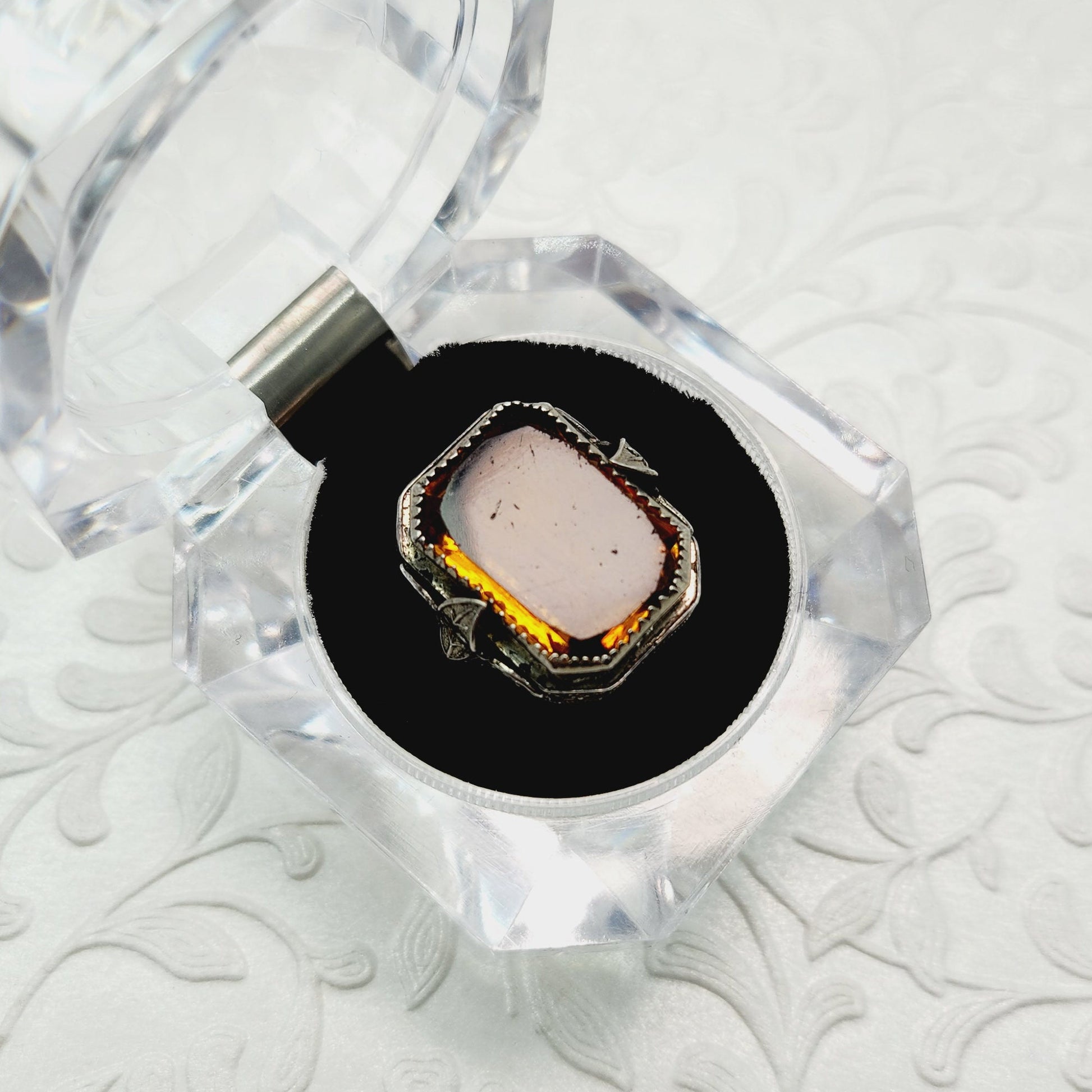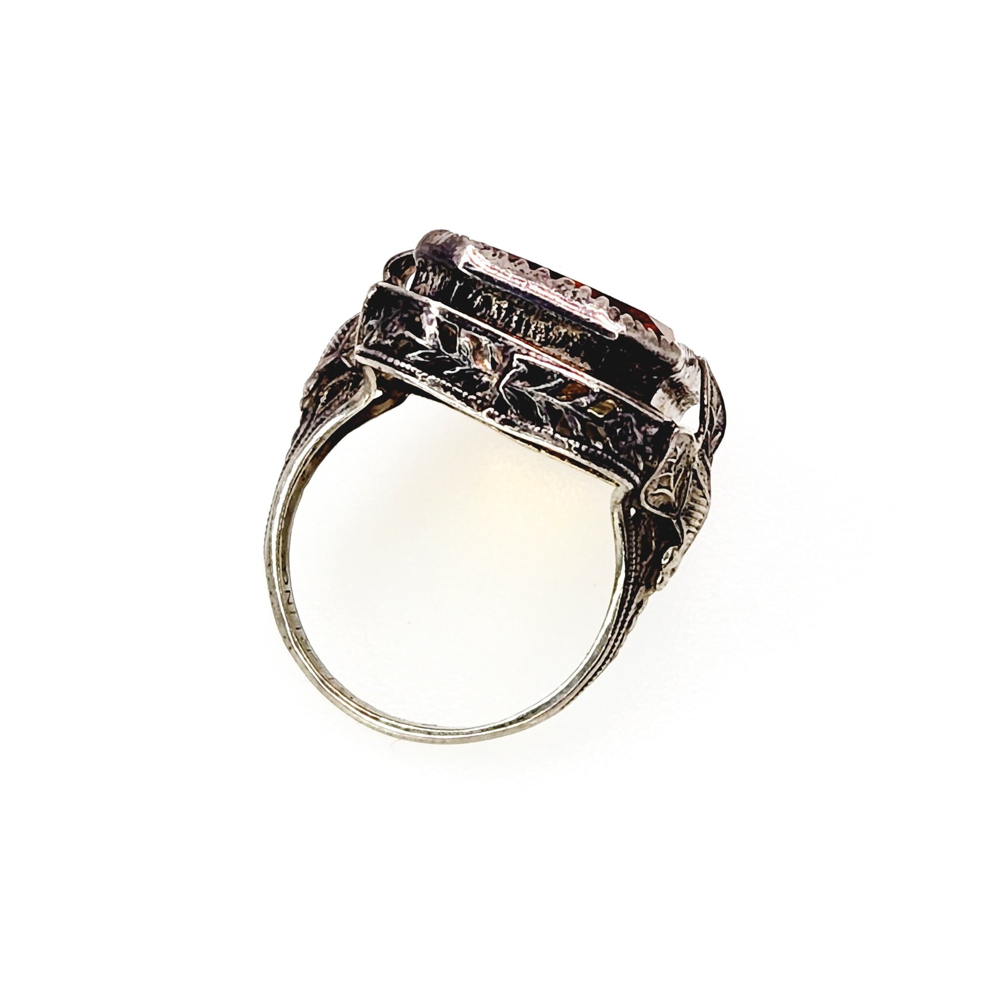 Antique 1920s Art Deco Orange Glass and Sterling Foliate Statement Ring Size 4.25