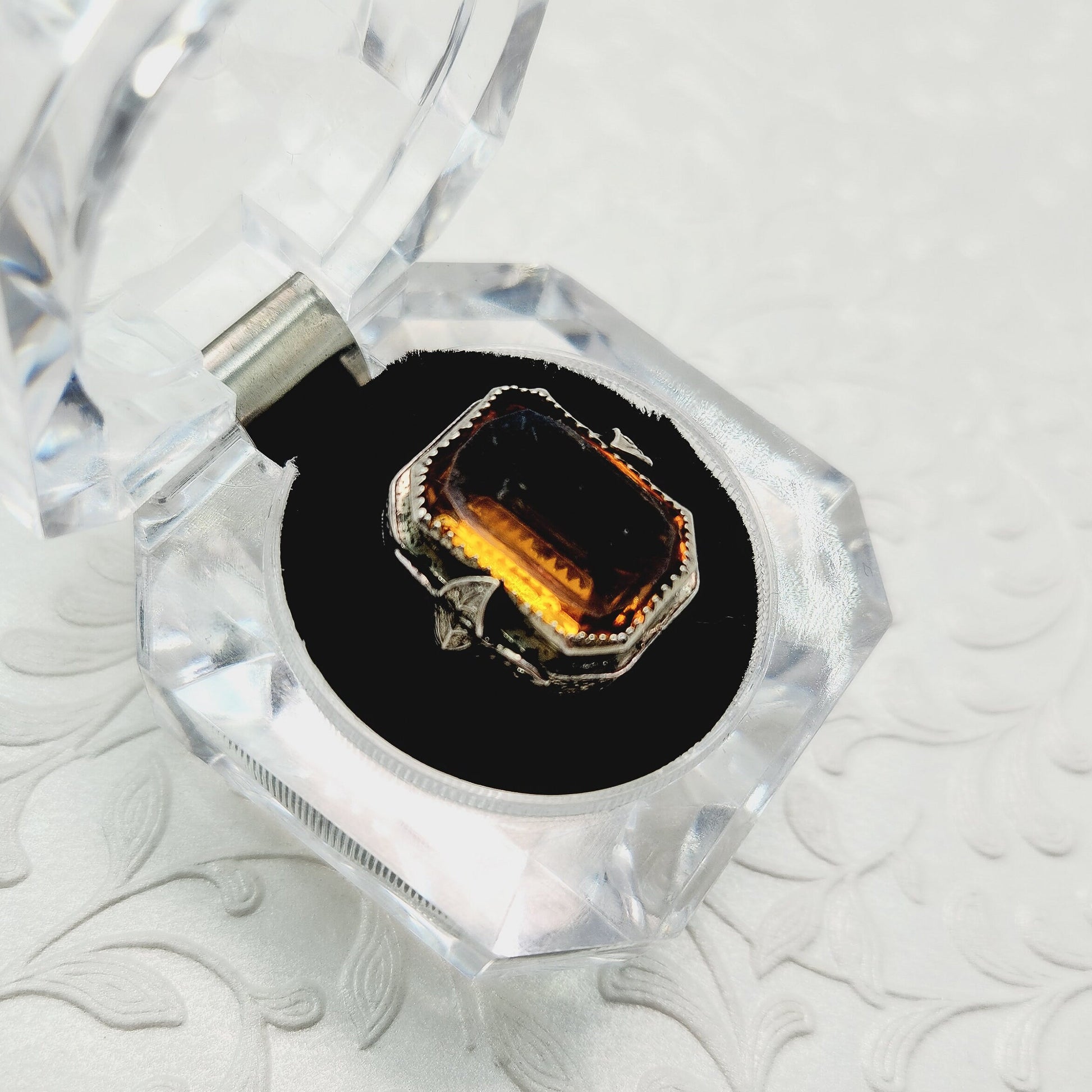 The ring is a size 4.25 and can be sized. The top of the ring measures 13/16" tall by 5/8" wide and weighs 6.19 grams. The box is for display only.