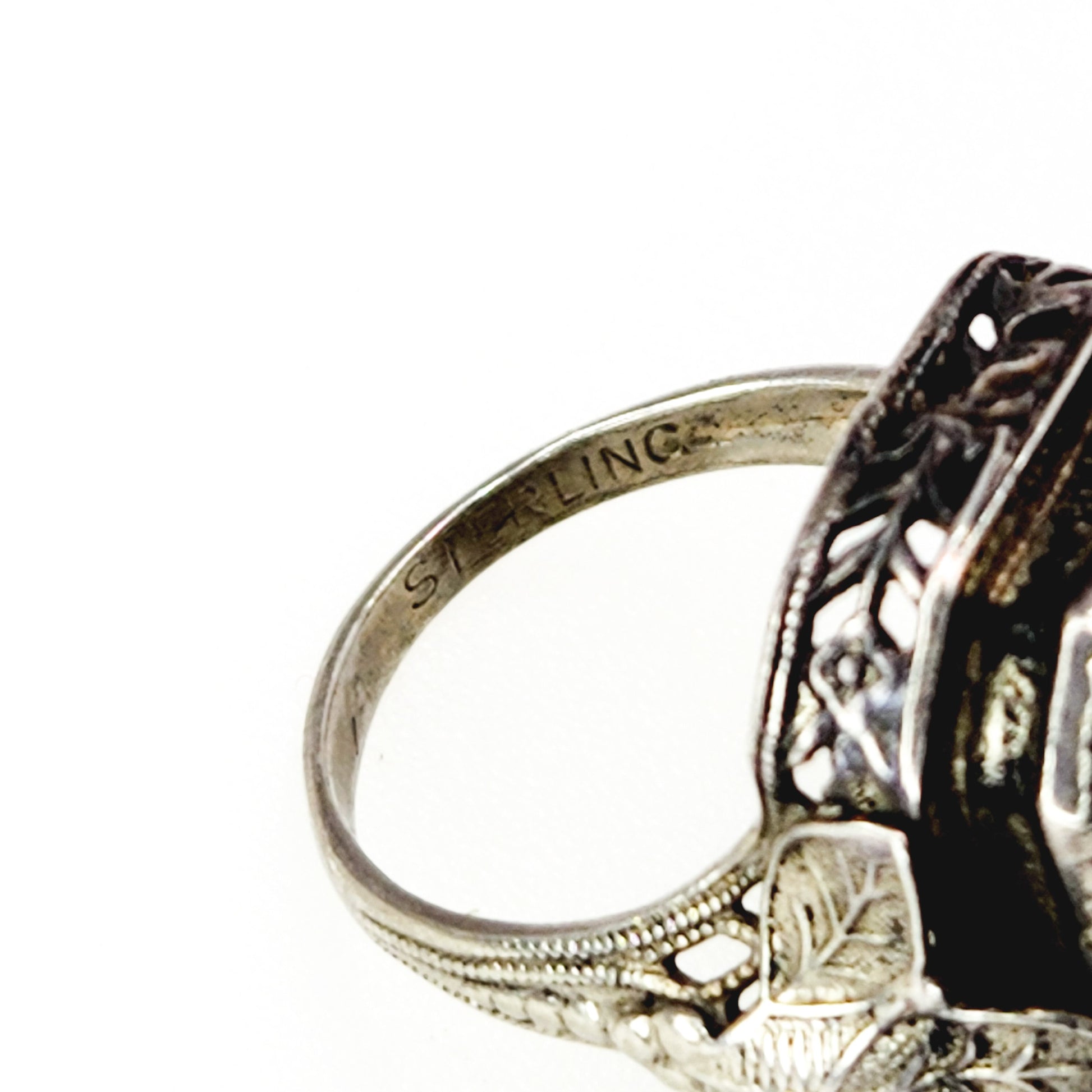 The ring is in good antique condition with minor signs of wear. The glass has a few light lines and tiny pits from the table. This isn‘t noticeable but is shown in the photographs. The glass is not chipped, cracked, or loose in the mounting. The silver has a moderate layer of patina that can be polished upon request. The band is stamped STERLING, and there are noticeable scratches on the inside.