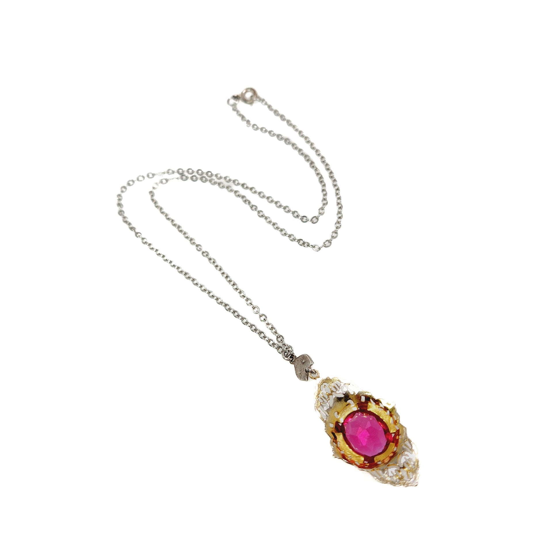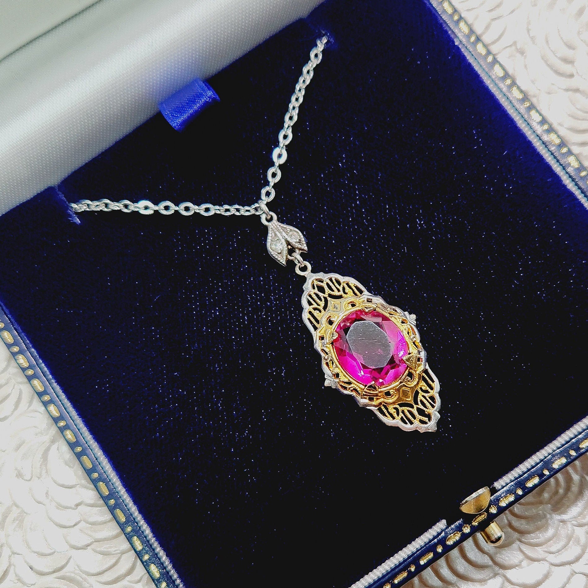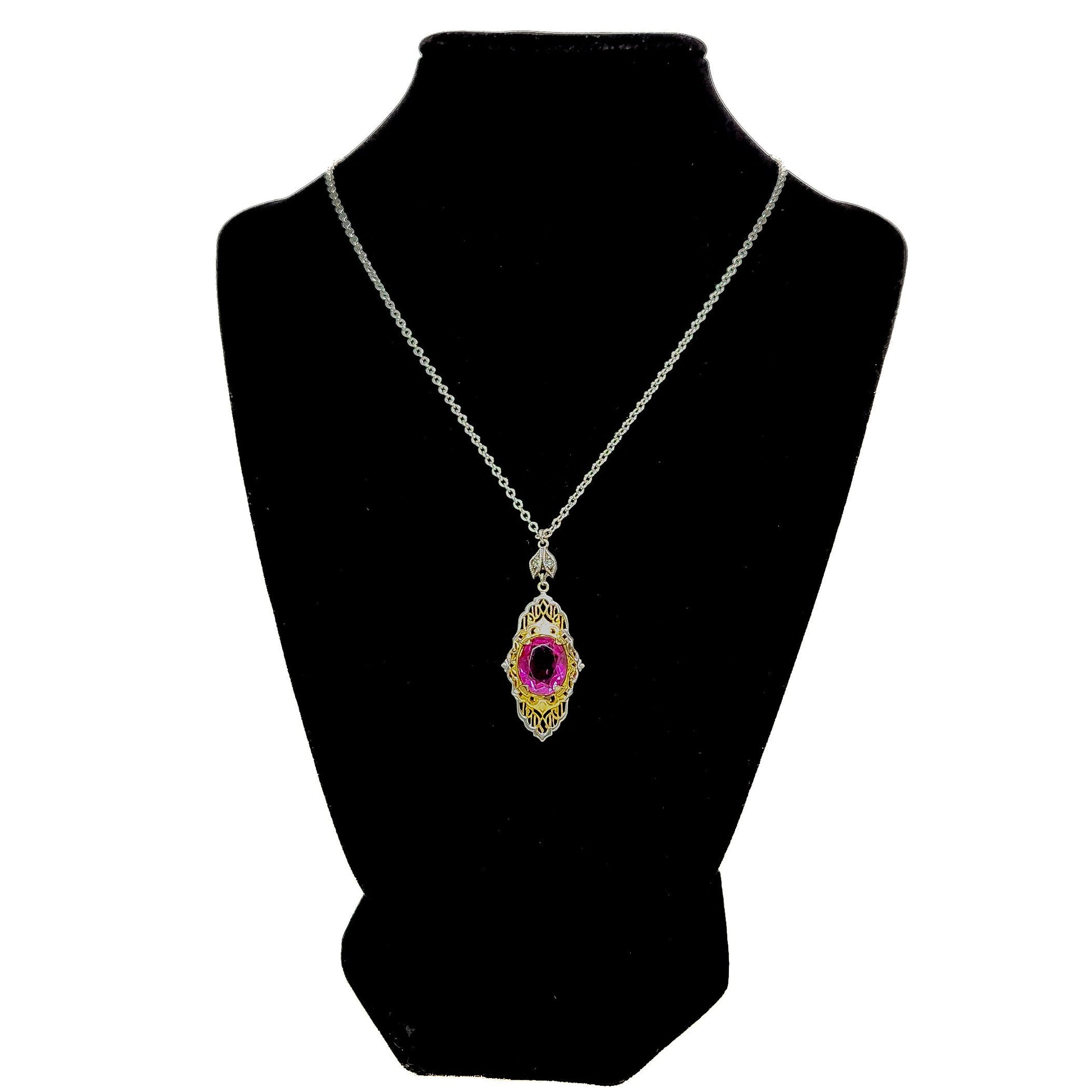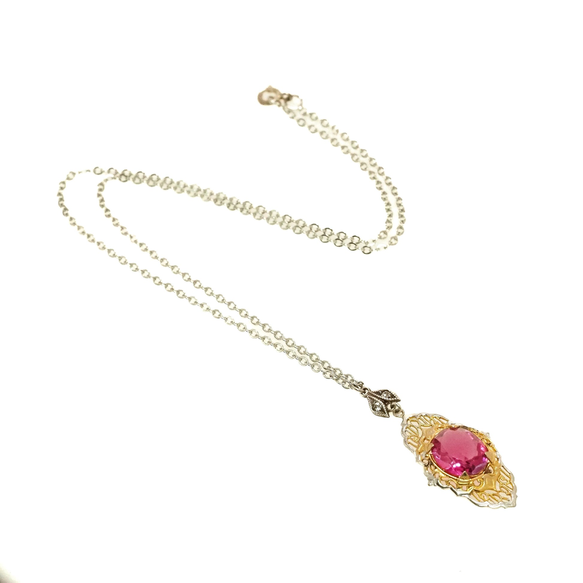 Transport yourself to the captivating Roaring ‘20s with this eye-catching necklace boasting a striking drop pendant adorned with vibrant pink glass. The intricate Art Deco sterling silver and gold plate filigree evokes the essence of elegant lace, enhanced by charming paste and leaf accents that heighten its feminine allure. Whether for a formal affair or casual event, this beautiful accessory effortlessly complements any occasion and suits all ages with its timeless charm.