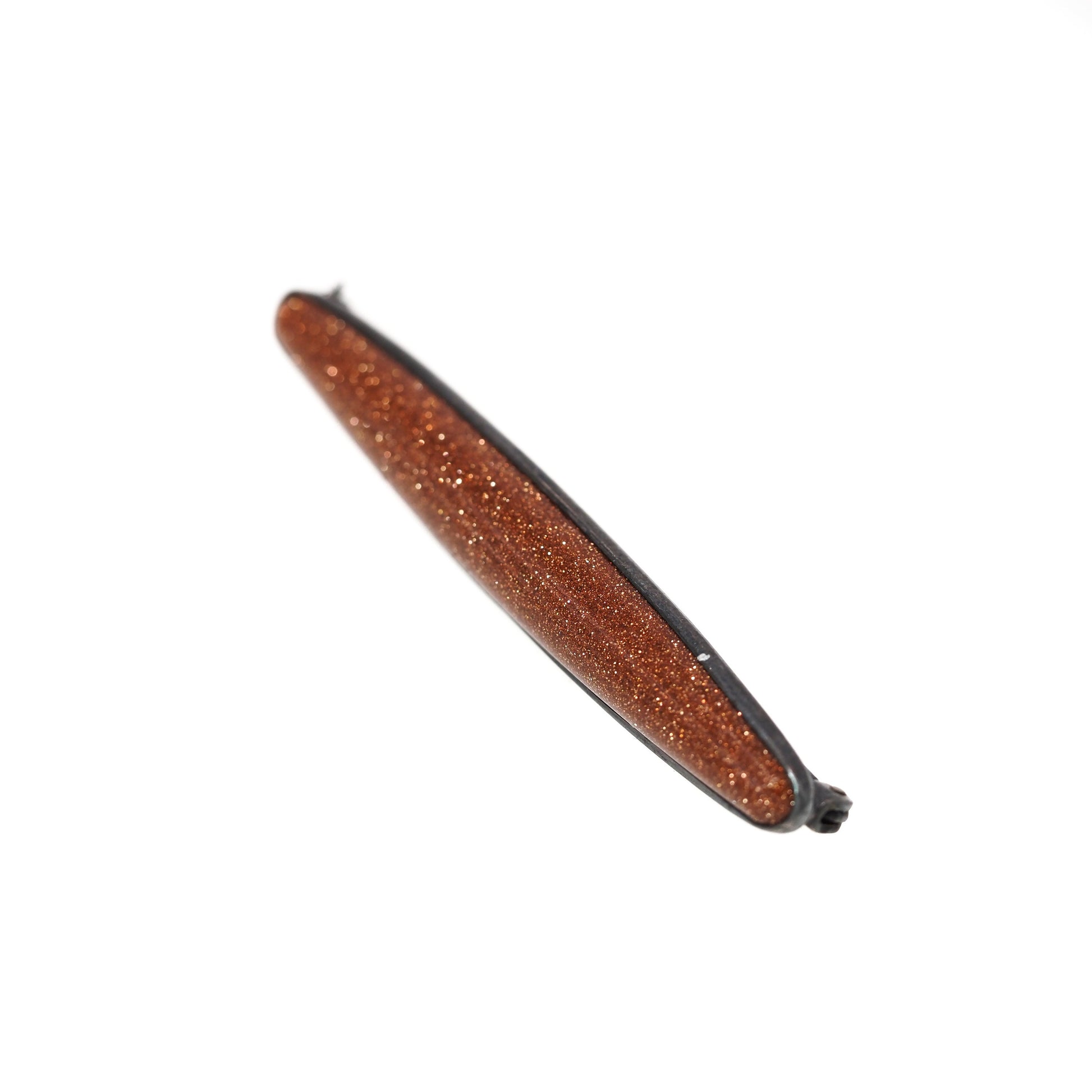 This sparkly and fun goldstone glass and sterling silver bar pin brooch was crafted in the 1920s. The glass‘s lovely orangish-brown color is complemented by millions of glittering copper inclusions that add a vibrant sparkle. It's a great Art Deco era piece to add to your antique collection.