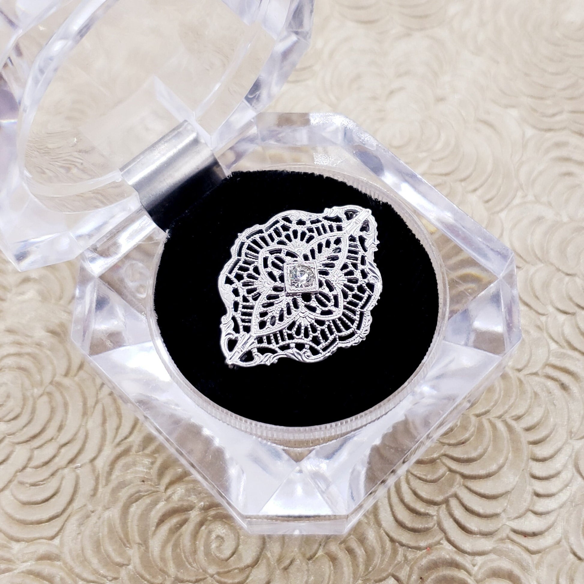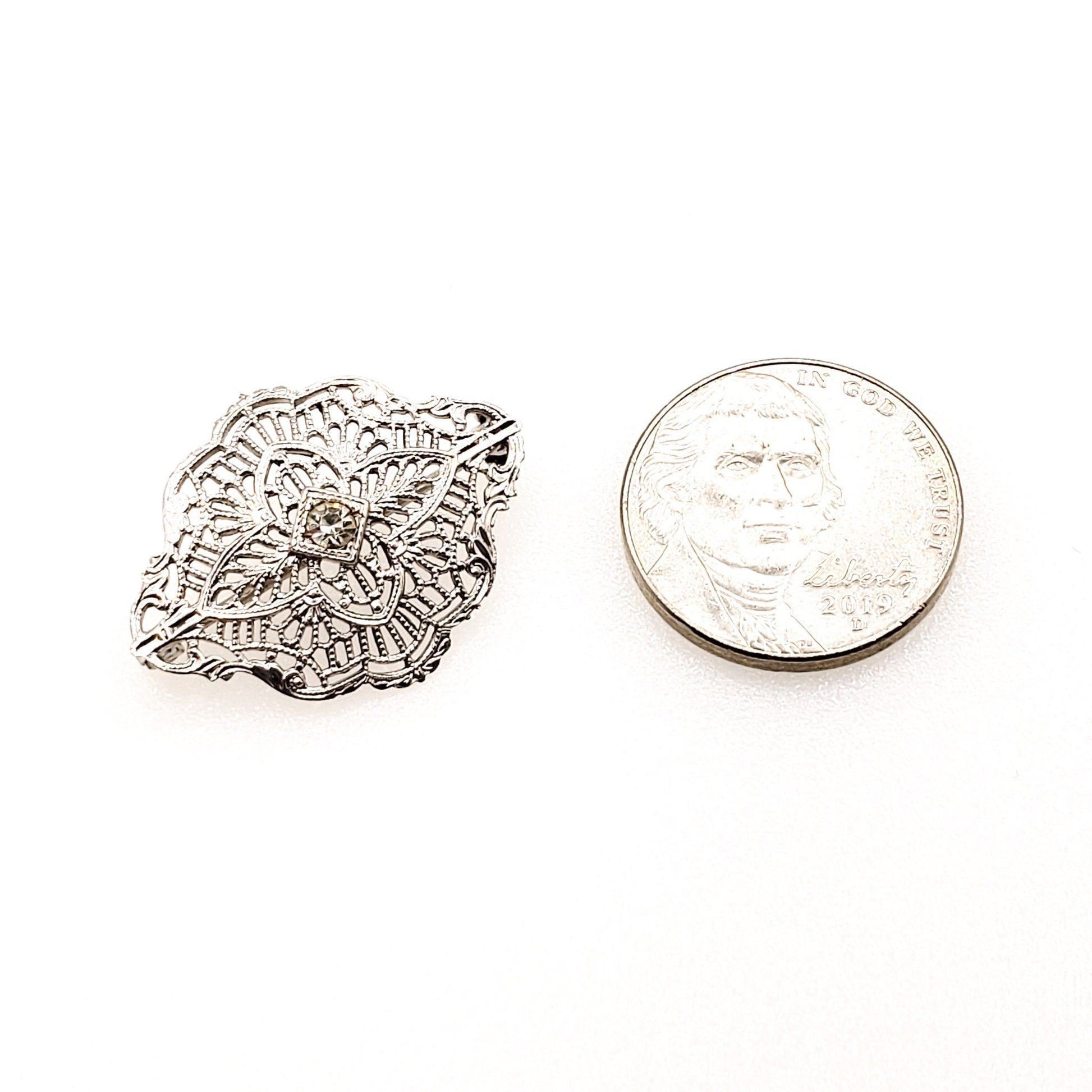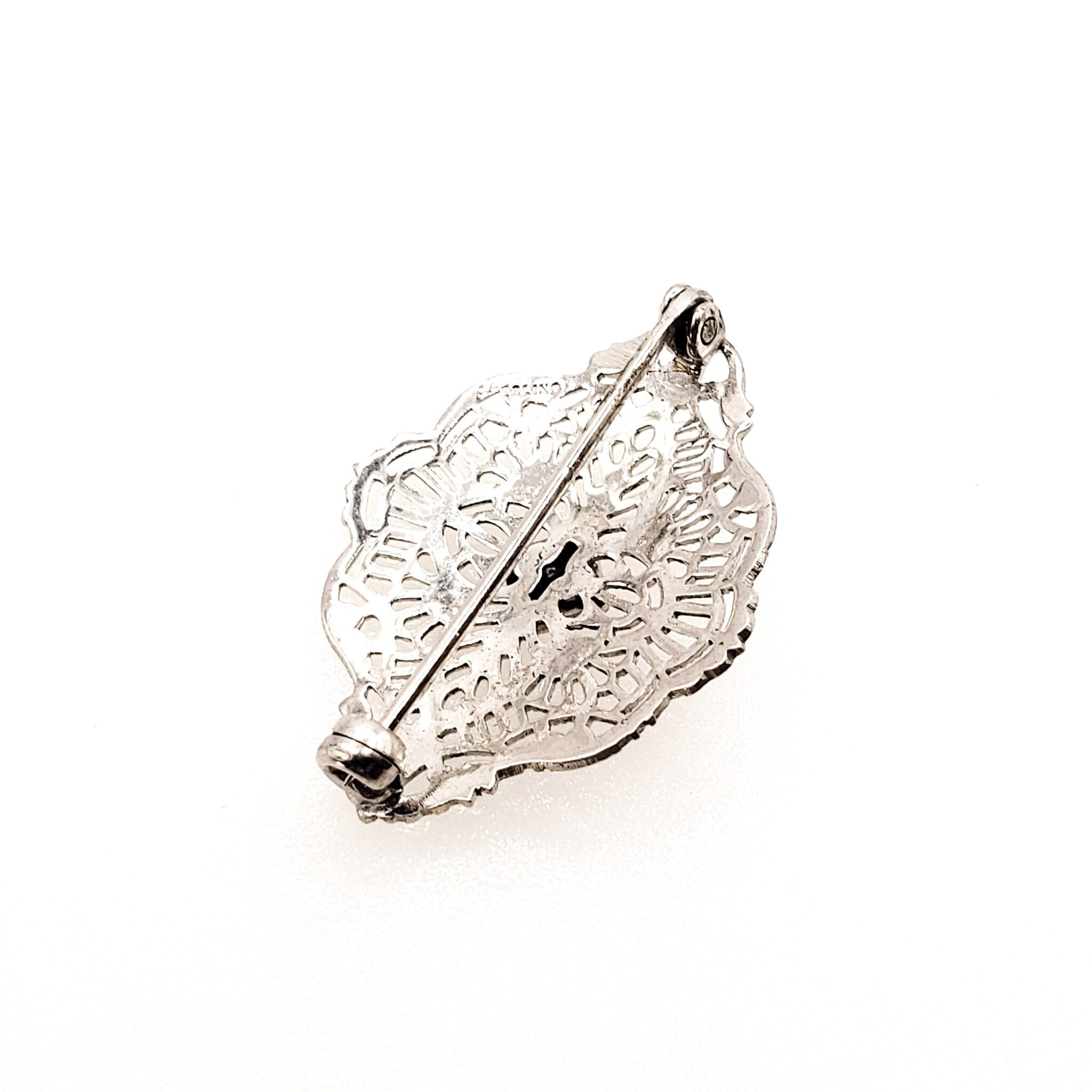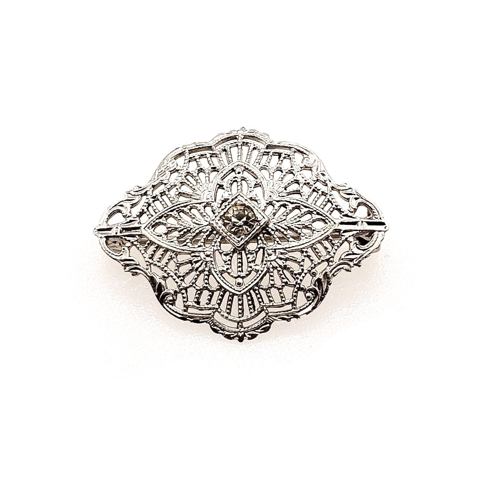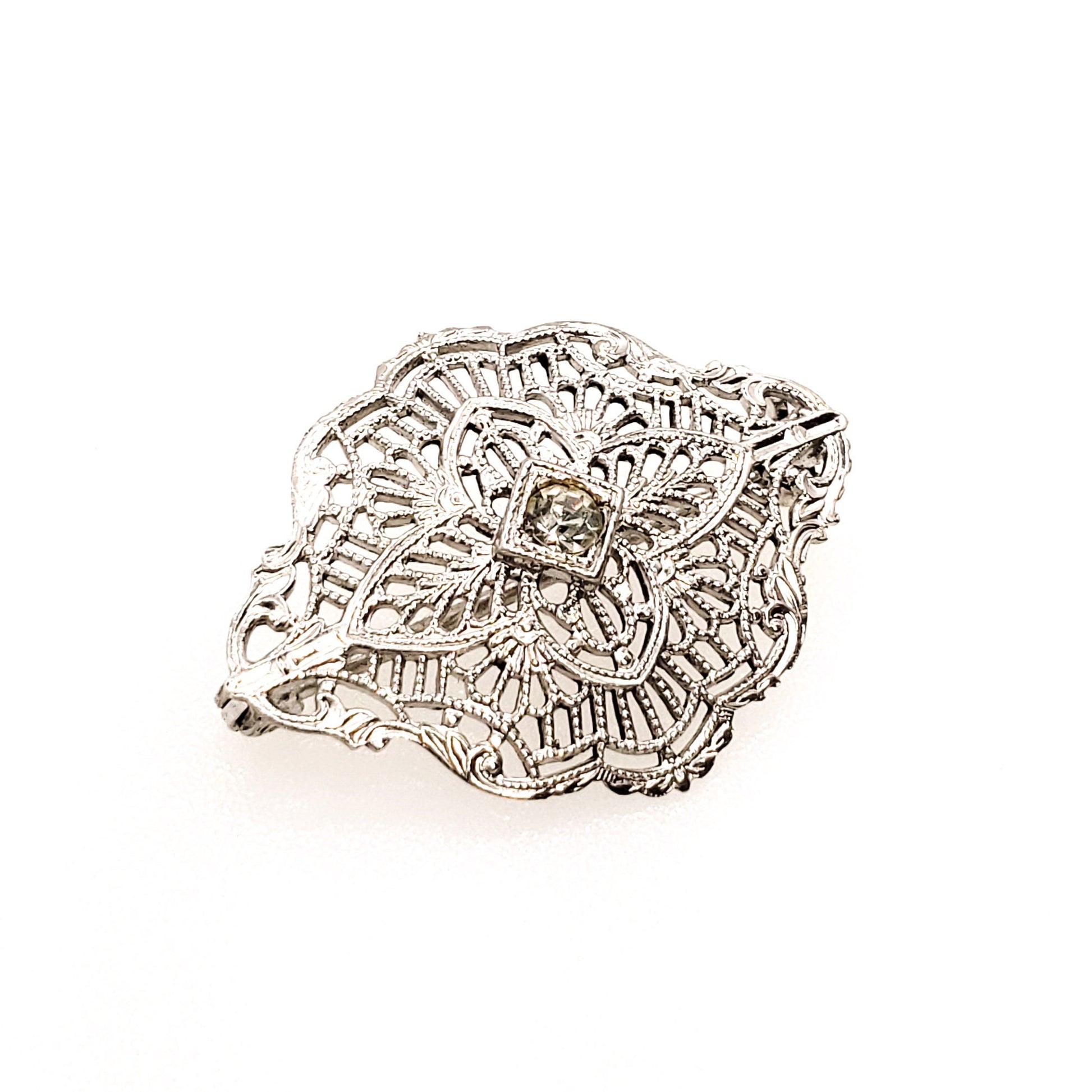 This beautiful Art Deco pin from the 1920s is set with a bright clear glass paste in sterling silver. The intricate filigree silverwork is crafted in an early Art Deco style. A simple and sweet pin for occasions.