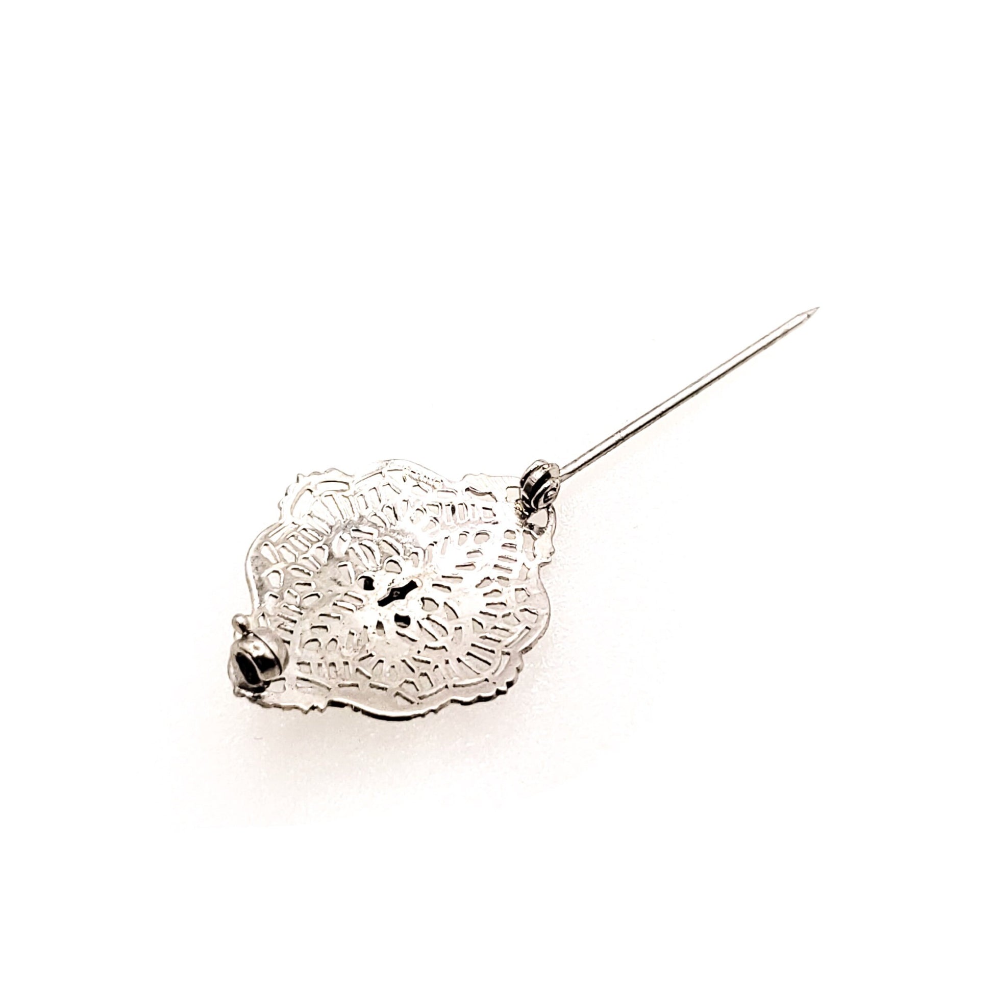 The pin is in very good antique condition with minimal signs of wear on the surface of the metal and glass. The filigree is not bent or warped, and there are no markings on the brooch. The rhinestone is not chipped or cracked.