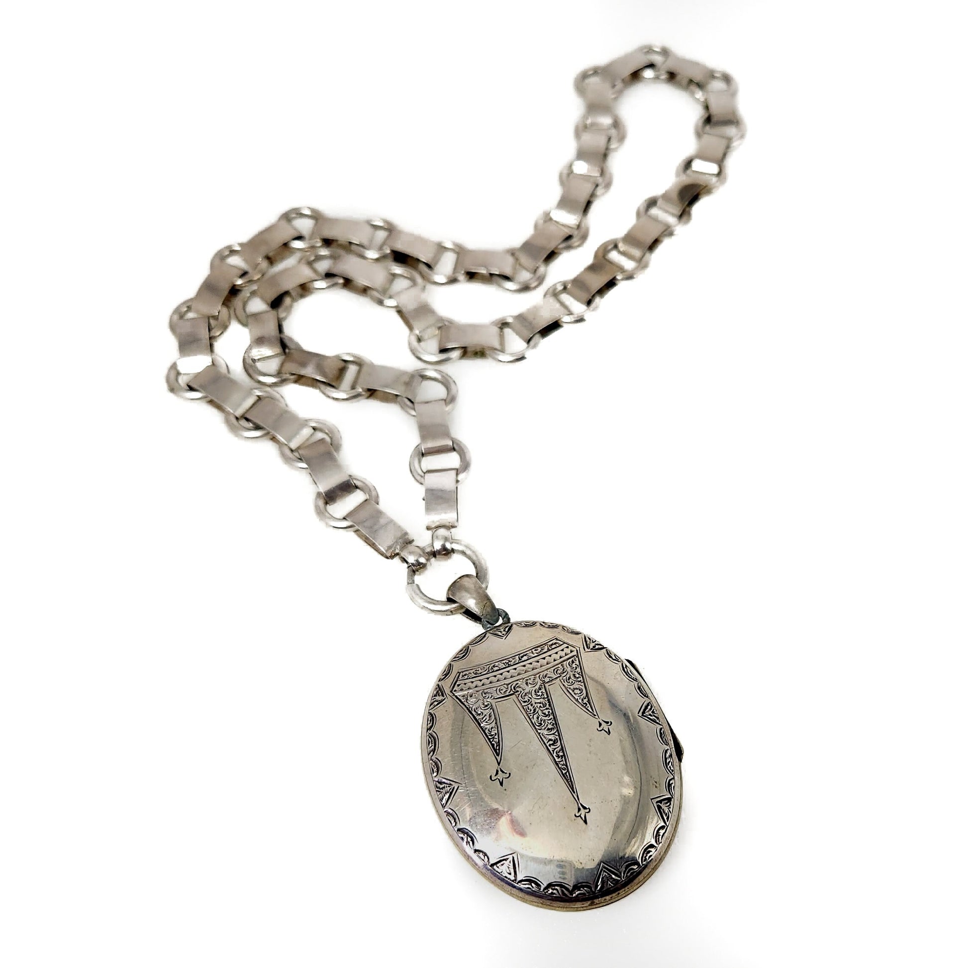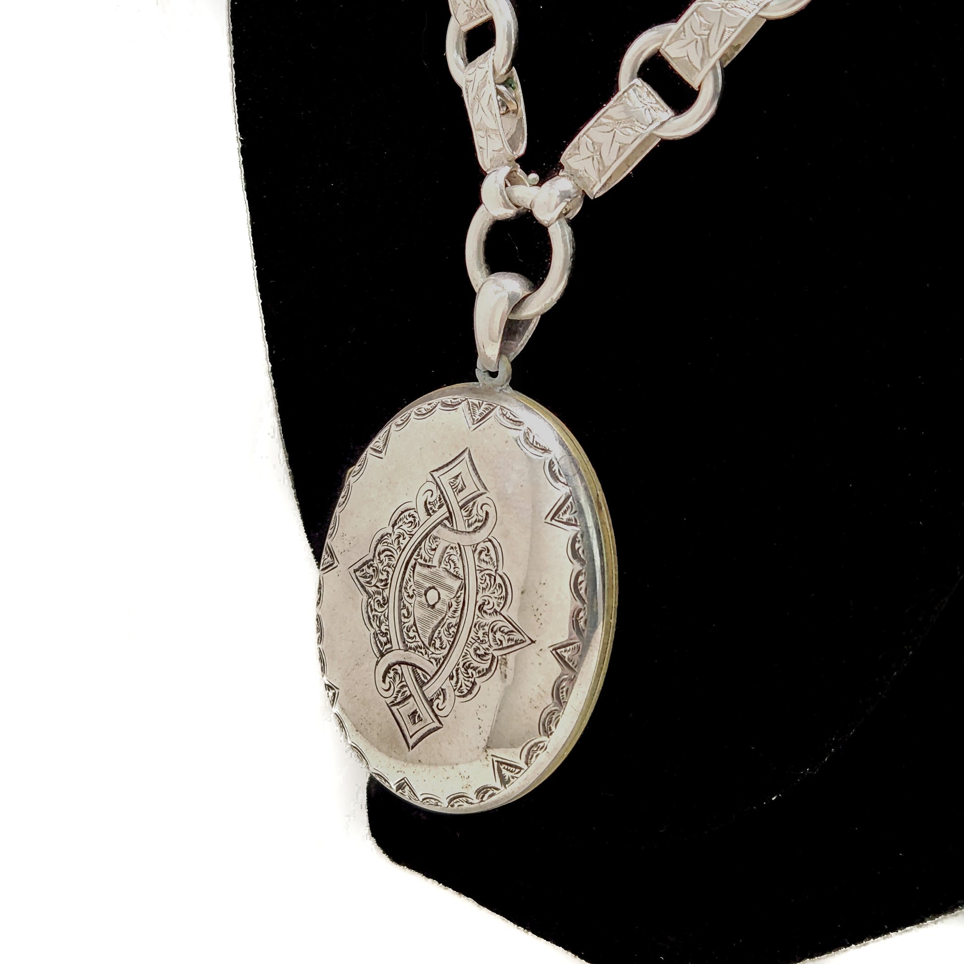 This chunky silver locket-and-book chain from the 1880s is lightly etched with flowing, unique Victorian designs. The large oval locket compartment can hold two photos or a small memento. It's a great mid-Victorian statement piece for your collection!