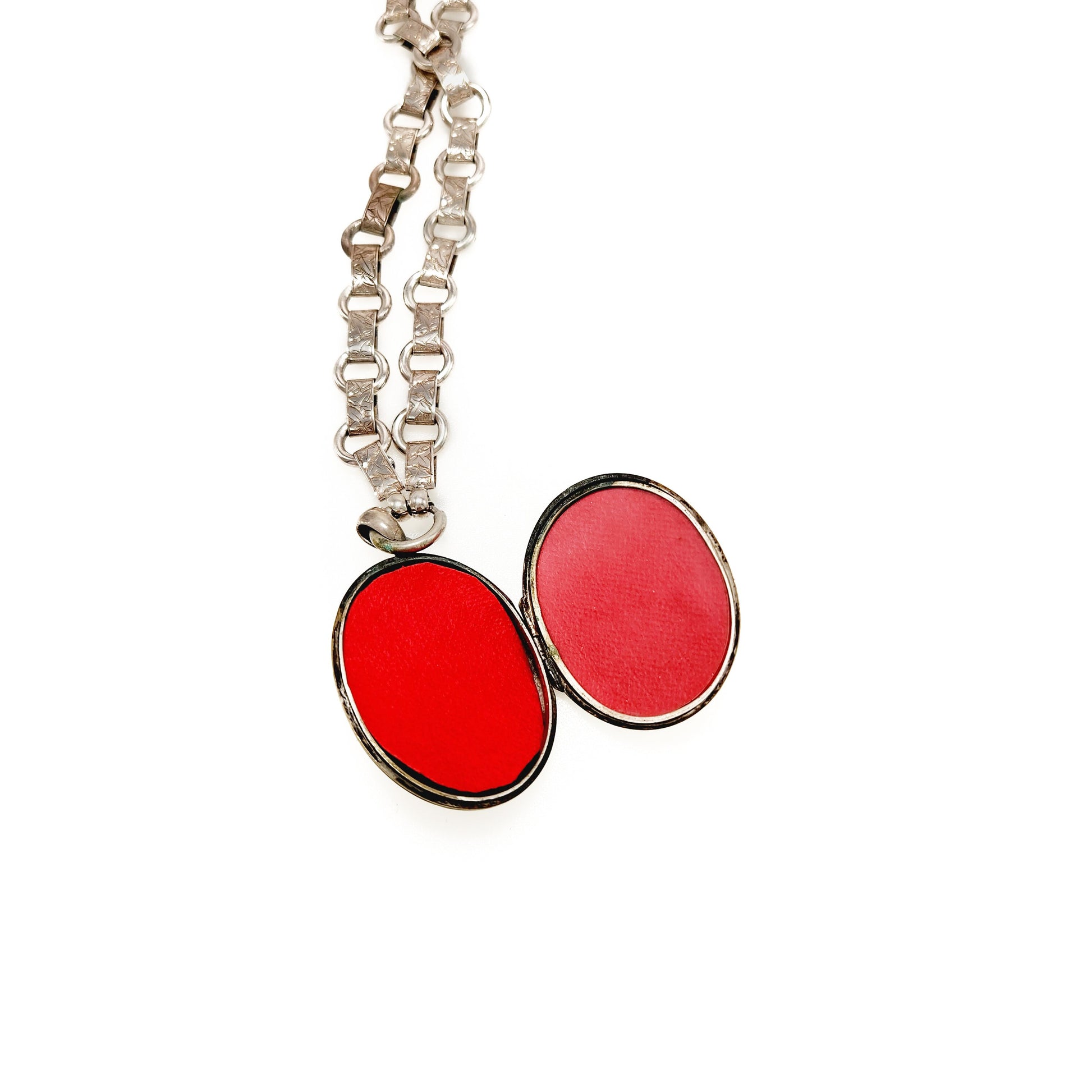 The locket is in very good antique condition with minimal signs of wear. The silver surface has fine lines and scratches from wear, typical of antique jewelry. The locket opens and closes just fine. The inside has a red fabric backing, and one of the glass panels is missing. The locket can hold one photo and/or a small keepsake.