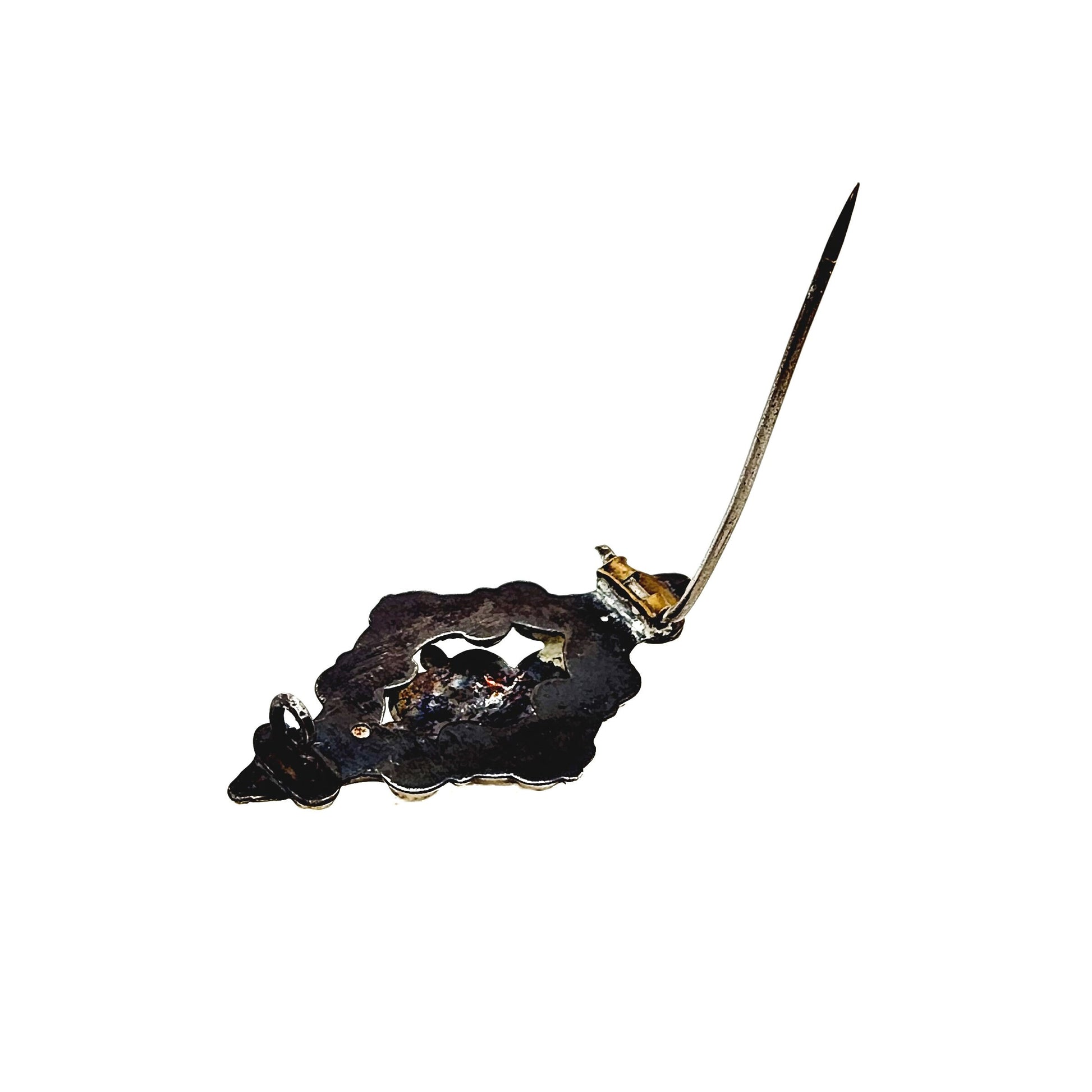 The brooch is in very good to good antique condition with minor signs of wear. The surface of the gold plate features fine lines and marks on the front, which are primarily worn off on the back, exposing the silver base metal. The exposed silver has a heavy layer of patina that can be polished upon request. The garnets have tiny nicks and chips along the facet junctions under magnification. A GIA Graduate Gemologist tested the gemstones. The metal is not stamped or marked. The pinstem, which is slightly bent at the tip, is a later replacement.