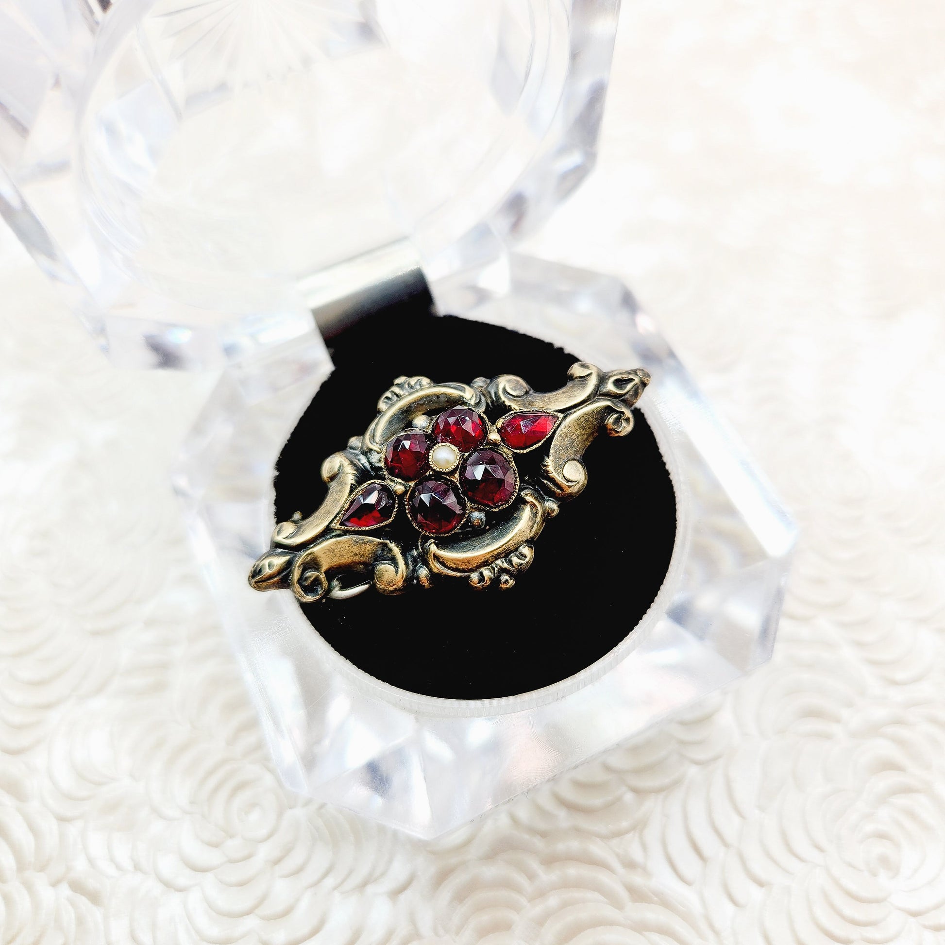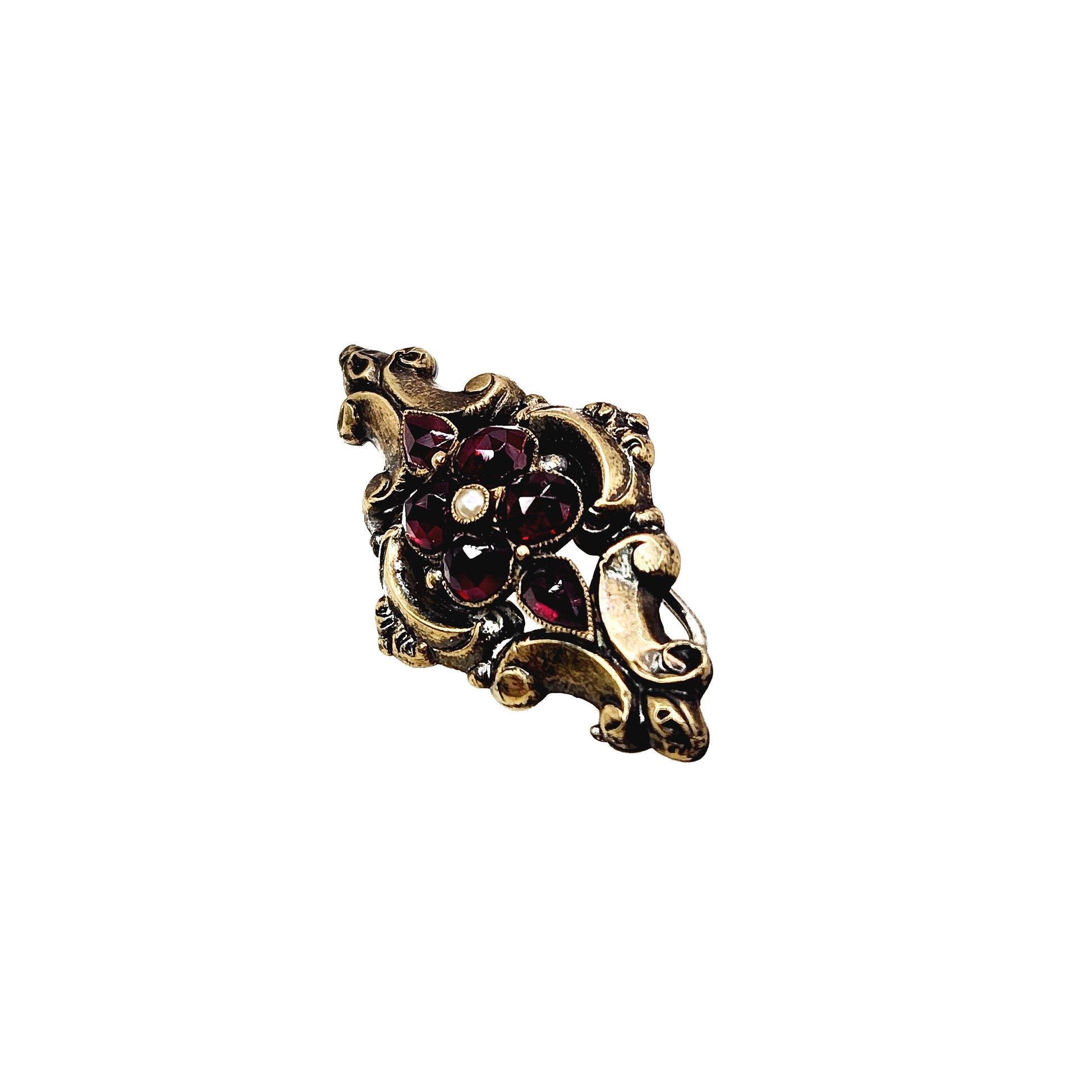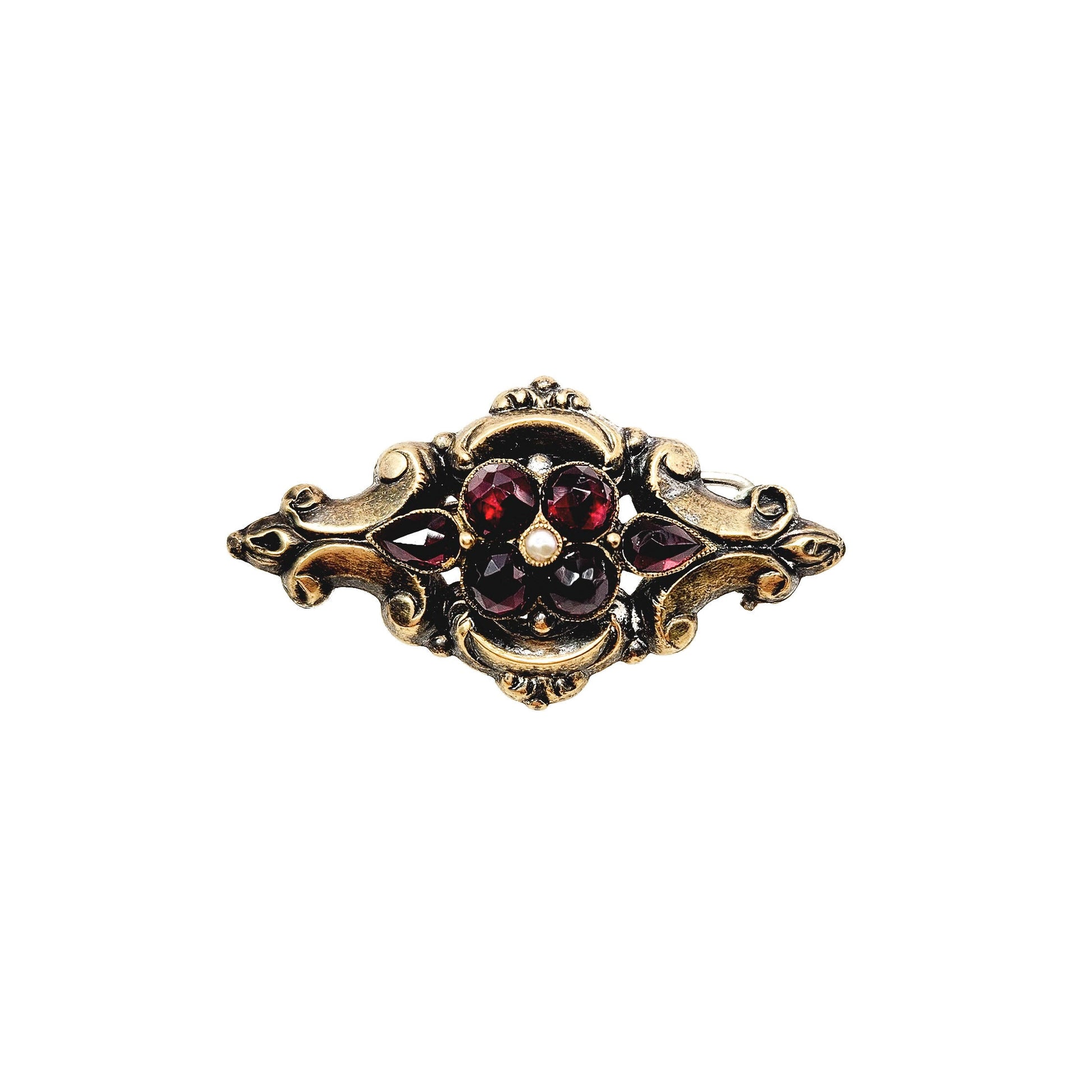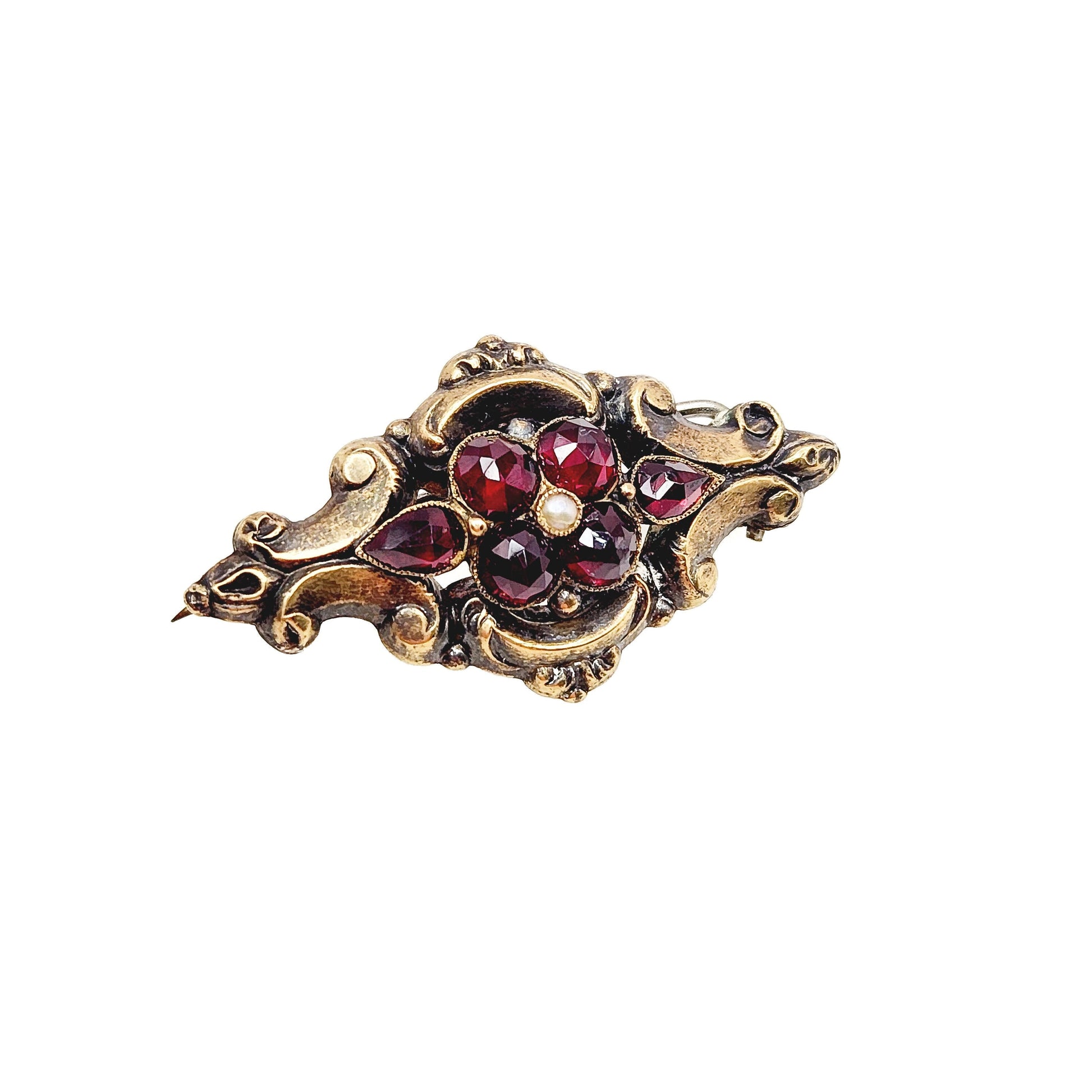 This gorgeous early Victorian Bohemian garnet and seed pearl pin was crafted in the 1850s. The glowing garnets are arranged in a floral motif with a natural seed pearl. The brooch glistens and sparkles in the sunlight, making it an excellent gift for a January or June baby.