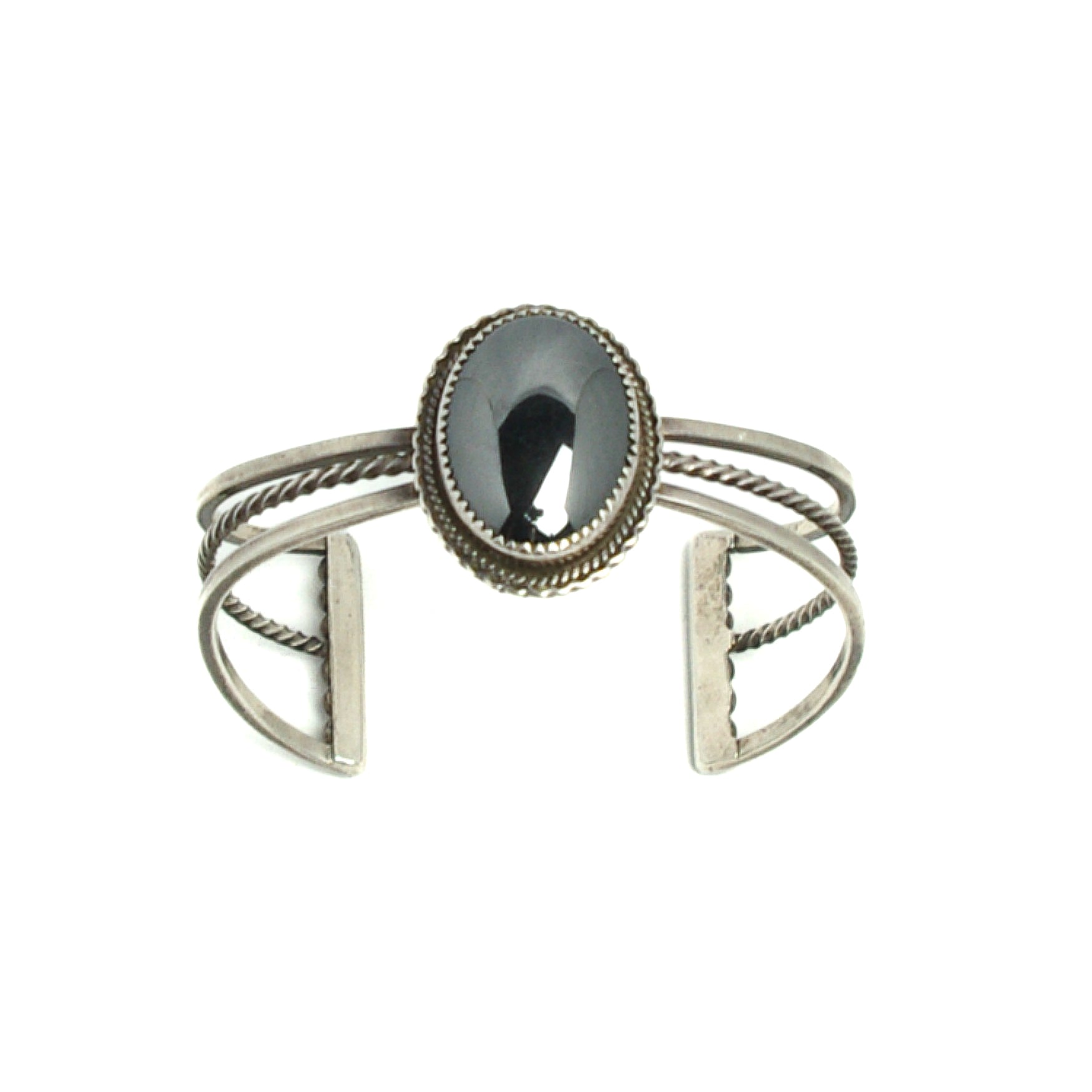 This is a fabulous vintage 1970s hematite and sterling silver Native American statement cuff. The large hematite cabochon is a sawtooth bezel set into the cuff, formed by three split bands. The typical ropework design around the hematite and along the cuff adds a beautiful design element.