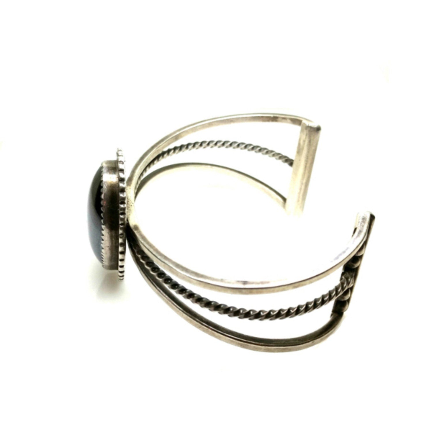 Vintage 1970s Hematite Cabochon Sterling Silver Rope Native American Gemstone 6.5" Cuff Bracelet