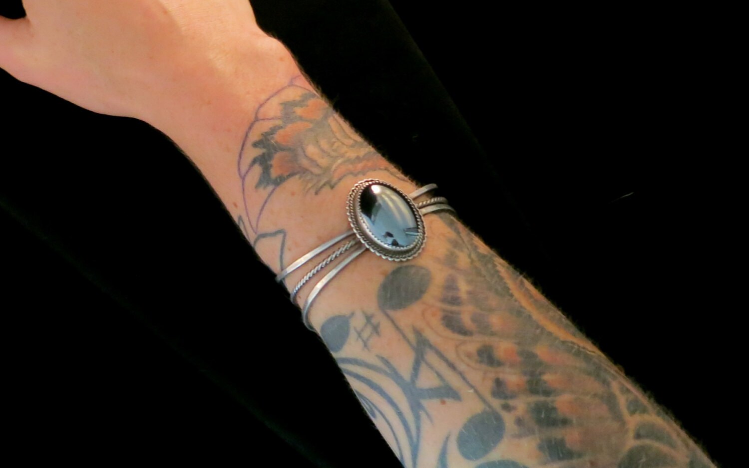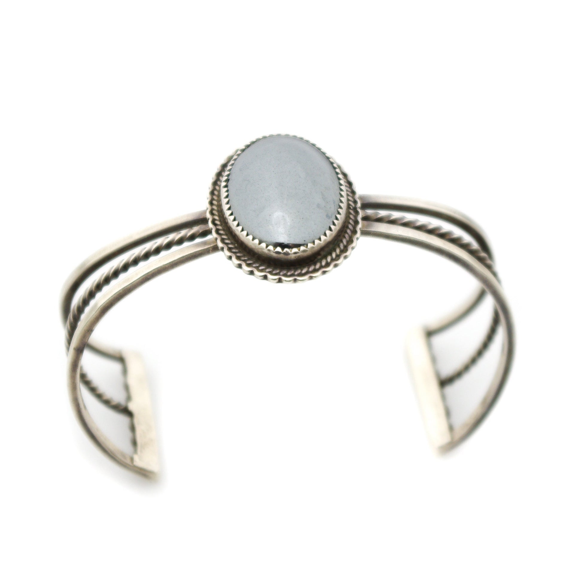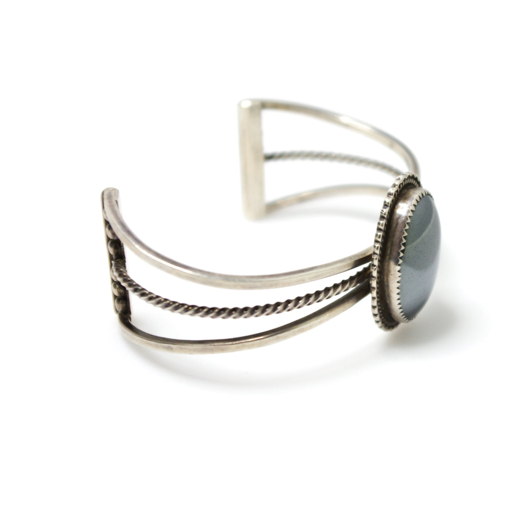 The cuff is in very good vintage condition with minimal signs of wear. The silver has a moderate layer of patina that can be polished upon request. The bracelet had marks on the back, which were polished off. The hematite is in very good to excellent condition, with no signs of cracks or chips in the stone. Since the unmarked cuff, the silver was tested to be sterling silver.