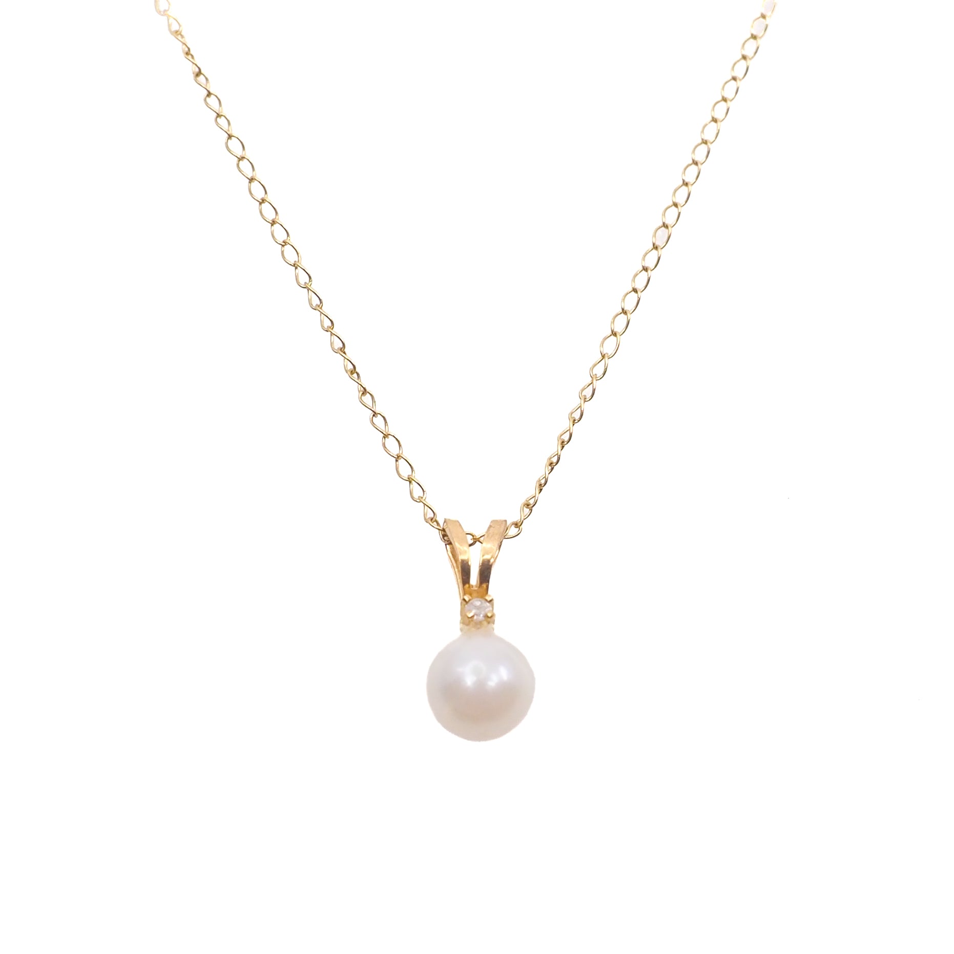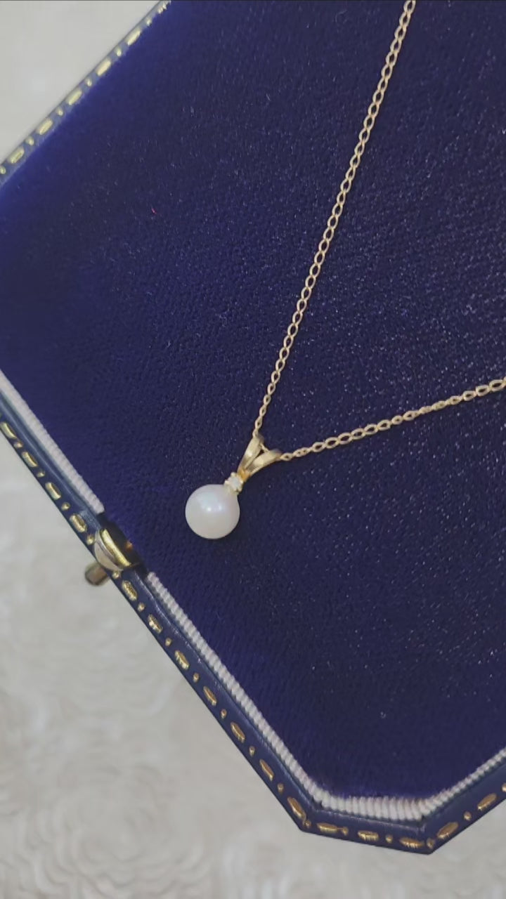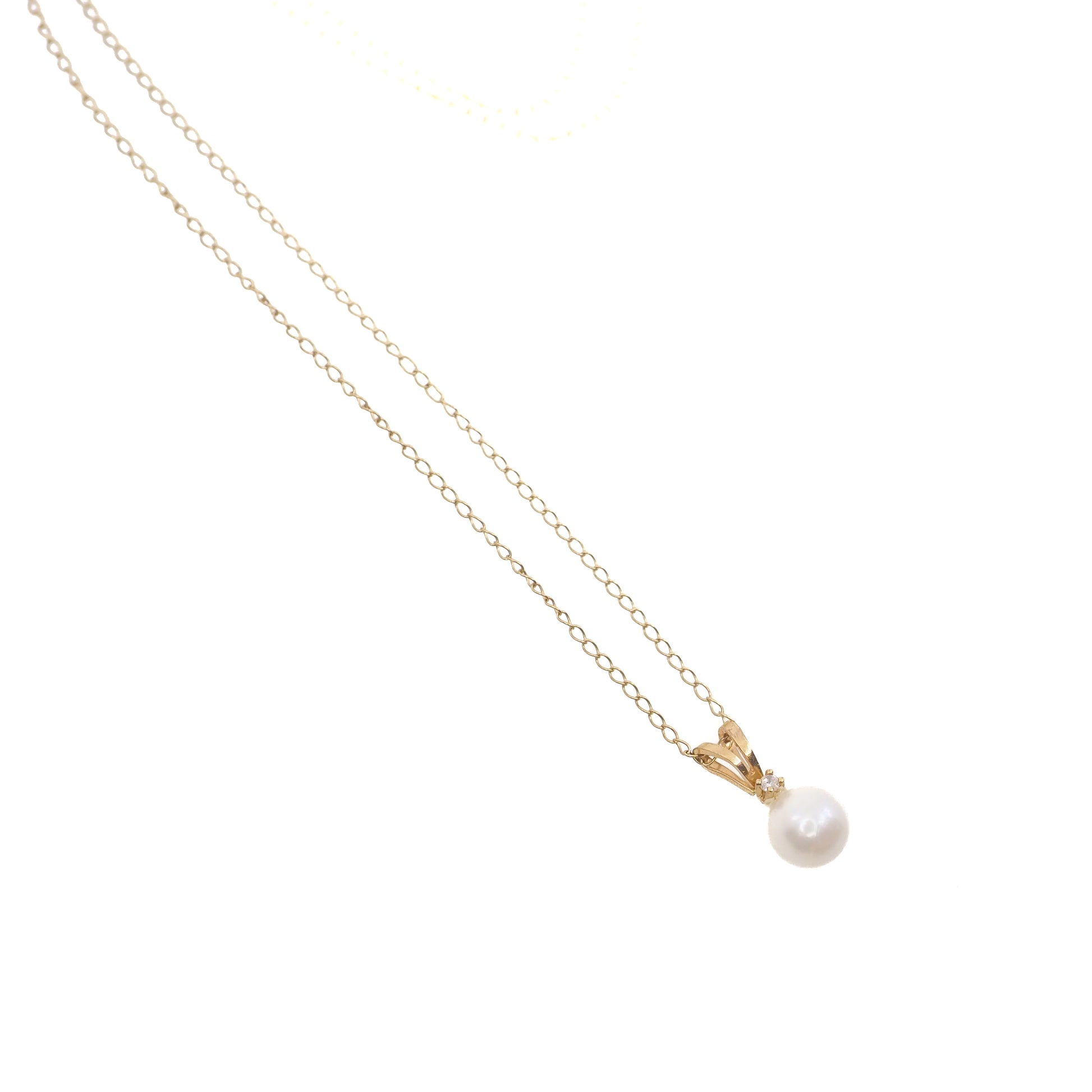 This simple and elegant necklace features a round cultured Japanese Akoya pearl set on a yellow gold bail, accented with a small single-cut diamond. The cultured pearl has a subtle pink overtone and a beautiful orient. Perfect necklace for your vintage collection!
