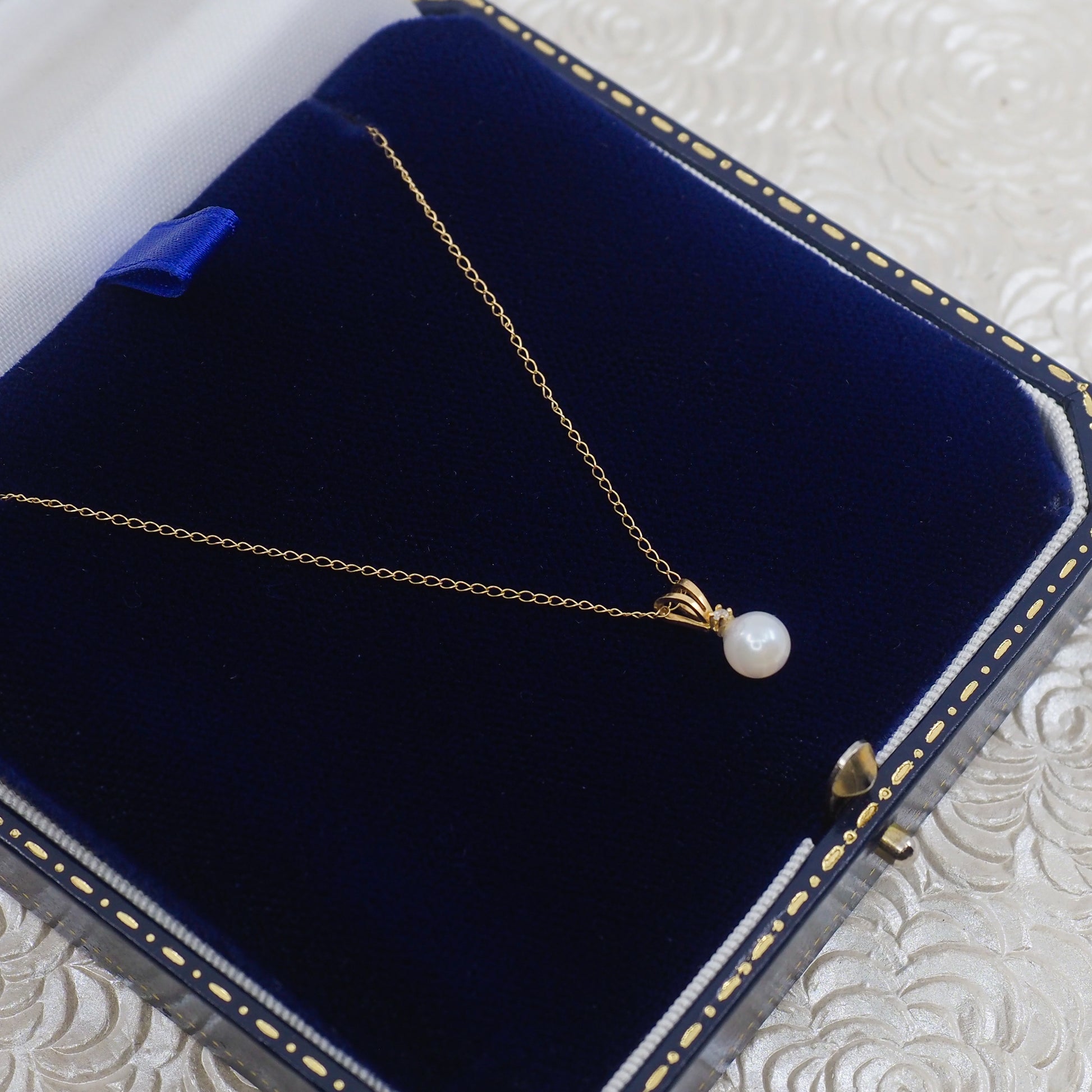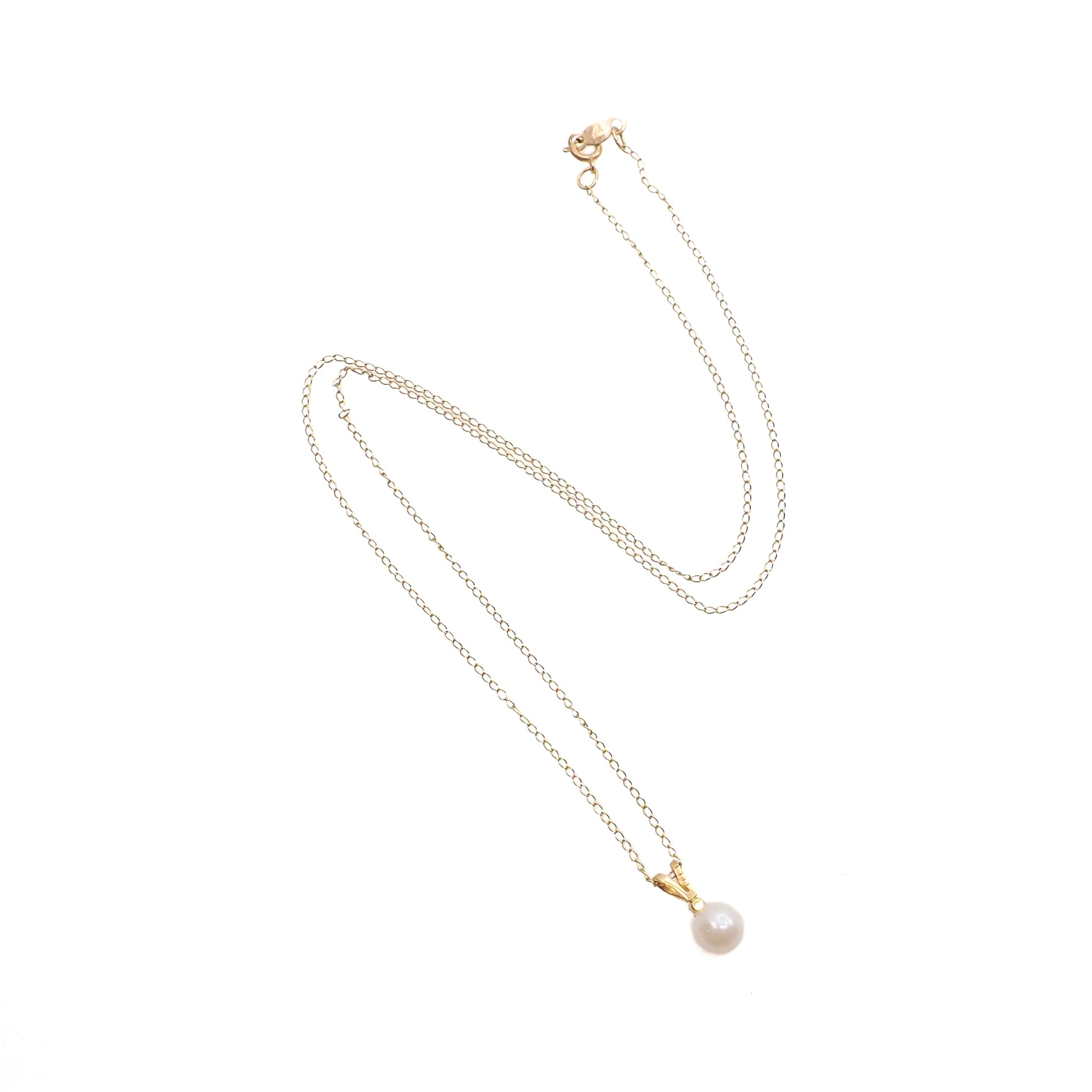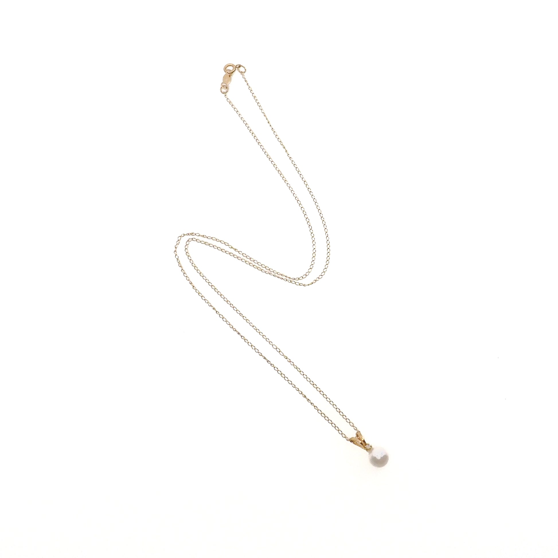 This simple and elegant necklace features a round cultured Japanese Akoya pearl set on a yellow gold bail, accented with a small single-cut diamond. The cultured pearl has a subtle pink overtone and a beautiful orient. Perfect necklace for your vintage collection!